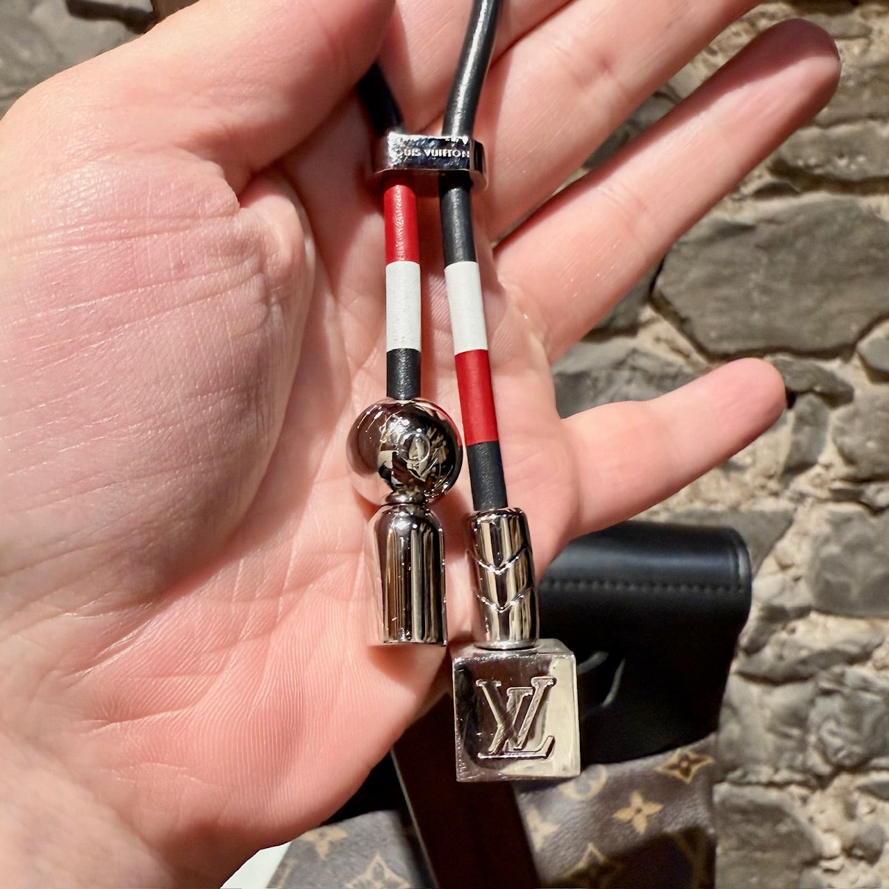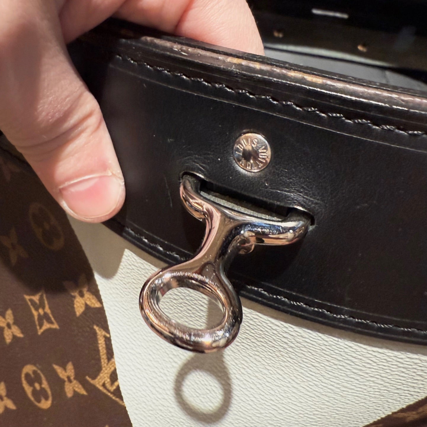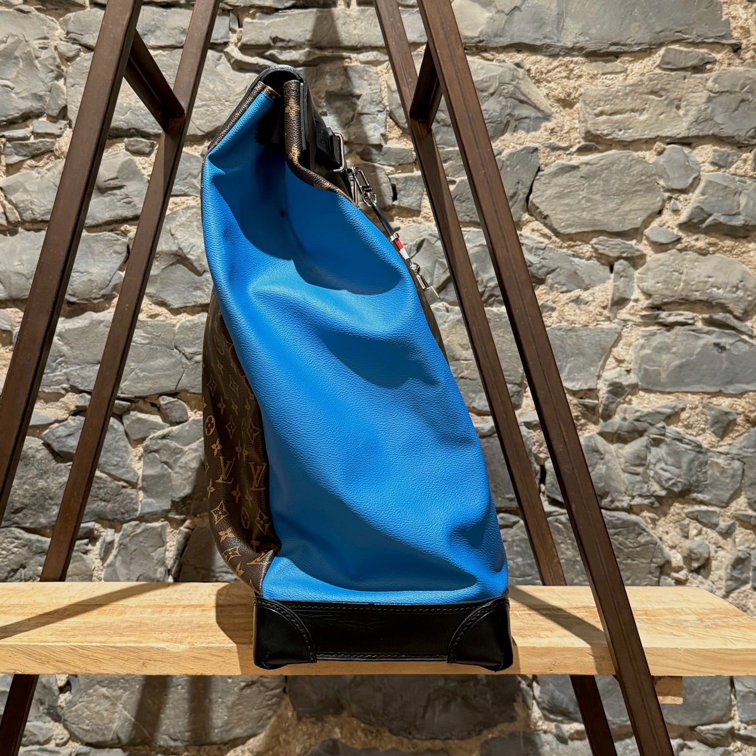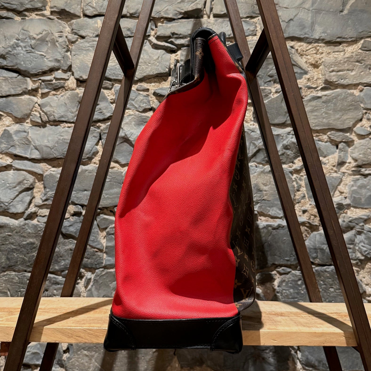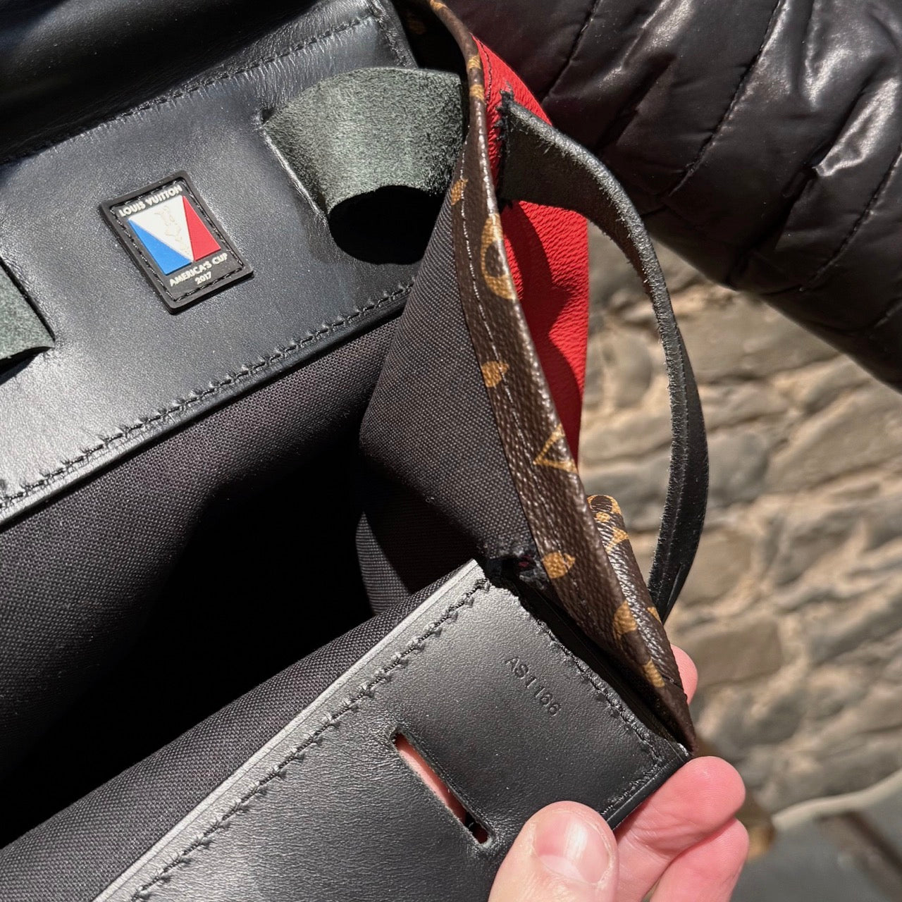 Sac Steamer en édition limitée issu de la collaboration Louis Vuitton America’s Cup 2017. Design Steamer structuré de grand format. Sac de voyage. Quincaillerie argentée. Toile enduite Monogram avec panneaux peints tricolores inspirés de la palette de l’America’s Cup, en blanc, bleu et rouge. Garnitures en cuir lisse noir sur l’ensemble. Poignée supérieure roulée en cuir noir. Ouverture sur le dessus avec fermeture par sangle et cadenas. Breloque de sac en métal gravée amovible avec attache en cuir tricolore et cordon. Base rigide plate en cuir noir avec renforts de protection aux coins. Intérieur spacieux avec doublure textile noire. Étiquette intérieure en cuir America’s Cup 2017. Fait en France. Livré tel quel.