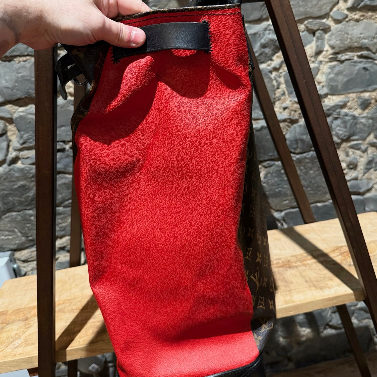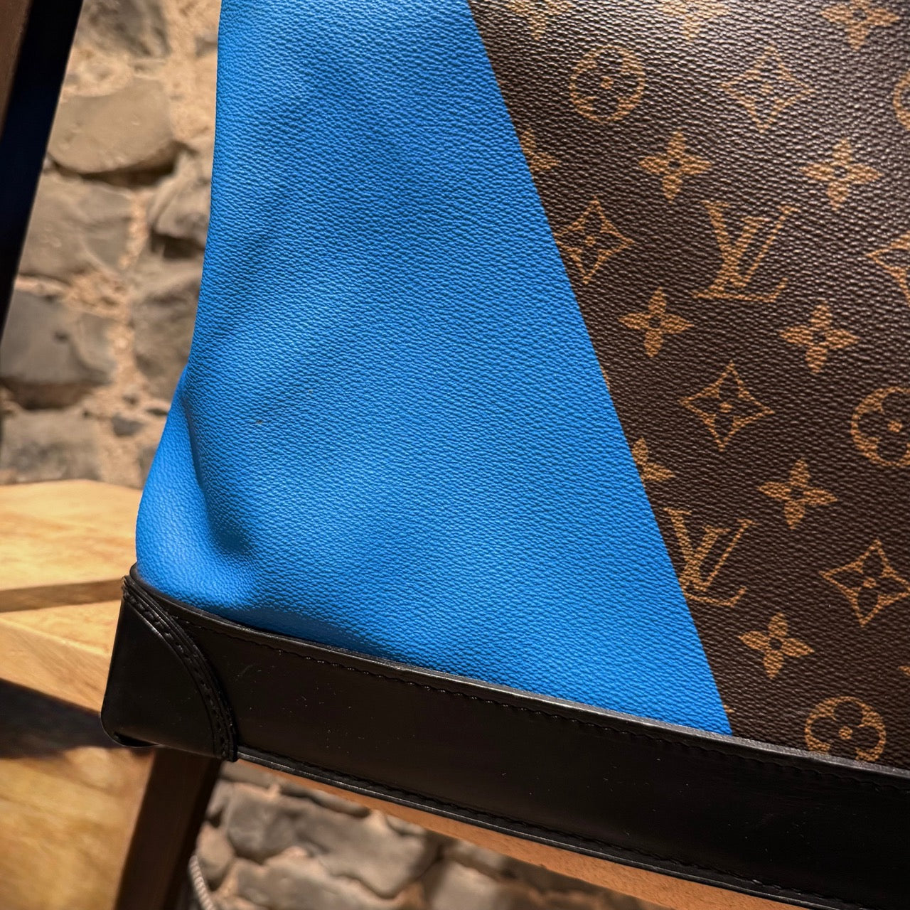 Particularité de cette pièce : les plis naturels ont entraîné une usure partielle de la peinture sur les panneaux tricolores, laissant apparaître la base Monogram brune en dessous. Le panneau bleu montre des apparitions visibles du Monogram brun. Le panneau rouge a été partiellement retouché et présente encore de légères apparitions du Monogram brun. Il s’agit d’une particularité liée au vieillissement naturel de cette pièce.