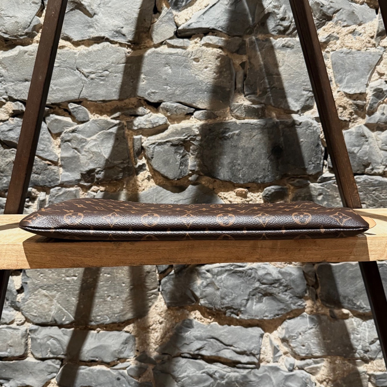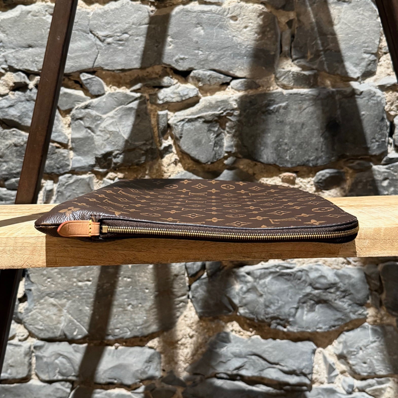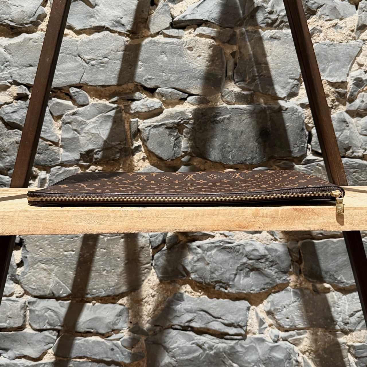 De la collection 2019. Pochette rectangulaire classique en toile enduite avec motif Monogram Louis Vuitton. Fermeture zippée unique avec garniture en métal doré gravée. Intérieur en doublure textile brun avec une poche plate. Détail en cuir au niveau de la fermeture éclair. Fait en France. Livré avec sac poussière, boîte, étiquette et reçu d’origine.