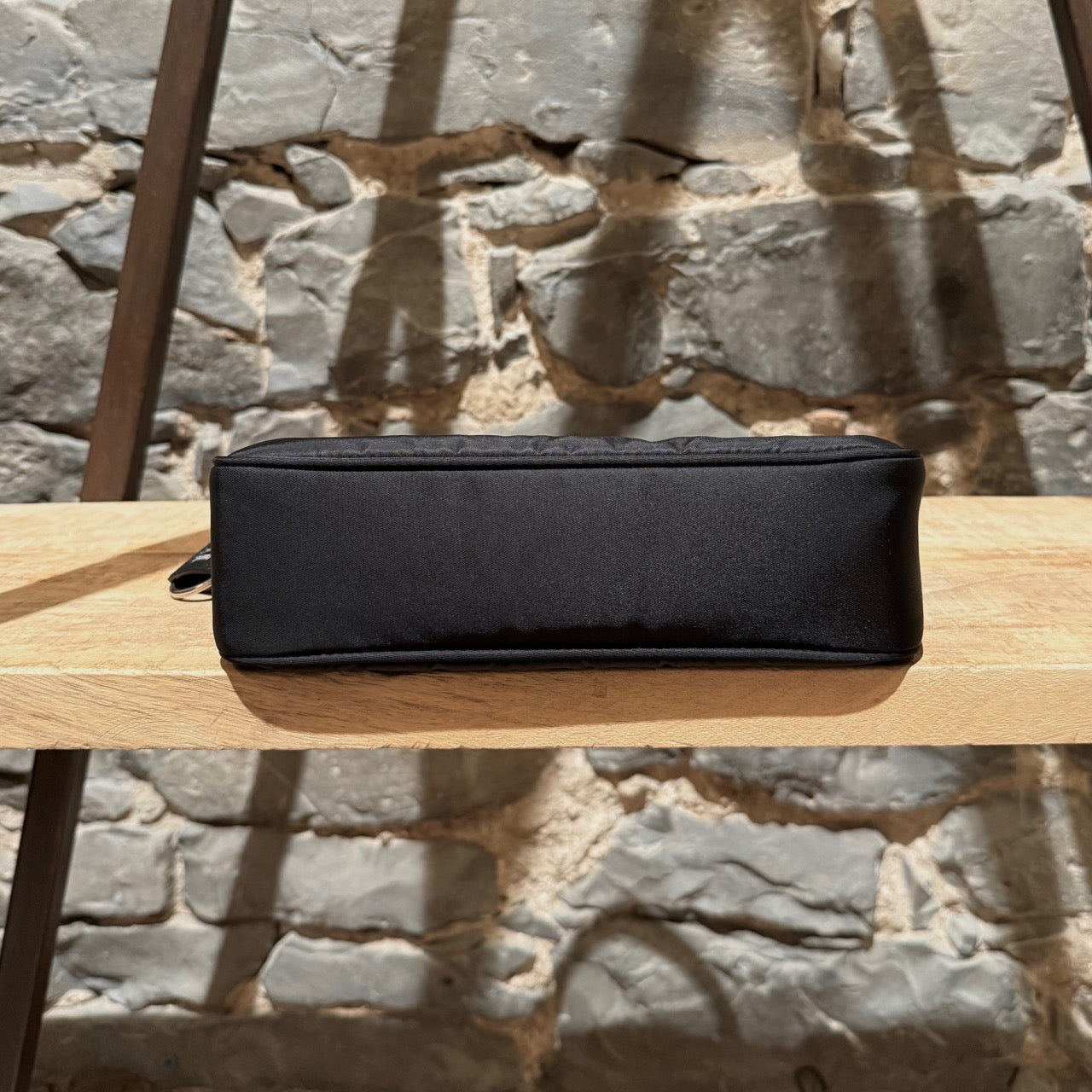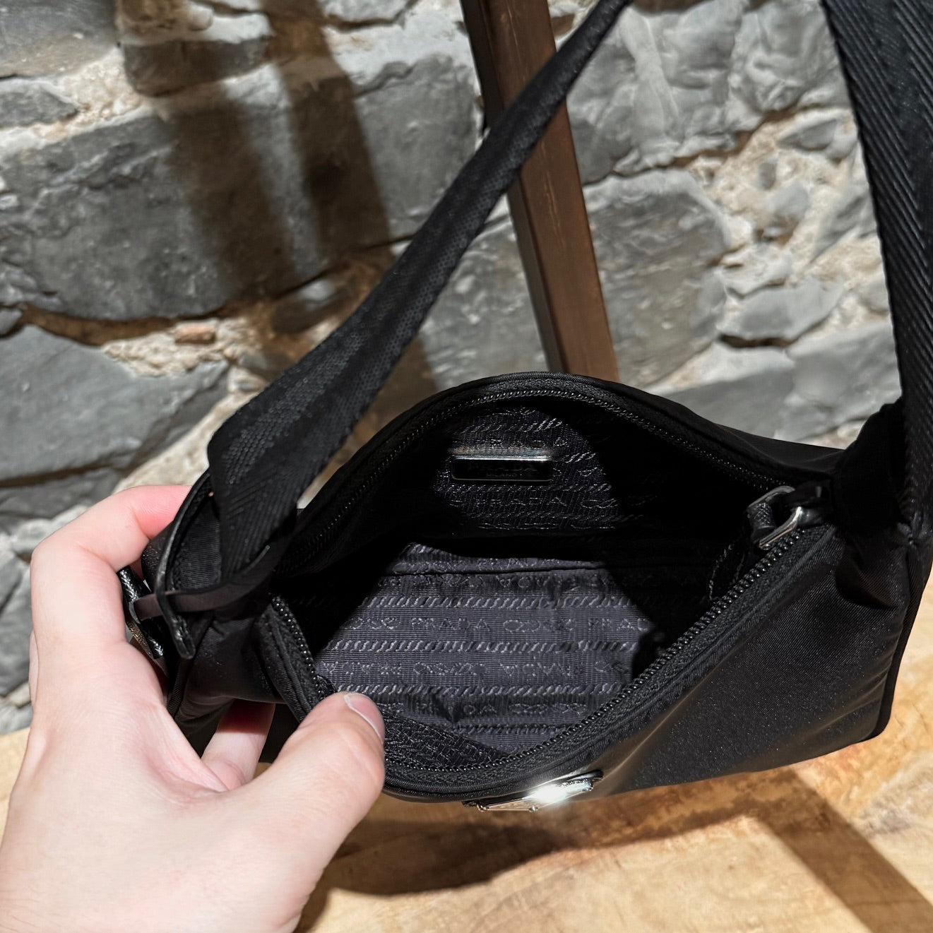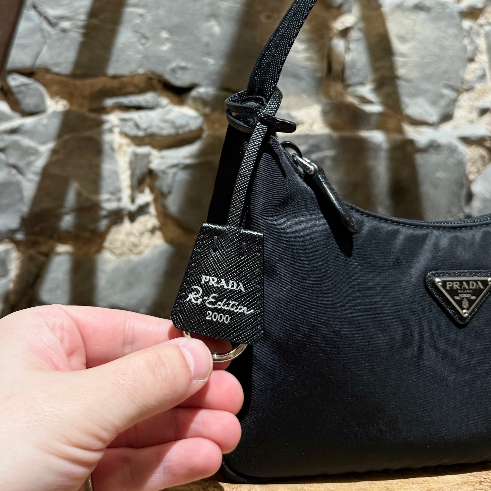Sac Prada Réédition 2000 en nylon Tessuto noir. Sac bandoulière compact en nylon Tessuto noir avec accessoires en cuir Saffiano ton sur ton. Plaque logo Prada triangulaire émaillée sur le devant. Poignée en ruban tissé. Fermeture zippée sur le dessus avec détails argentés. Intérieur doublé en tissu jacquard signature Prada et doté d'une poche plaquée. Fabriqué en Italie. Livré avec son porte-clés en cuir d'origine.
