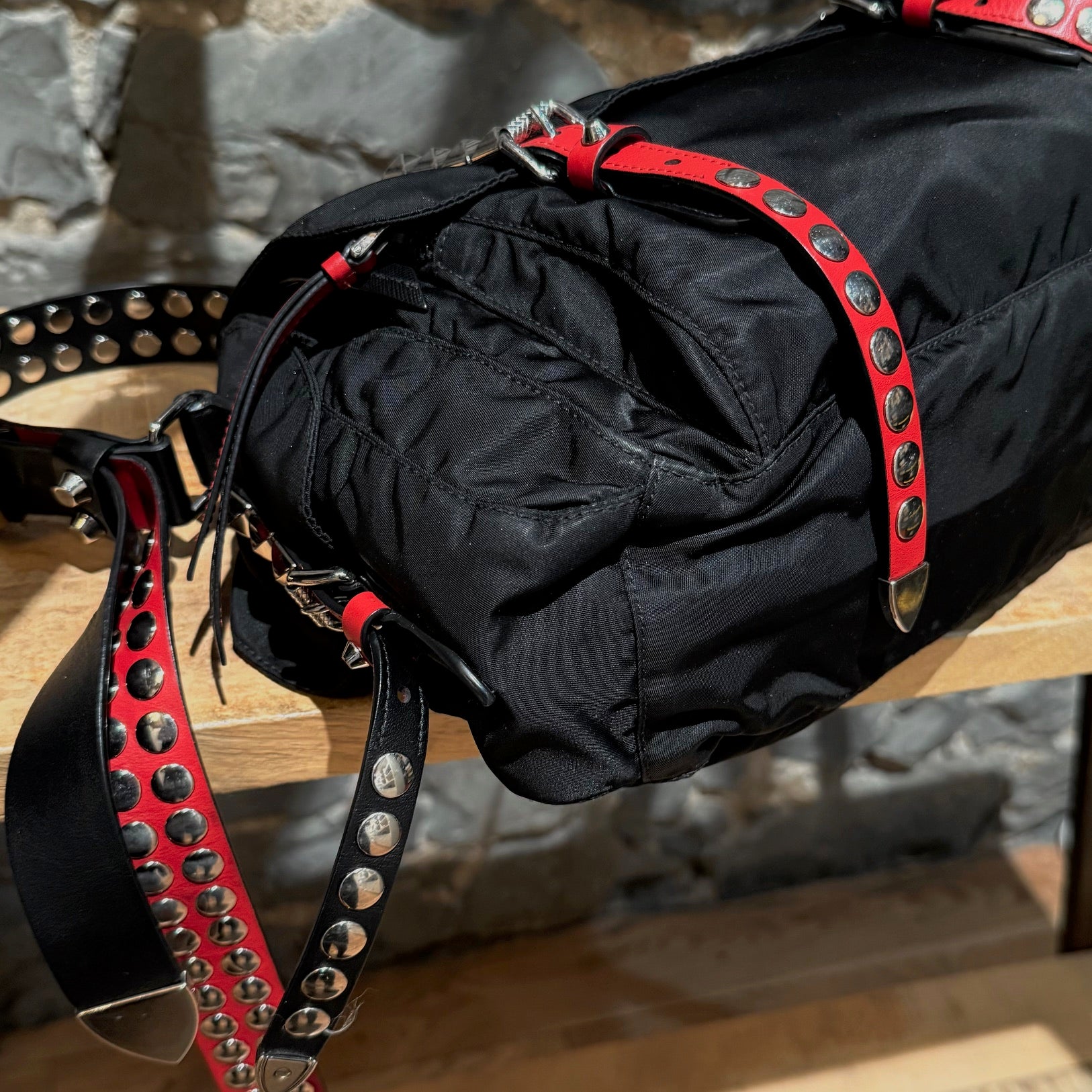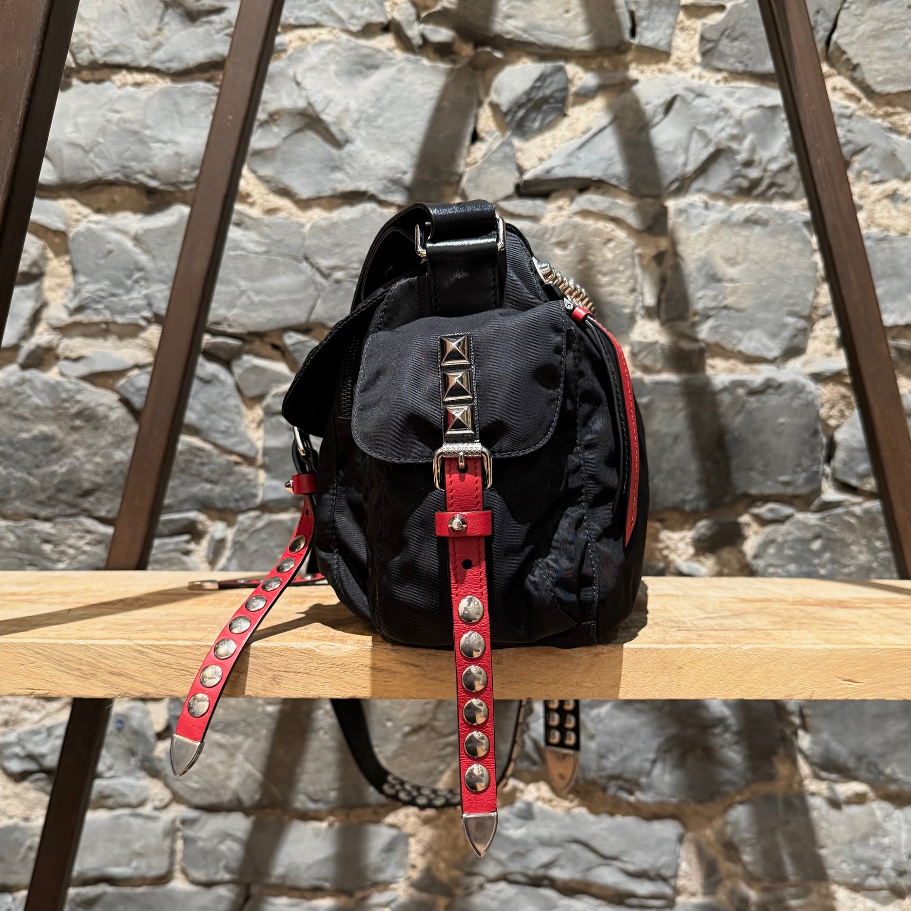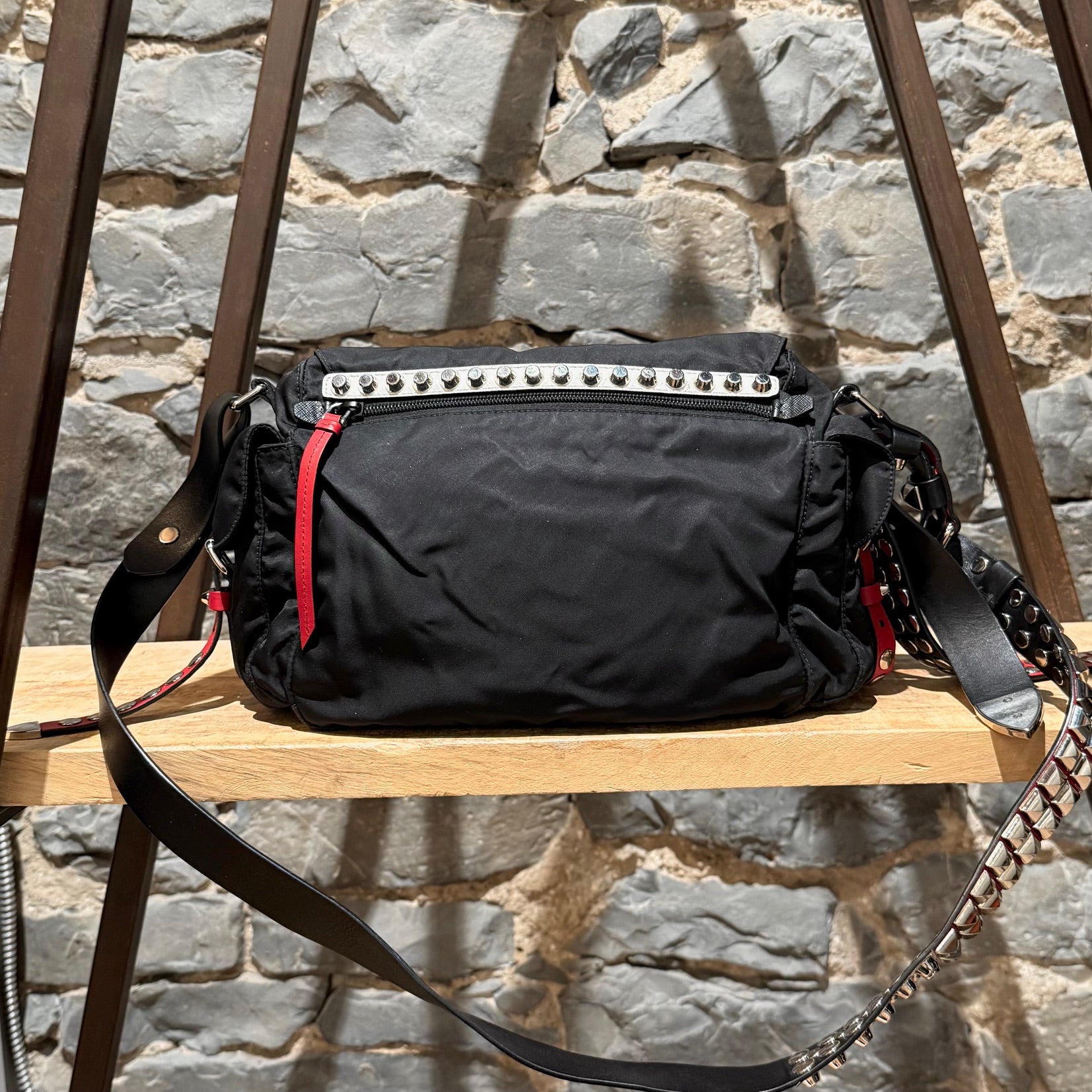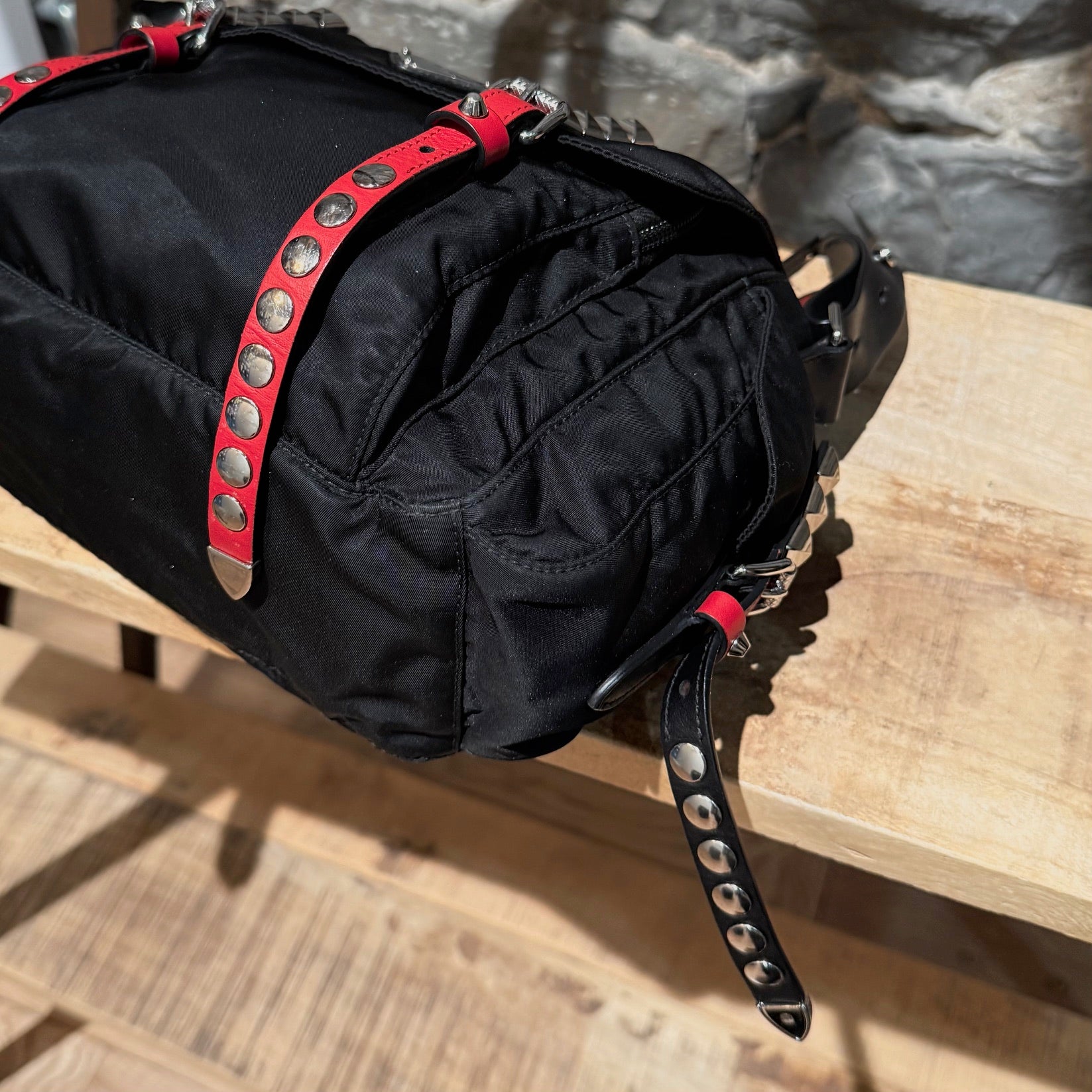 Collection 2018. Silhouette rectangulaire souple en nylon Vela tessuto noir avec quincaillerie argentée. Style inspiré du punk. Présence uniforme de brides en cuir noir et rouge garnies de clous, combinant clous ronds, pyramides et embouts métalliques pointus. Empiècements en cuir Saffiano. Courroie d’épaule ajustable en cuir rouge, noir et blanc. Rabat avant muni du logo triangle émaillé Prada et de deux (2) brides à boucle. Compartiment principal à glissière au-dessus et poche avant à glissière. Poche arrière à glissière. Deux (2) poches latérales avec rabat, bouton-pression et boucle. Intérieur doublé de tissu jacquard à logos Prada noir, doté d’une poche à glissière et d’une poche plaquée. Plaque intérieure du logo. Fait en Italie. Livré tel quel.