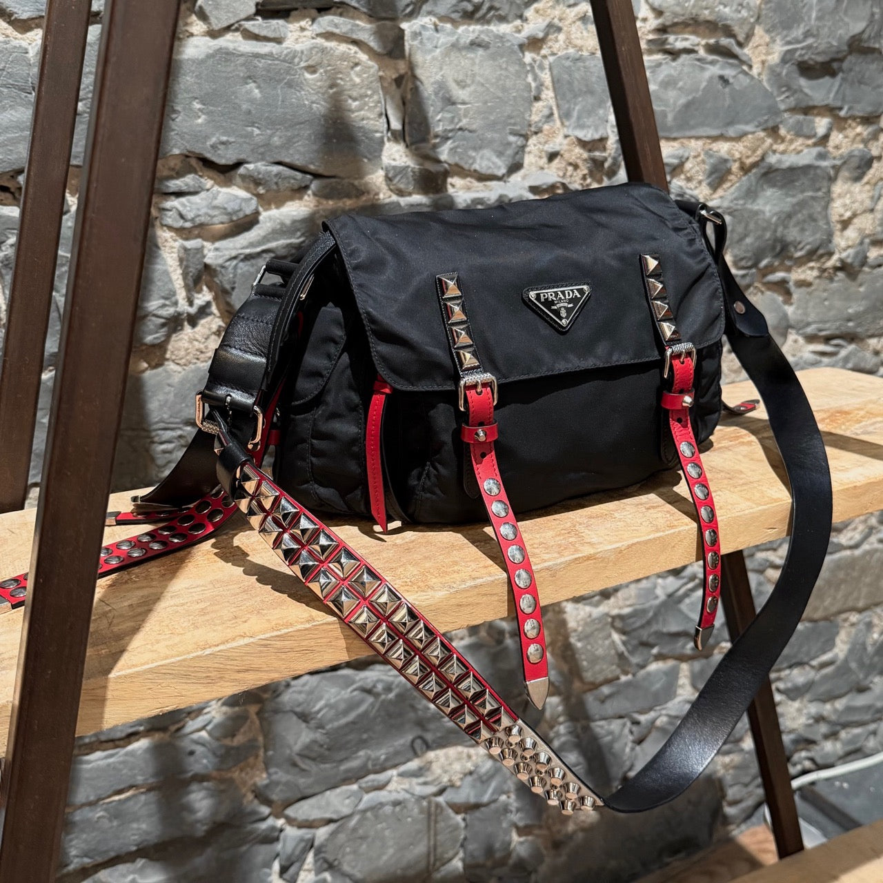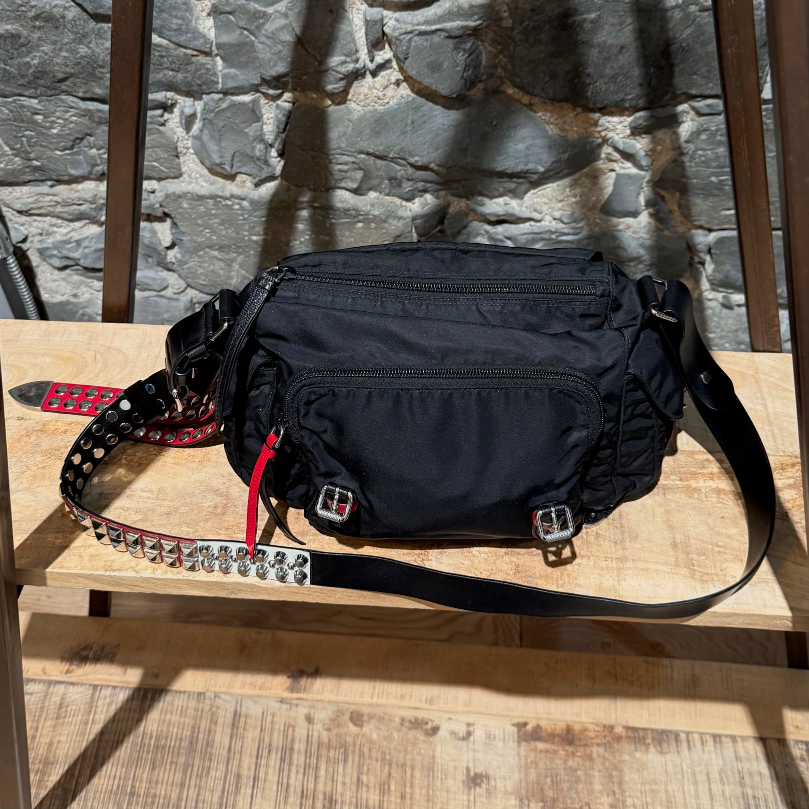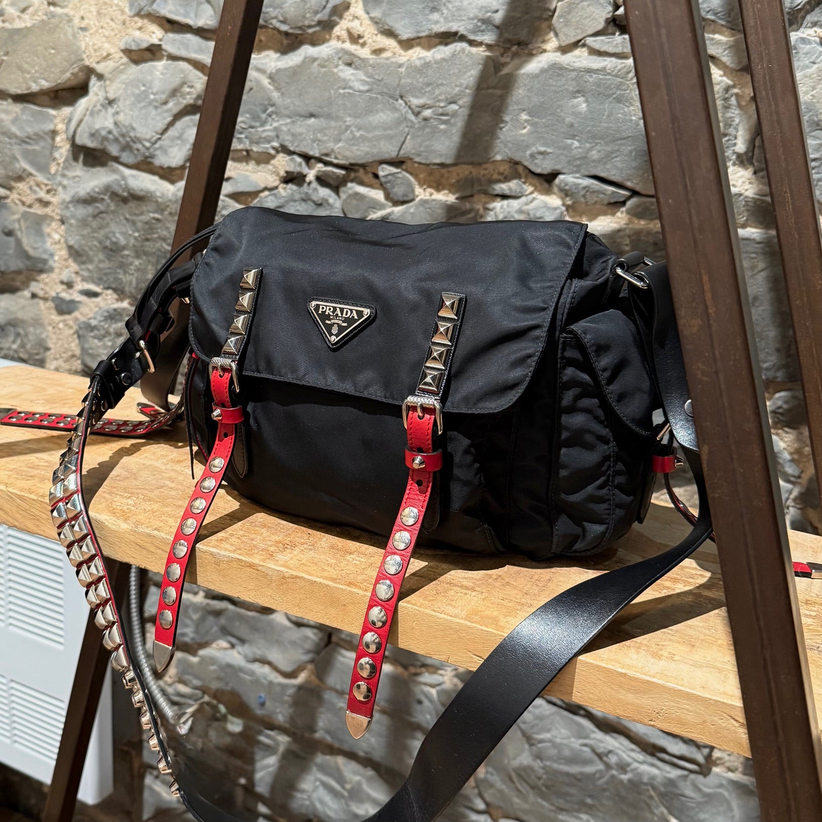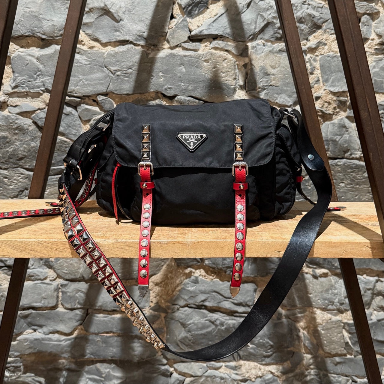 Collection 2018. Silhouette rectangulaire souple en nylon Vela tessuto noir avec quincaillerie argentée. Style inspiré du punk. Présence uniforme de brides en cuir noir et rouge garnies de clous, combinant clous ronds, pyramides et embouts métalliques pointus. Empiècements en cuir Saffiano. Courroie d’épaule ajustable en cuir rouge, noir et blanc. Rabat avant muni du logo triangle émaillé Prada et de deux (2) brides à boucle. Compartiment principal à glissière au-dessus et poche avant à glissière. Poche arrière à glissière. Deux (2) poches latérales avec rabat, bouton-pression et boucle. Intérieur doublé de tissu jacquard à logos Prada noir, doté d’une poche à glissière et d’une poche plaquée. Plaque intérieure du logo. Fait en Italie. Livré tel quel.