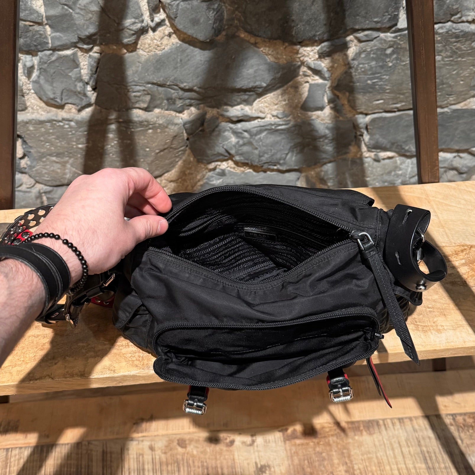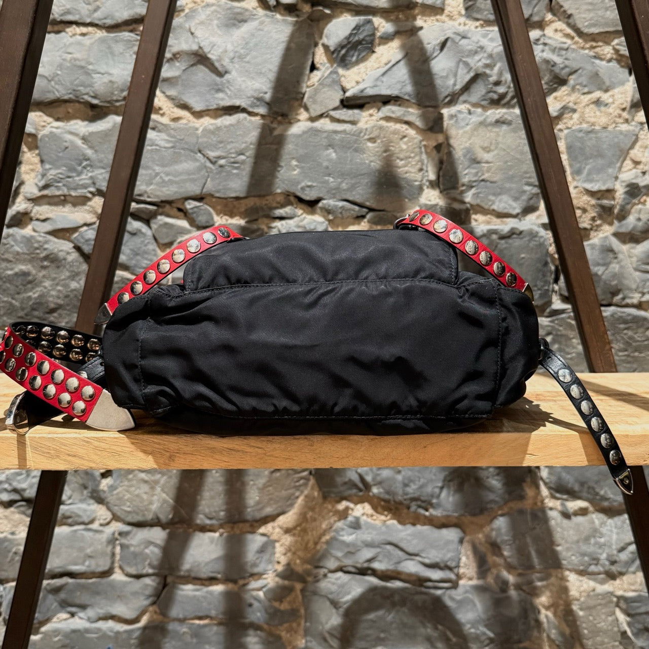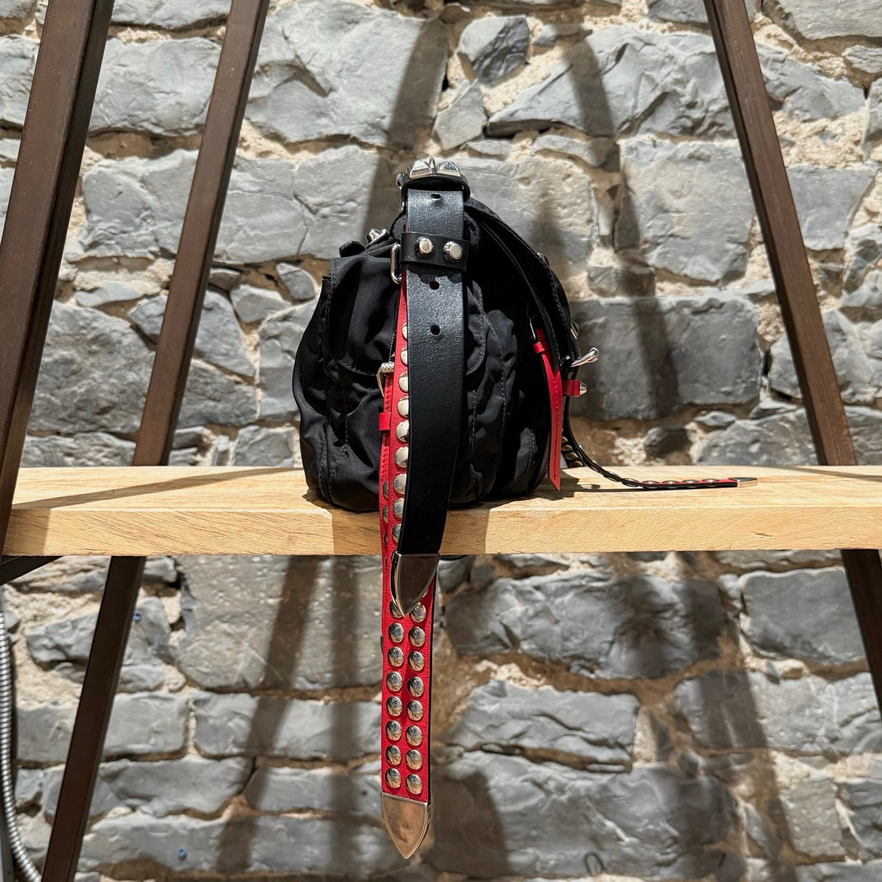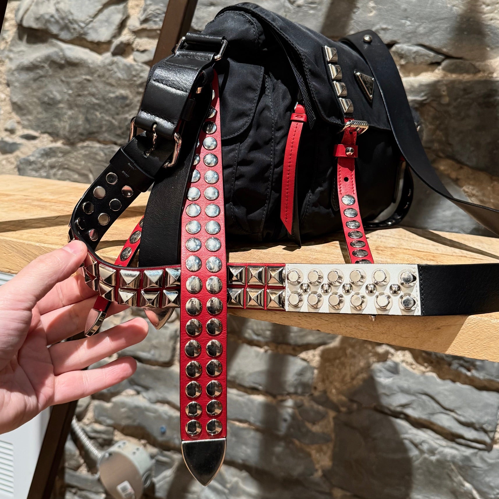 Collection 2018. Silhouette rectangulaire souple en nylon Vela tessuto noir avec quincaillerie argentée. Style inspiré du punk. Présence uniforme de brides en cuir noir et rouge garnies de clous, combinant clous ronds, pyramides et embouts métalliques pointus. Empiècements en cuir Saffiano. Courroie d’épaule ajustable en cuir rouge, noir et blanc. Rabat avant muni du logo triangle émaillé Prada et de deux (2) brides à boucle. Compartiment principal à glissière au-dessus et poche avant à glissière. Poche arrière à glissière. Deux (2) poches latérales avec rabat, bouton-pression et boucle. Intérieur doublé de tissu jacquard à logos Prada noir, doté d’une poche à glissière et d’une poche plaquée. Plaque intérieure du logo. Fait en Italie. Livré tel quel.