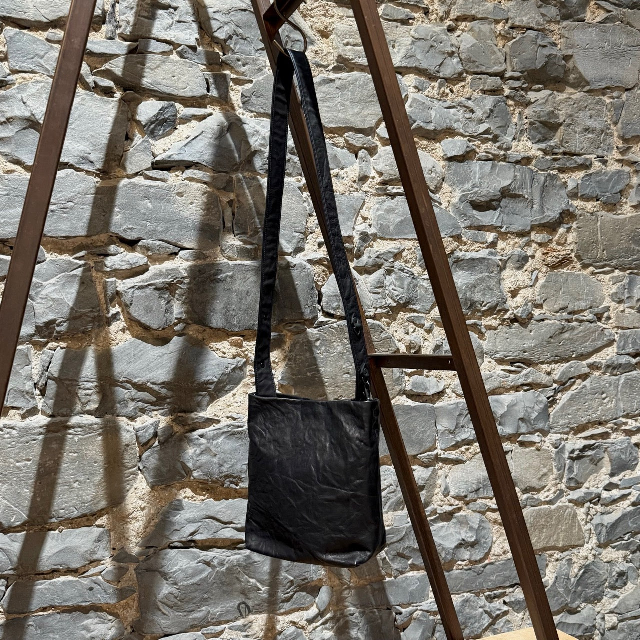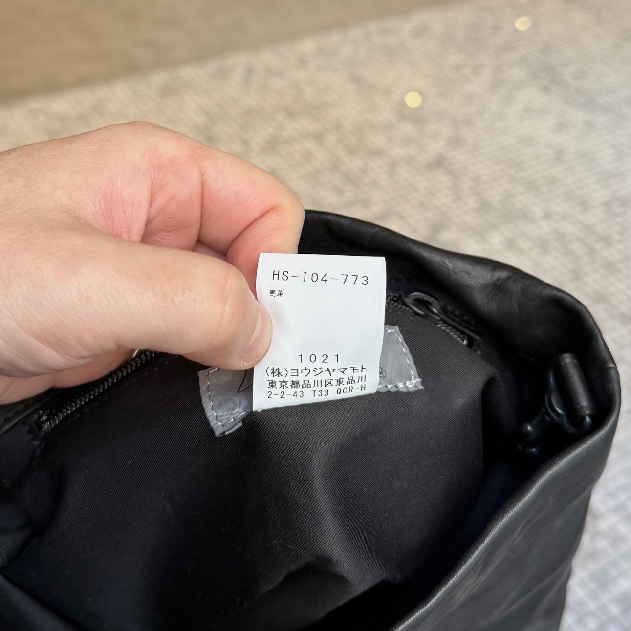Cuir de cheval véritable et souple avec une finition froissée. Base plate. Design minimaliste. Bandoulière en cuir détachable et ajustable avec passants et rivets décoratifs. Ouverture supérieure avec fermeture à bouton-pression. Poche intérieure zippée avec tirette siglée Yohji Yamamoto. Doublure en tissu noir. Fait au Japon. Livré avec son sac poussière Yohji Yamamoto d’origine.