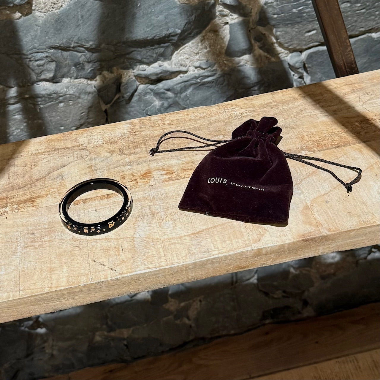 Collection 2013. Jonc en résine noire et résine transparente laquée avec motifs LV Monogram incrustés dorés et argentés, fleurs et clous tout autour. Structure arrondie solide. Version mince. Fait en Italie. Livré avec pochette Louis Vuitton en velours.