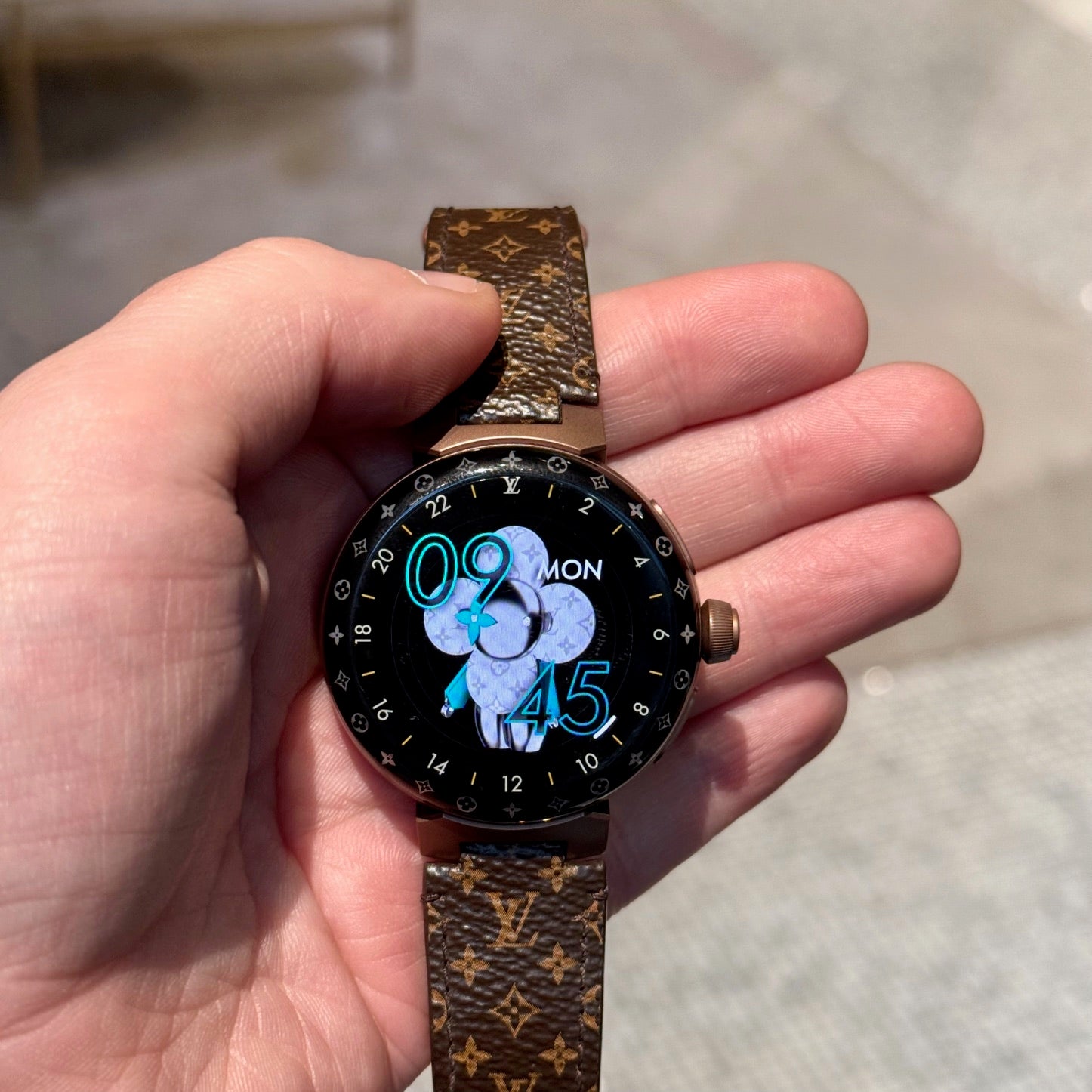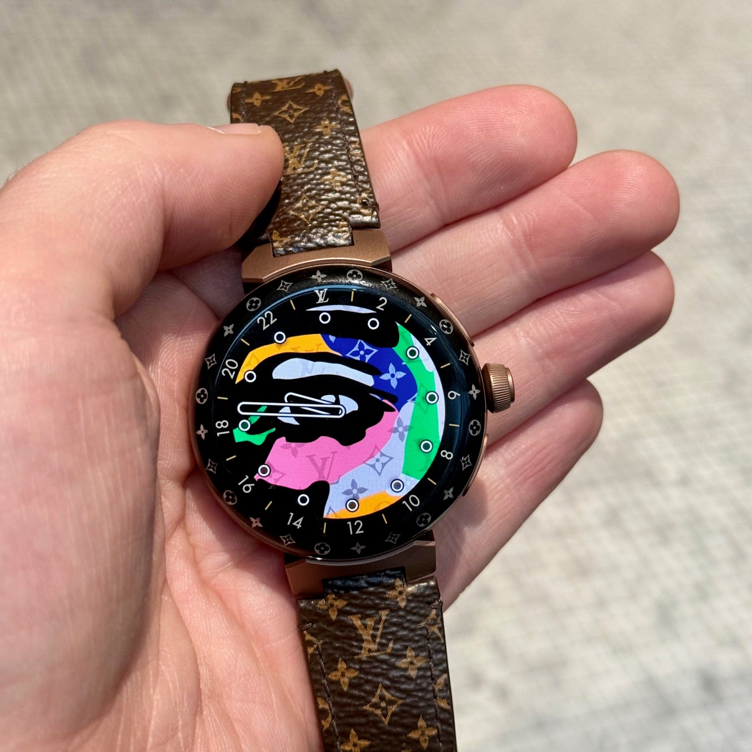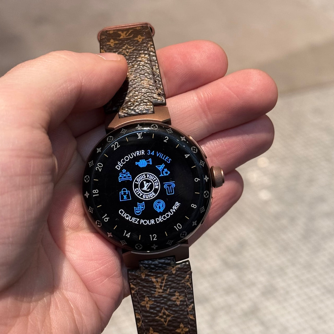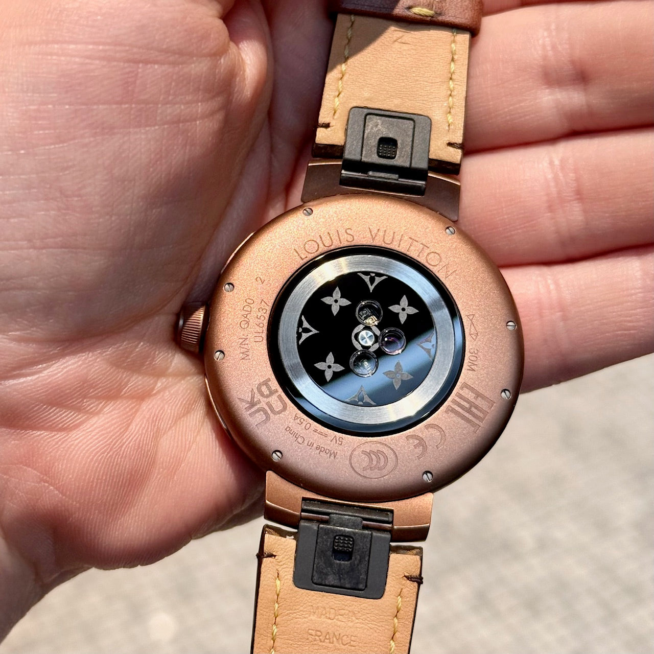 Boîtier Tambour rond avec profil incurvé. Finition en métal ton bronze mat et poli. Écran en cristal de saphir noir. Interface numérique tactile avec plusieurs cadrans animés Louis Vuitton. Anneau LED Monogram Light Up multicolore intégré autour de la lunette. Couronne latérale avec logo LV gravé. Deux (2) poussoirs supplémentaires sur le côté du boîtier. Fonctions intelligentes connectées. Capteur de fréquence cardiaque et capteurs optiques au dos du boîtier. Dos du boîtier gravé Louis Vuitton. Modèle QAD0.