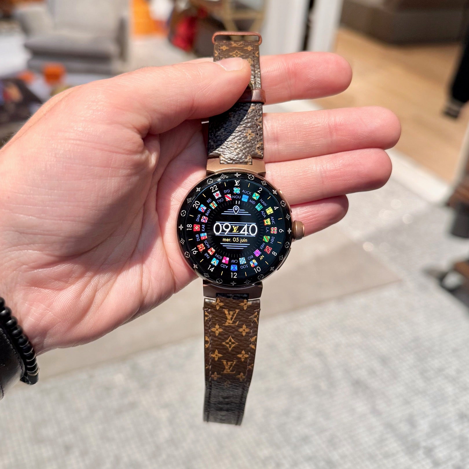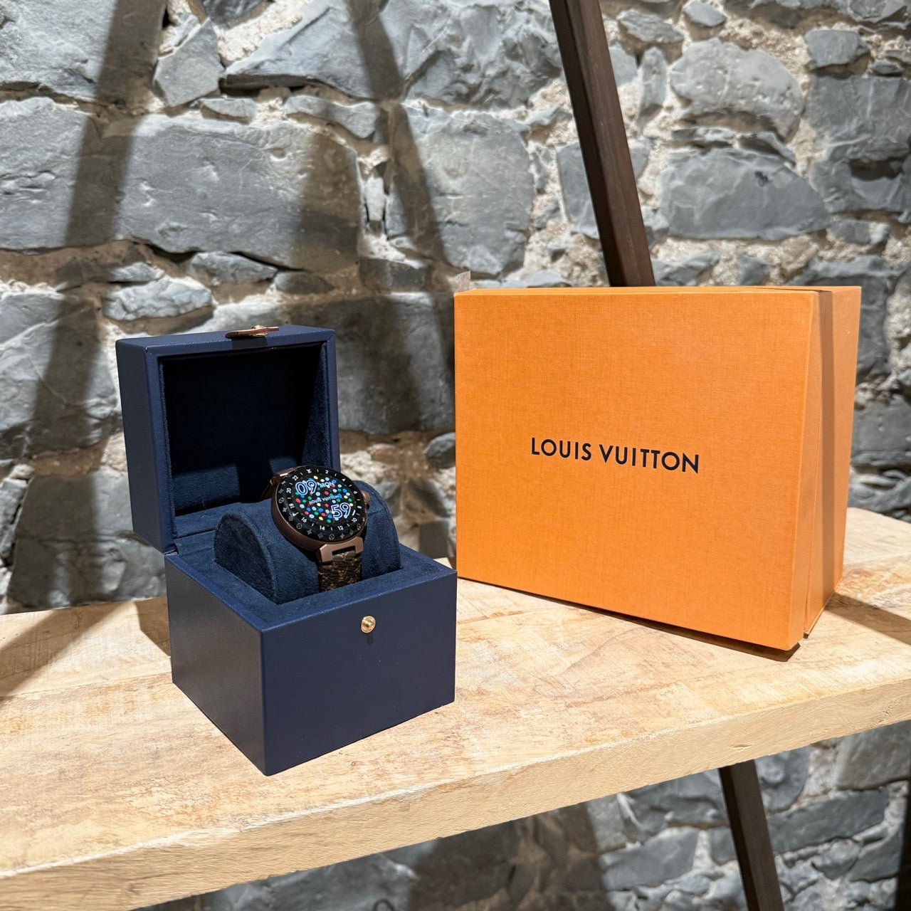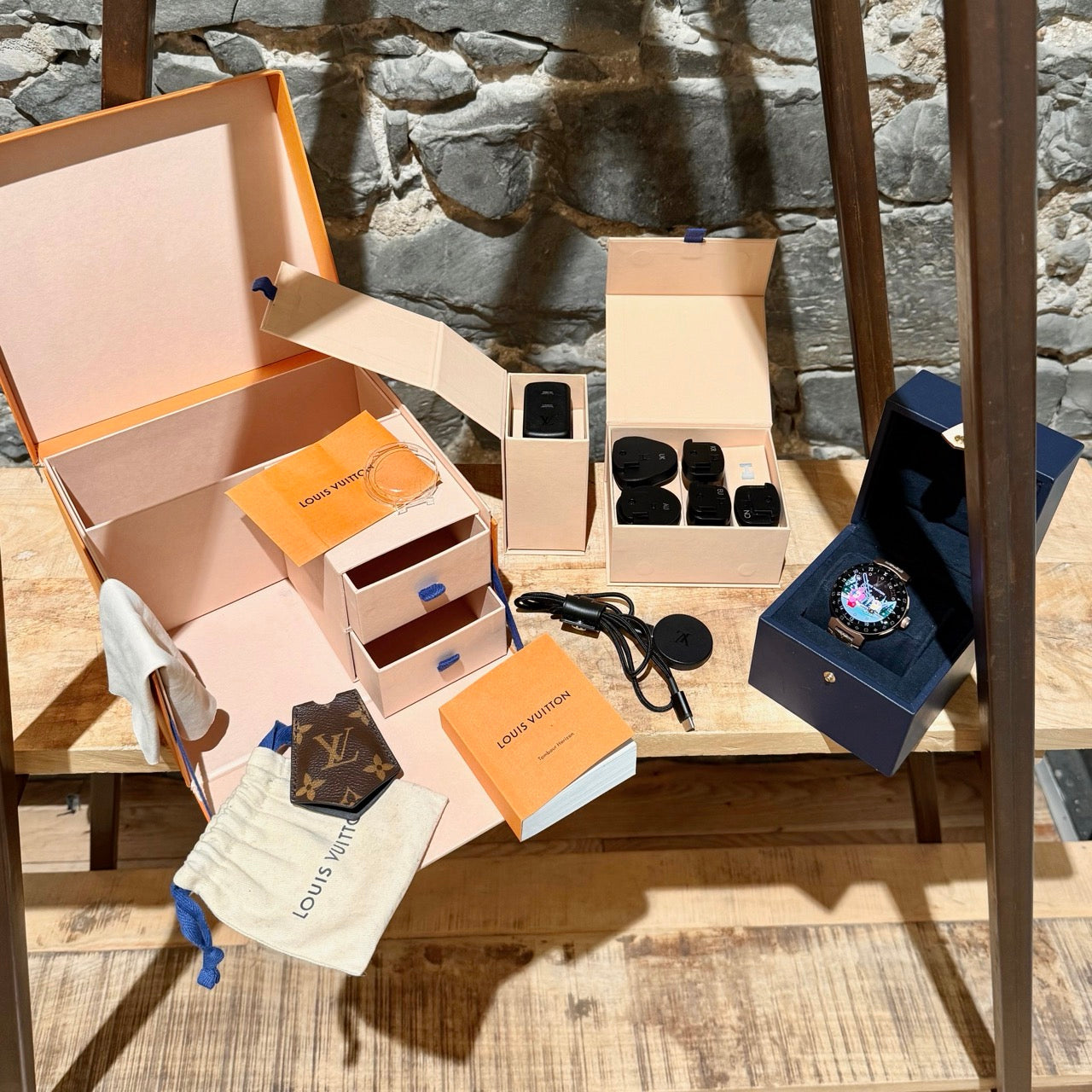 Livrée avec ensemble complet. Boîte de présentation Louis Vuitton. Boîte intérieure pour montre. Câble de recharge, adaptateur secteur et socle de recharge. Livrets et papiers. Sac poussière et accessoires.