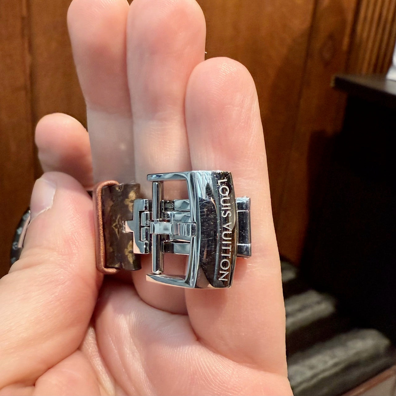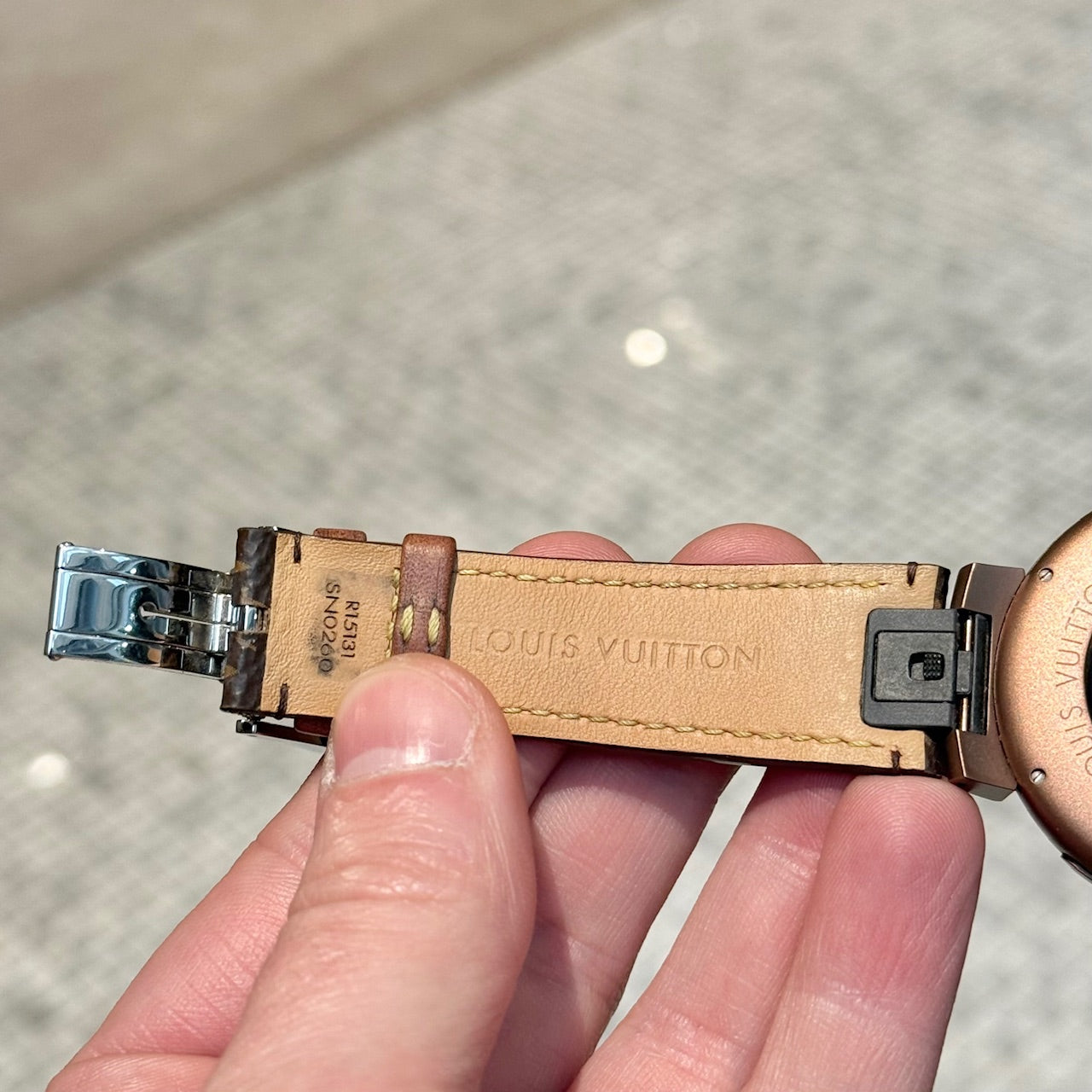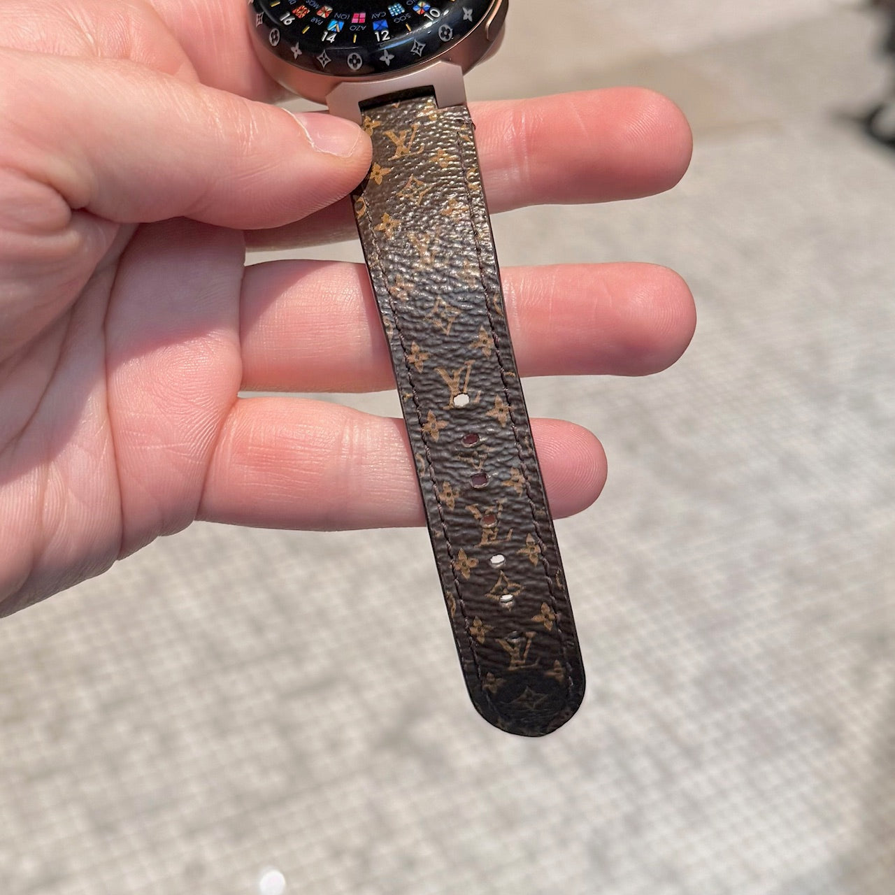 Bracelet en toile enduite Monogram ajustable avec doublure en cuir. Fermoir déployant avec gravure Louis Vuitton. Boîtier de montre fait en Chine. Bracelet fait en France.