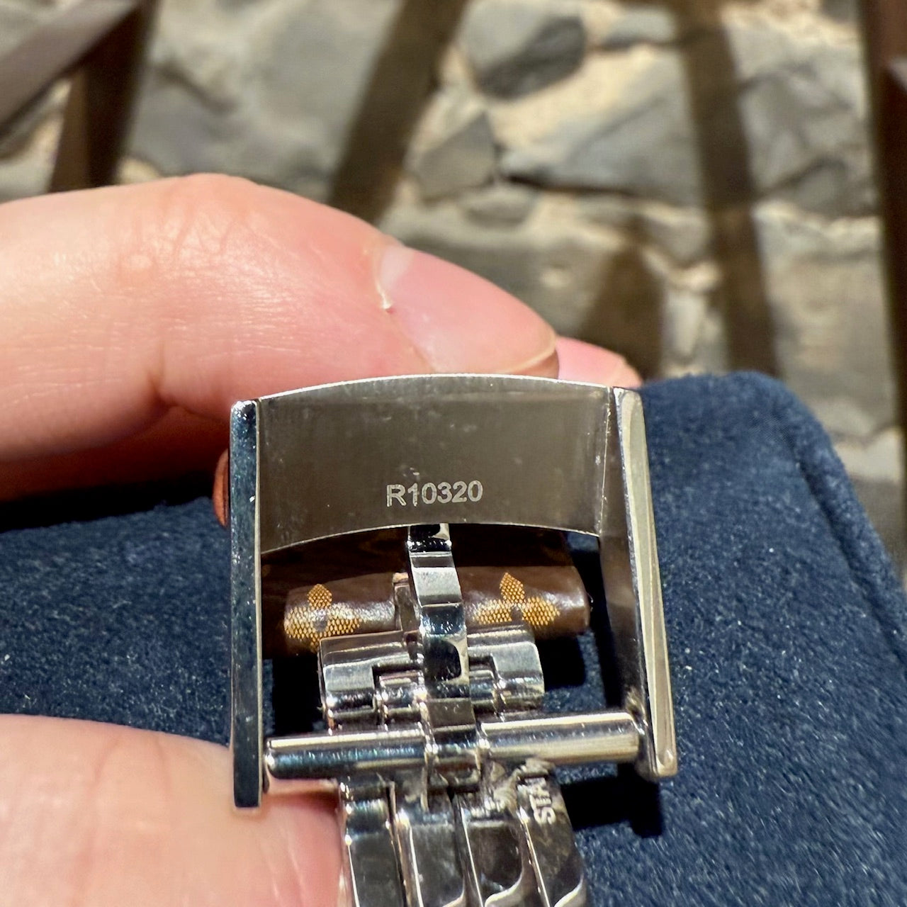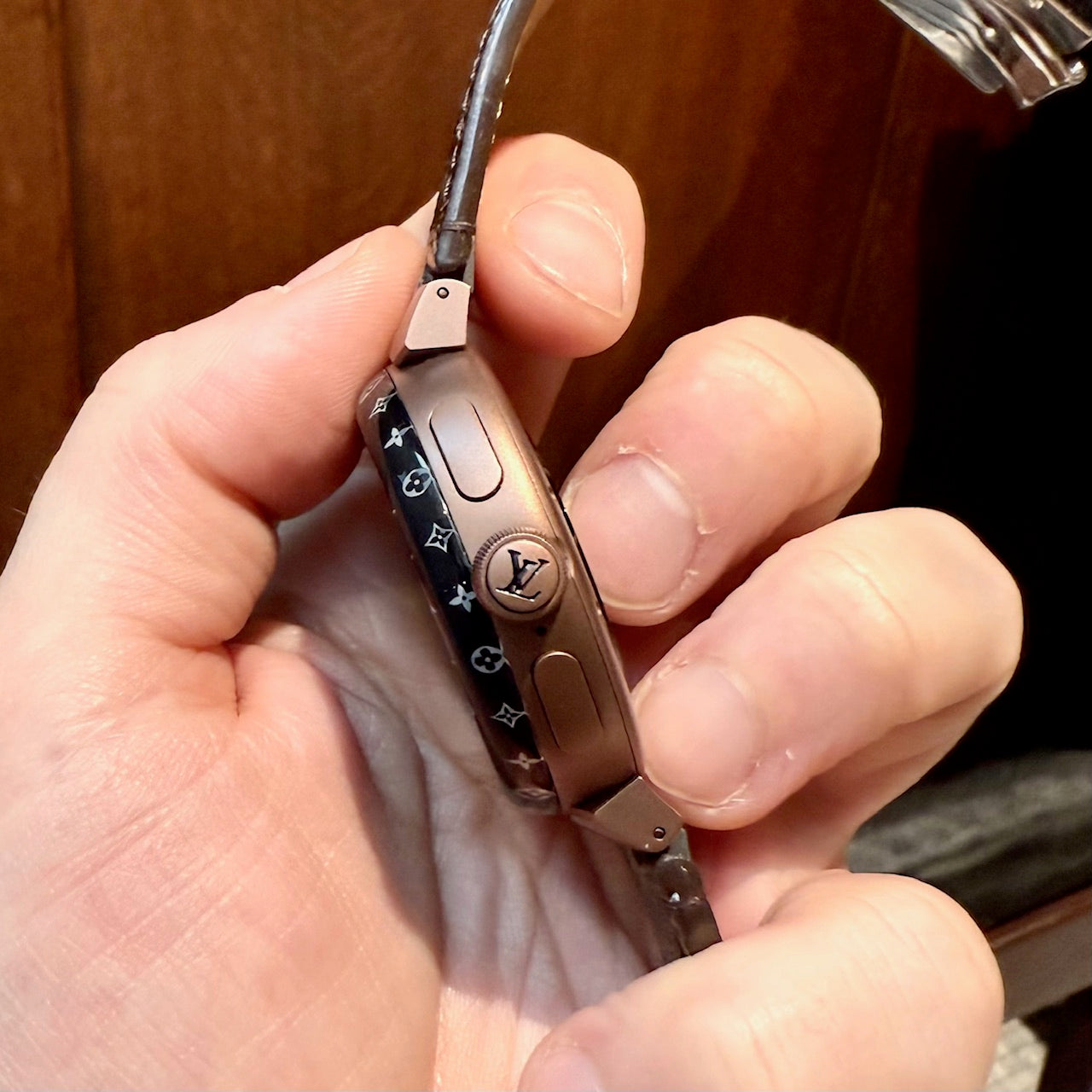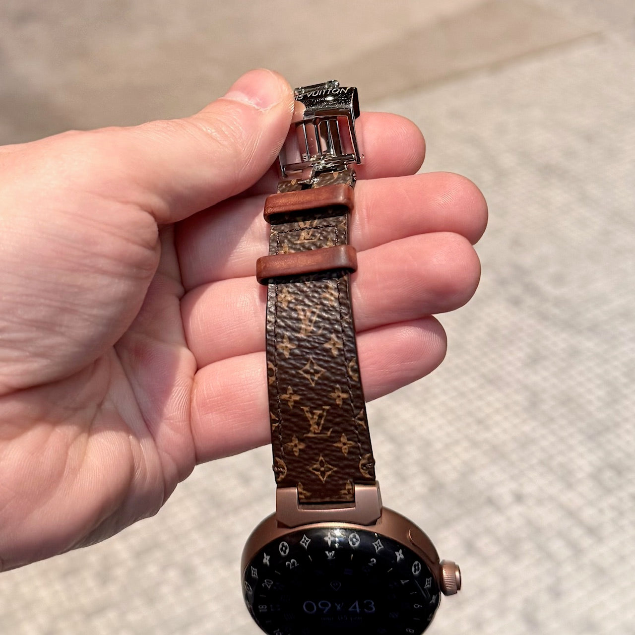 Bracelet en toile enduite Monogram ajustable avec doublure en cuir. Fermoir déployant avec gravure Louis Vuitton. Boîtier de montre fait en Chine. Bracelet fait en France.