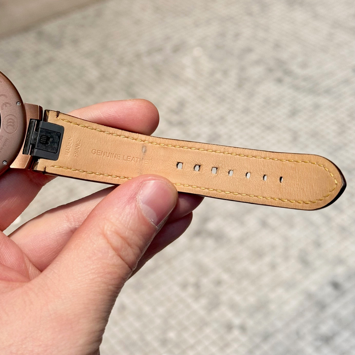 CONDITION: Article d'occasion, en très bon état. Signes d’usure minimes cohérents avec une utilisation soignée. Légers plis et usure sur le bracelet. Légères rayures de surface sur le fermoir. Légère usure sur le boîtier cohérente avec la manipulation. Aucun dommage à l’écran. Aucun défaut visible affectant la fonctionnalité. Veuillez vous référer aux photos et aux mesures. N’hésitez pas à demander des informations supplémentaires avant l’achat.