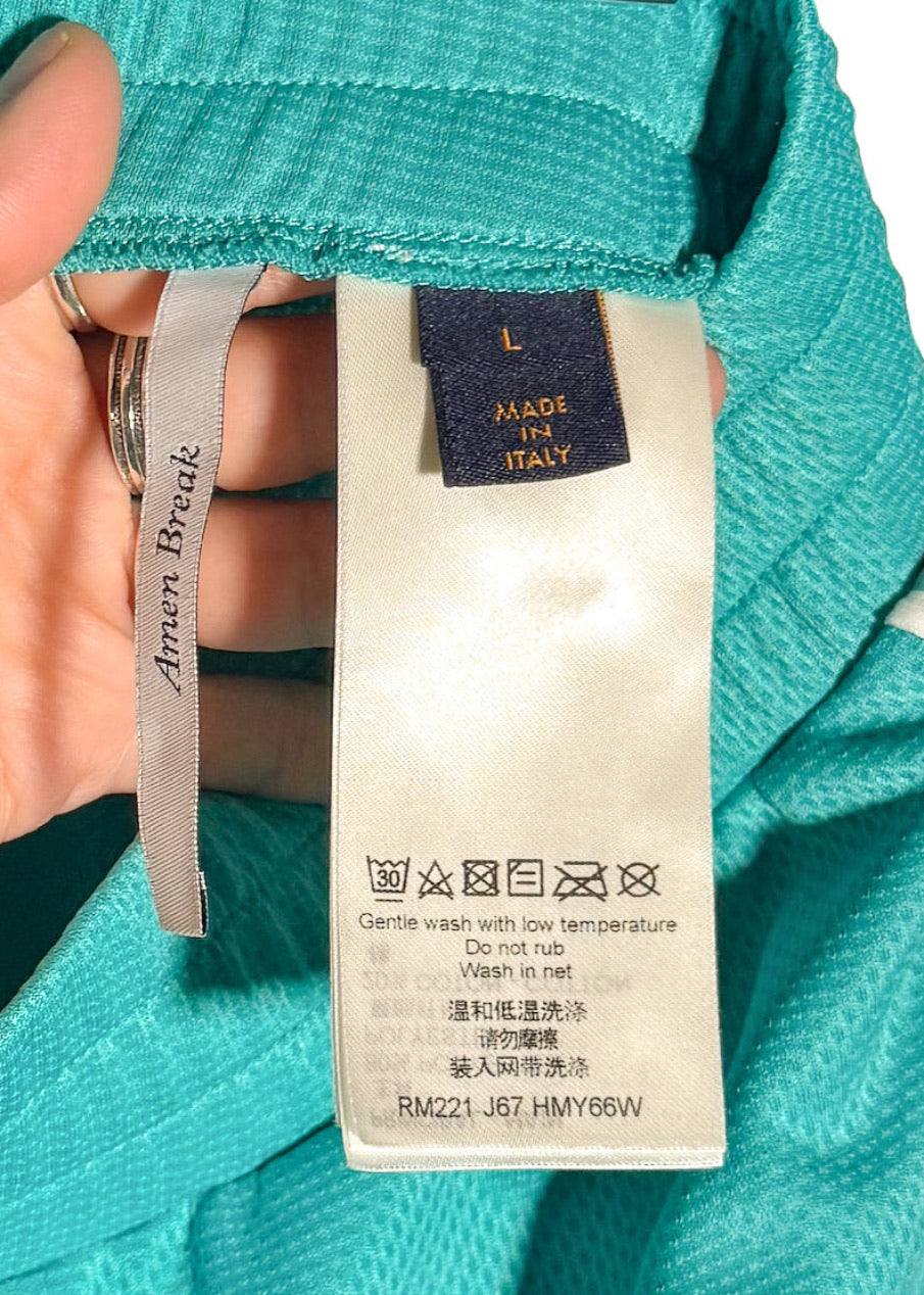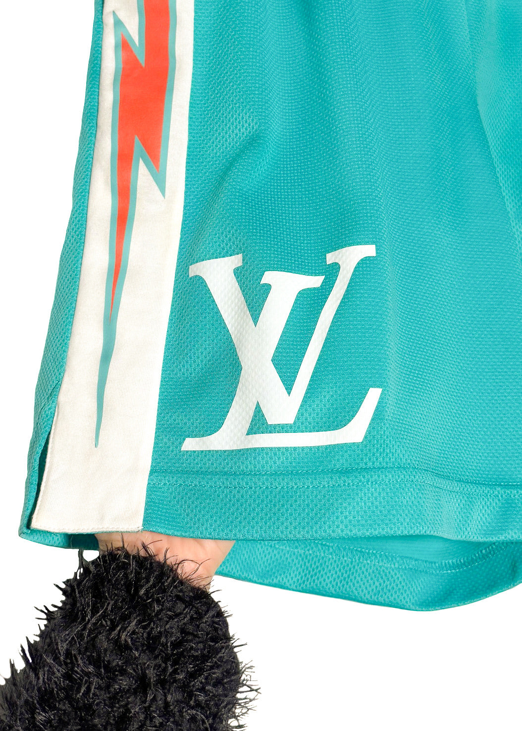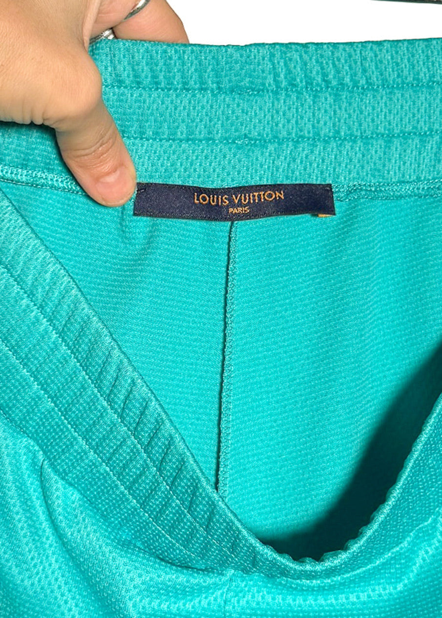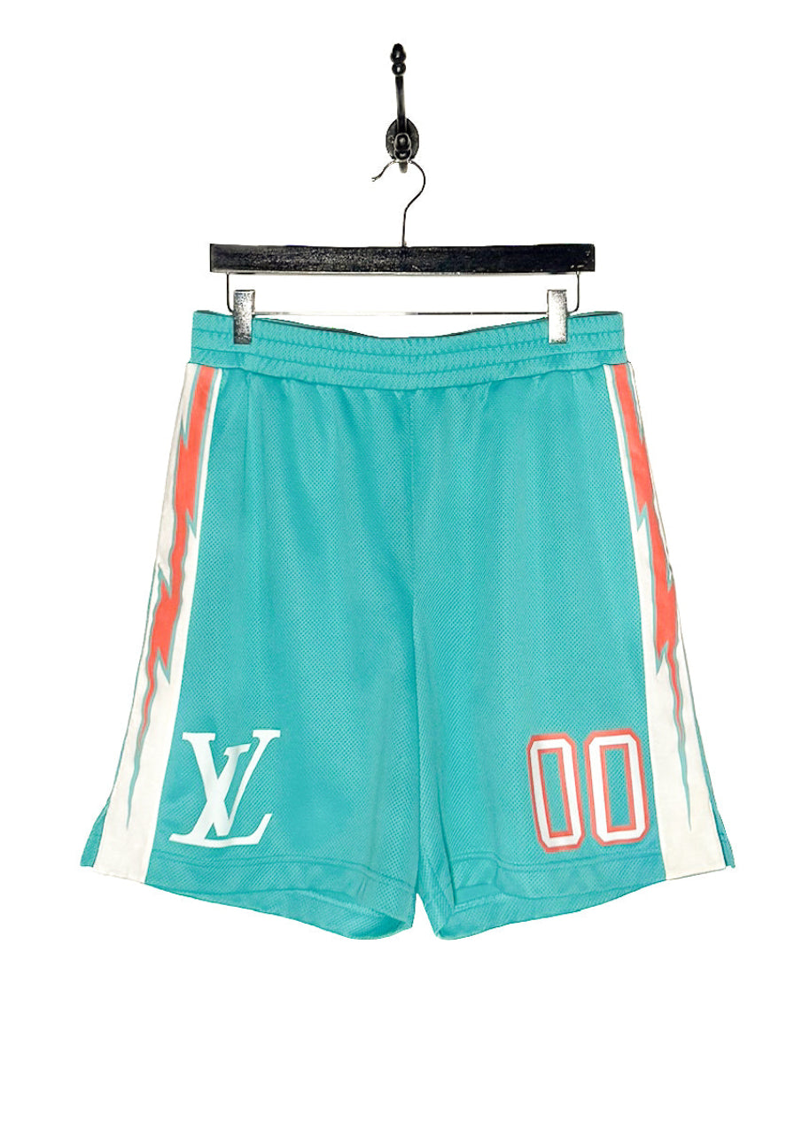 De la collection Printemps Été 2022. Short en maille turquoise respirante à coupe athlétique. Taille élastiquée. Poches latérales fendues. Empiècements latéraux blancs avec imprimé graphique éclair corail. Logo LV blanc et imprimés numériques « 00 » à l’avant. Coupe ample. Fait en Italie.