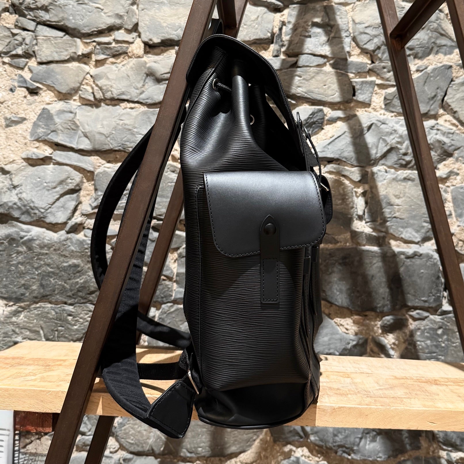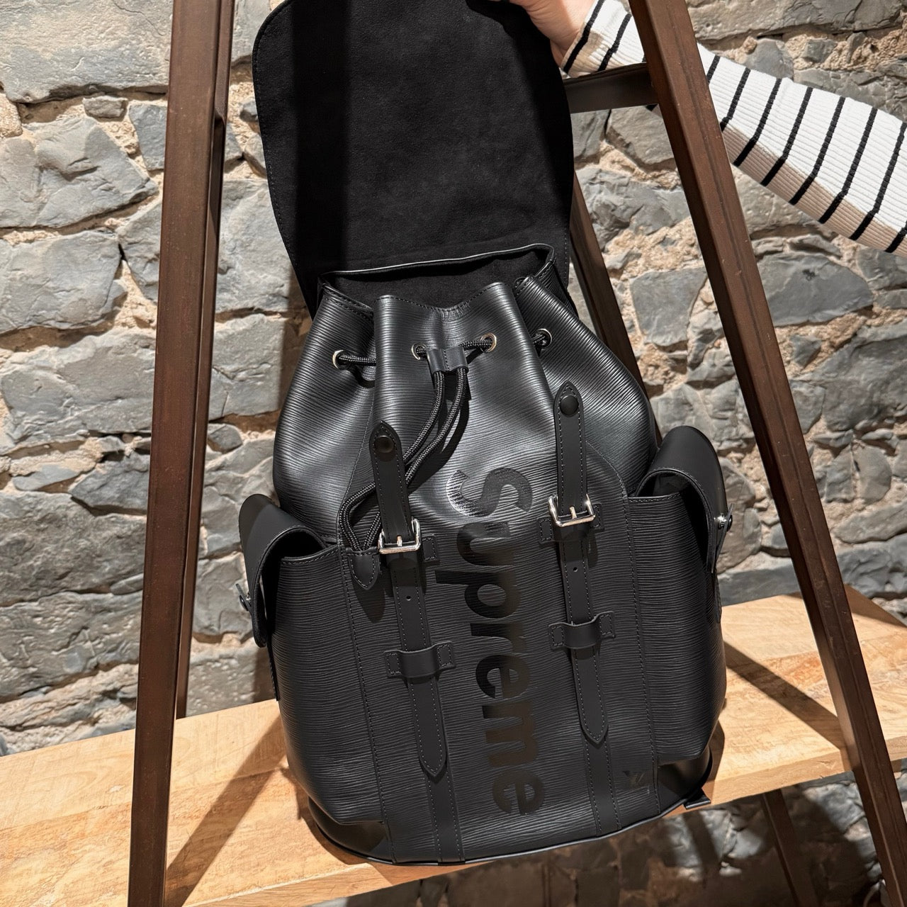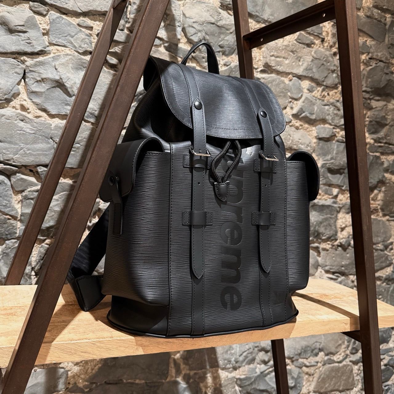 Part of the Louis Vuitton and Supreme collaboration of 2017. Structured backpack in black Epi leather with tonal Supreme logo in a slightly glossy coated finish. Tonal LV logo at front with the same finish. Flap top with dual strap and press stud closures. Drawstring closure. Top handle. Adjustable textile webbing straps with leather trim and Louis Vuitton X Supreme signature jacquard adjustment tabs. Logo embossed at back. Side cargo pockets with snap closures. Silver-tone branded hardware. Main compartment with zip pocket and slip pockets. Microfiber lining. Made in France. Comes as is.