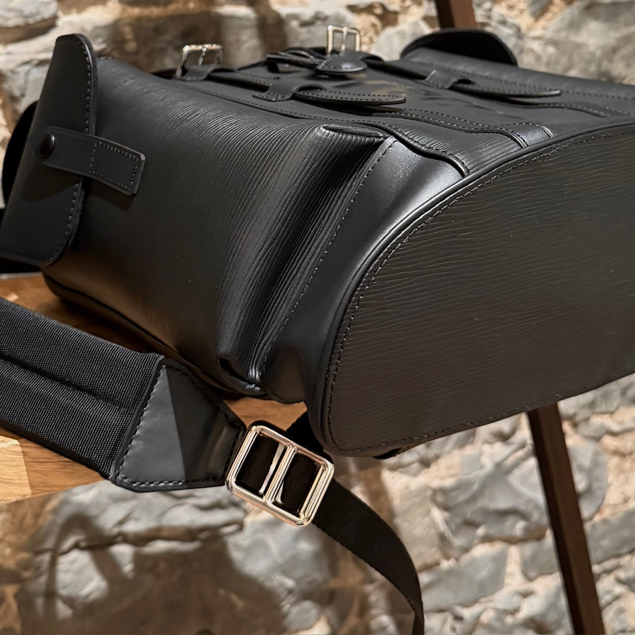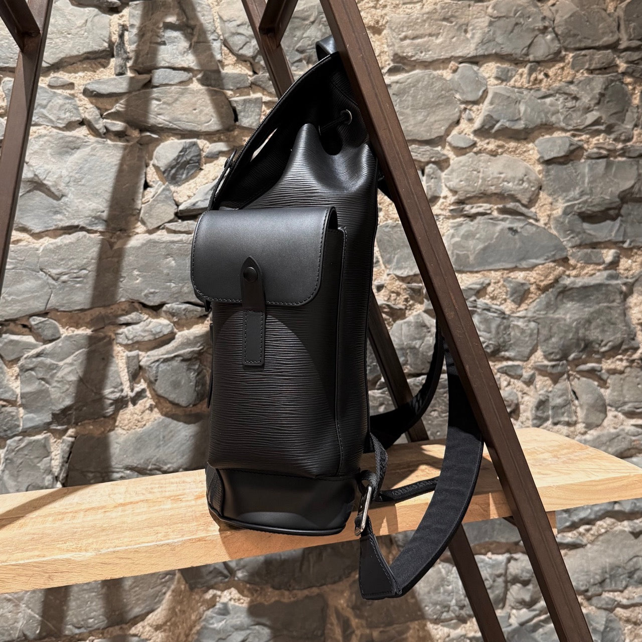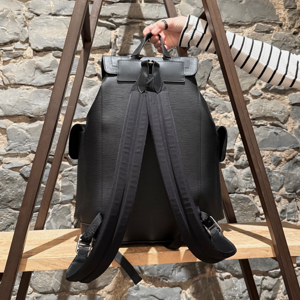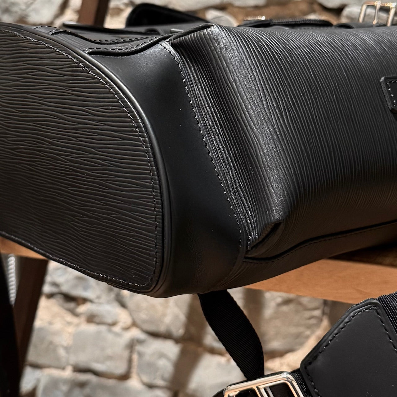 Part of the Louis Vuitton and Supreme collaboration of 2017. Structured backpack in black Epi leather with tonal Supreme logo in a slightly glossy coated finish. Tonal LV logo at front with the same finish. Flap top with dual strap and press stud closures. Drawstring closure. Top handle. Adjustable textile webbing straps with leather trim and Louis Vuitton X Supreme signature jacquard adjustment tabs. Logo embossed at back. Side cargo pockets with snap closures. Silver-tone branded hardware. Main compartment with zip pocket and slip pockets. Microfiber lining. Made in France. Comes as is.