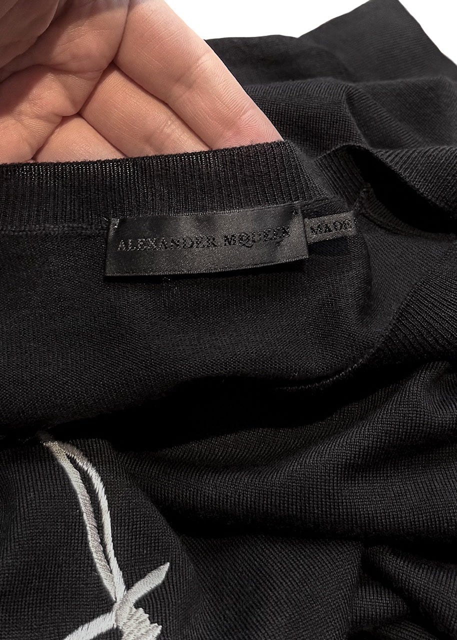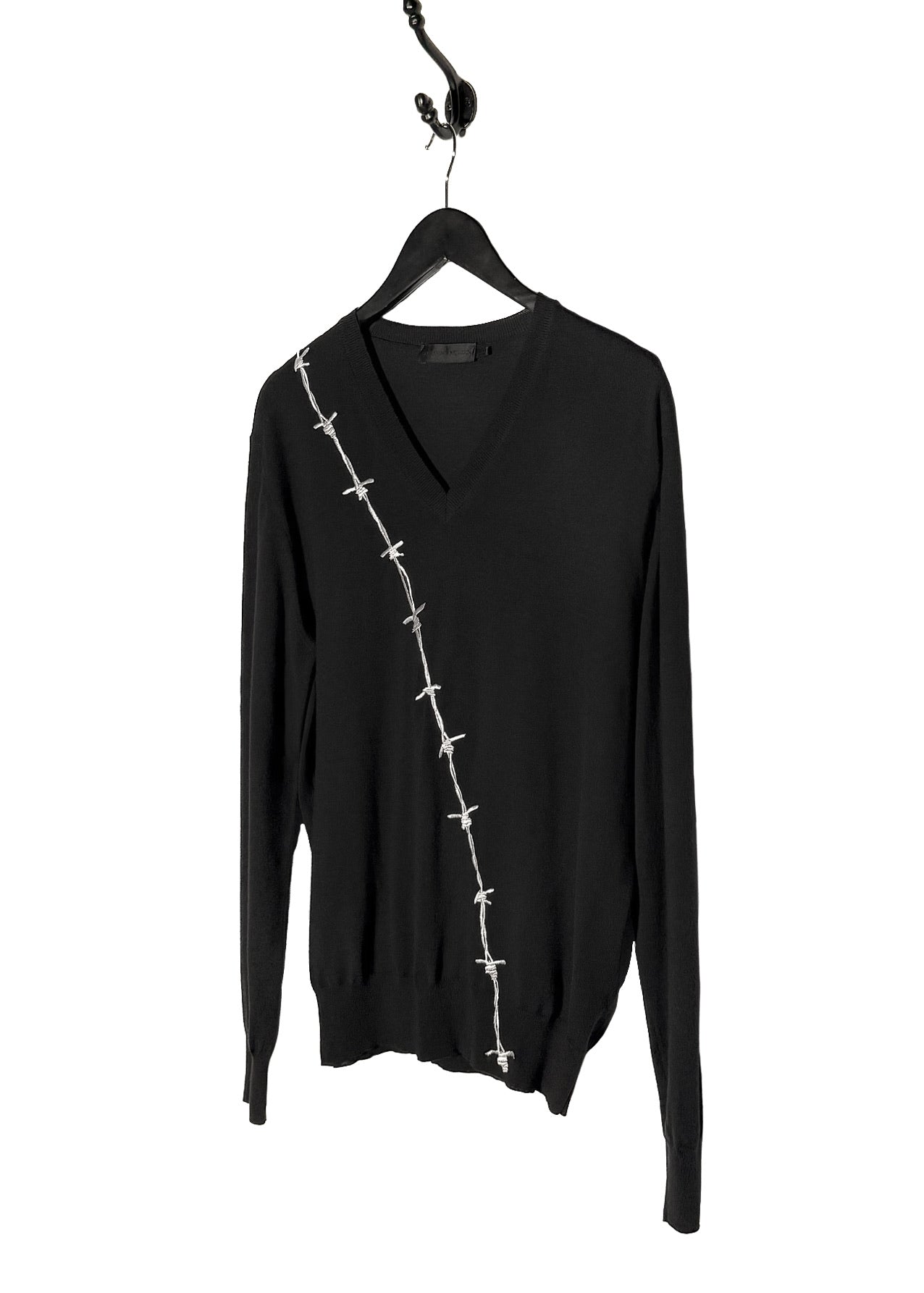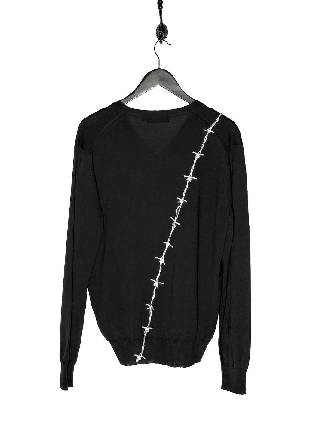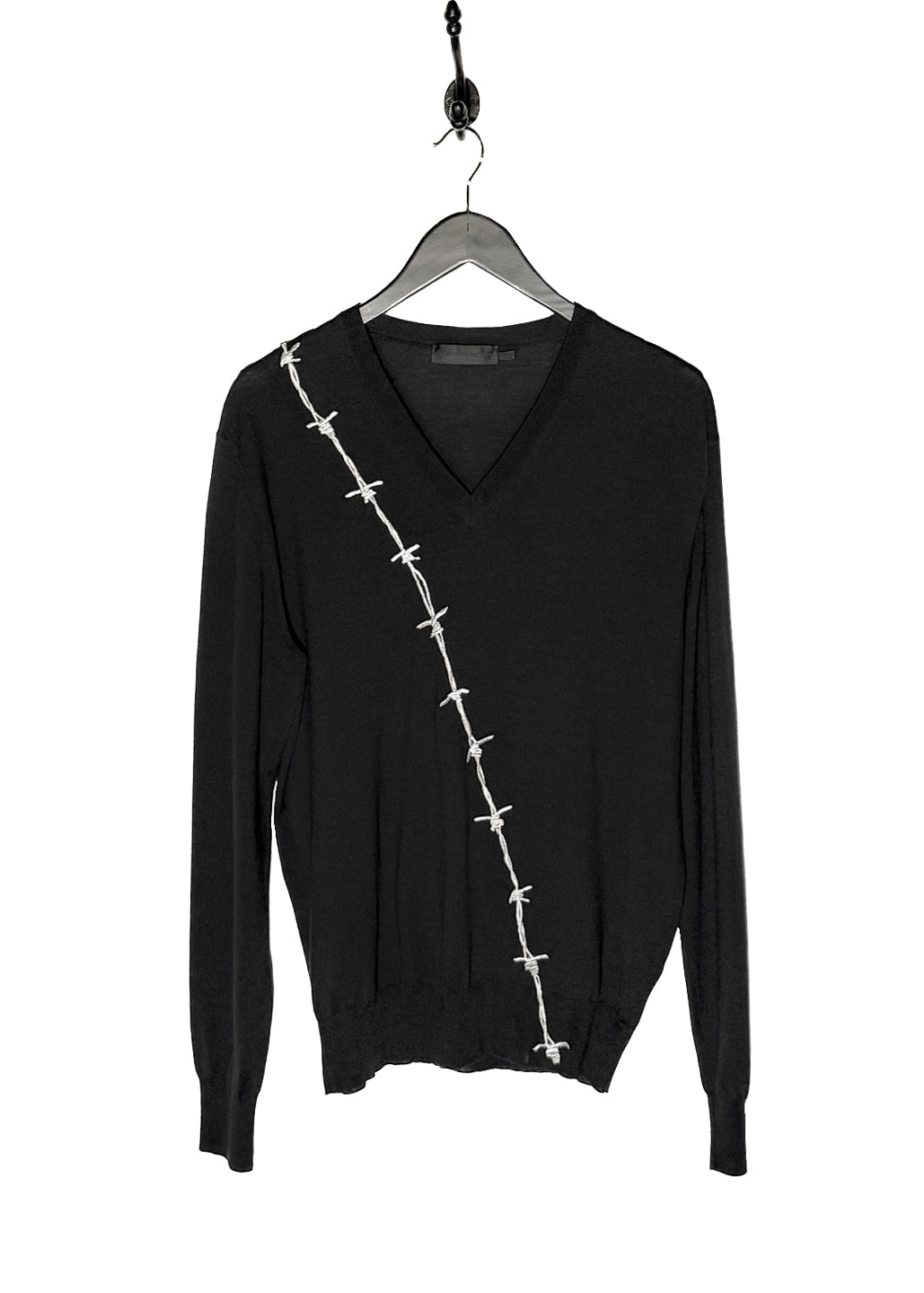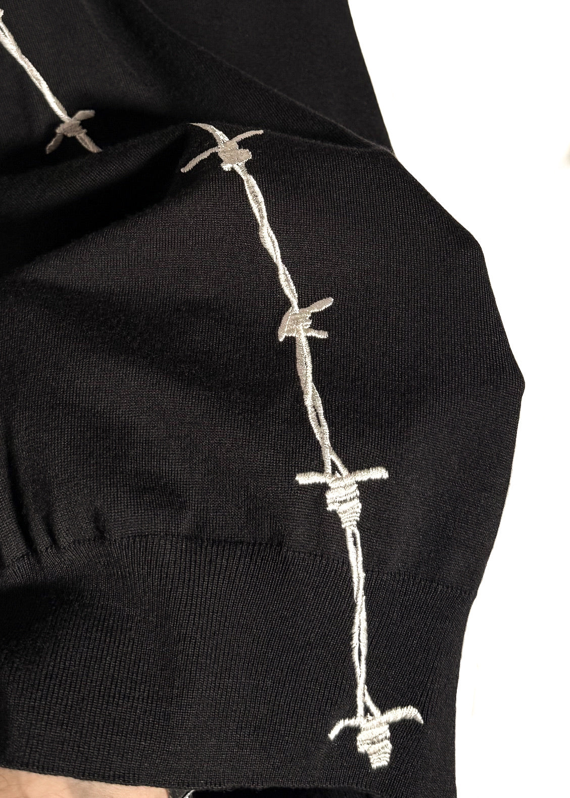 Maille noire fine. Broderie fil barbelé blanche à l’avant et à l’arrière. Col en V. Manches longues. Finitions côtelées. Ourlet droit. Coupe régulière. Fait en Italie.