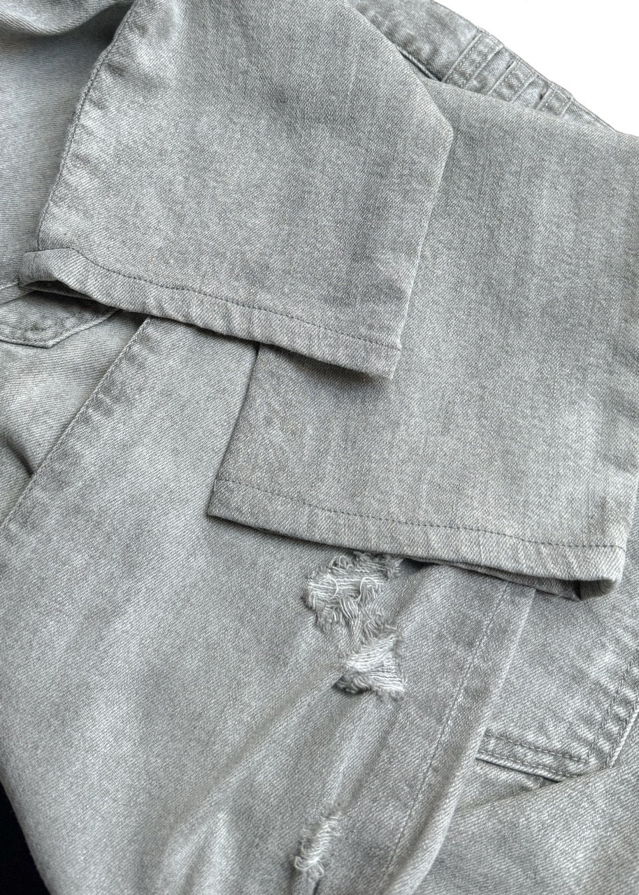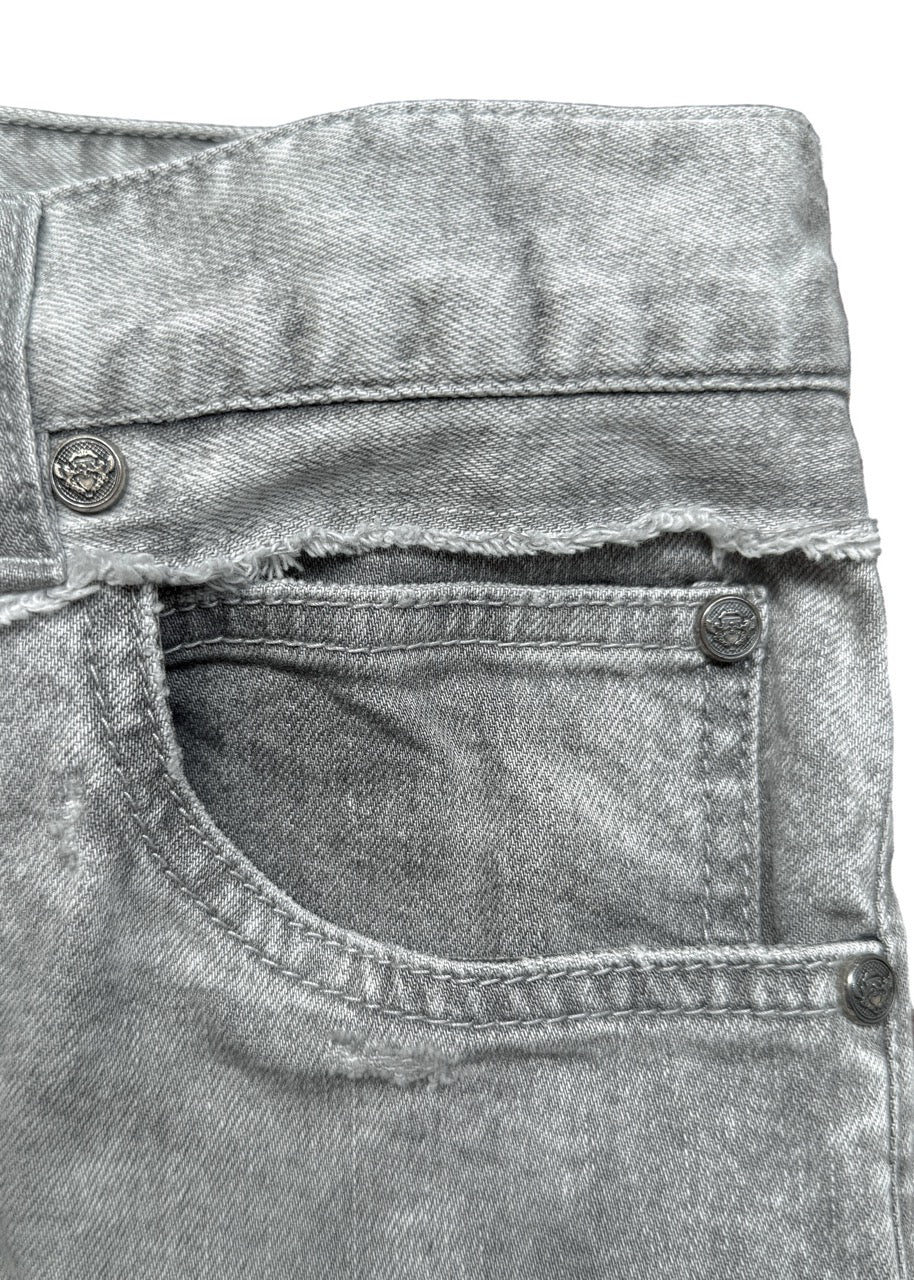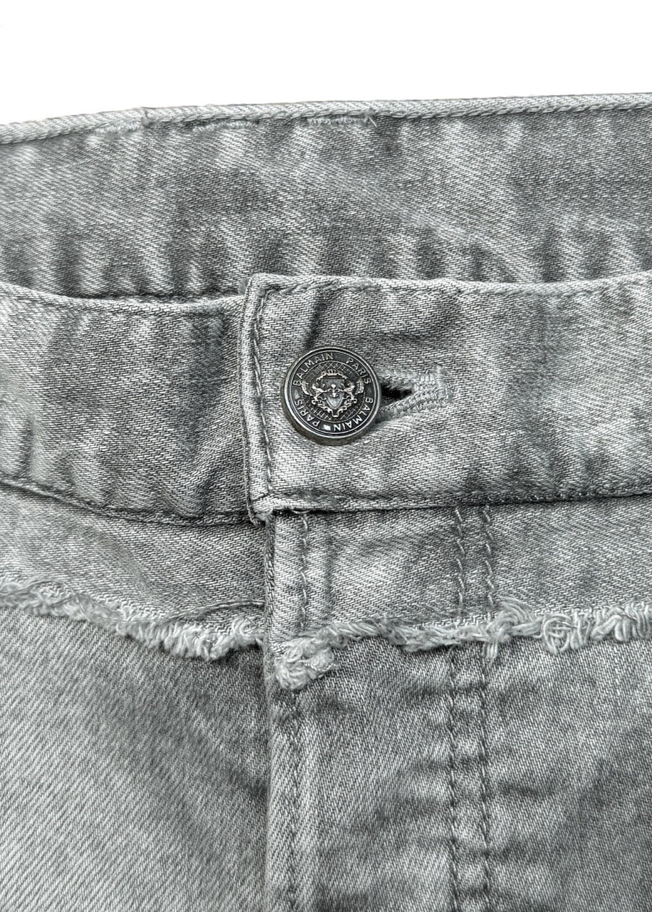 Jean slim Balmain gris effet usé. Denim gris délavé effet usé avec de subtiles déchirures sur le devant des jambes. Ceinture déconstruite à bords francs, donnant l'impression d'une taille retirée puis rattachée pour un look coupé-cousu reconstruit avec une finition effilochée. Fermeture par braguette boutonnée. Modèle cinq poches avec détails Balmain gravés. Coupe slim. Fabriqué au Japon.