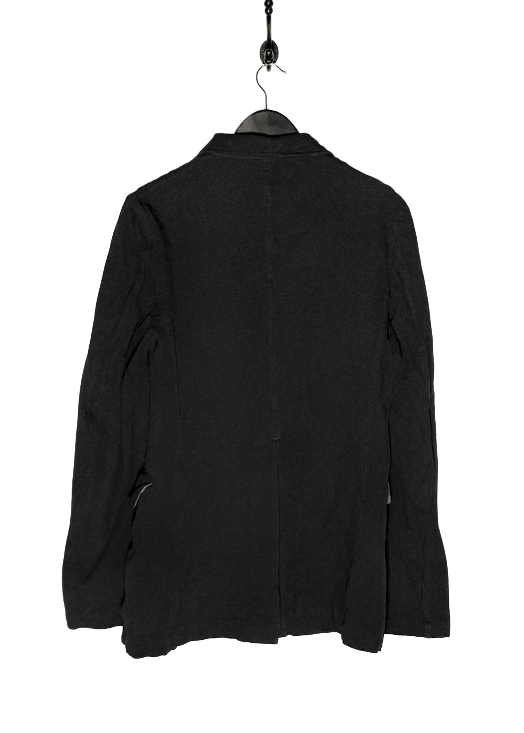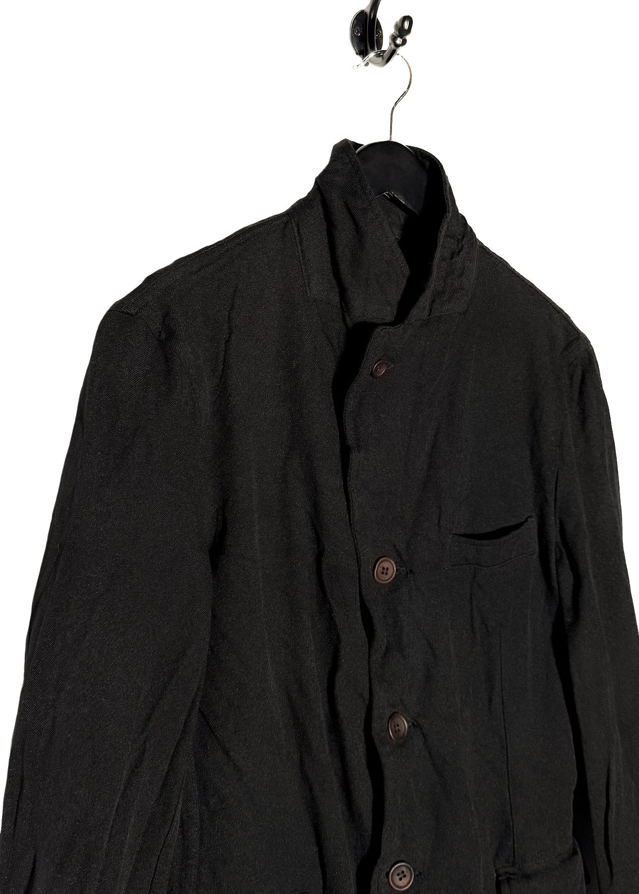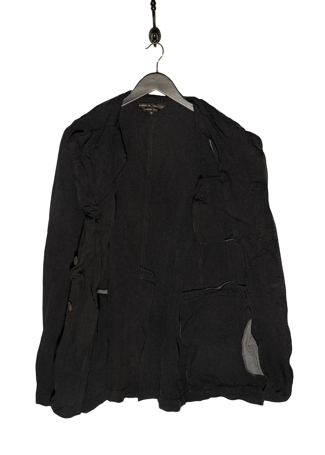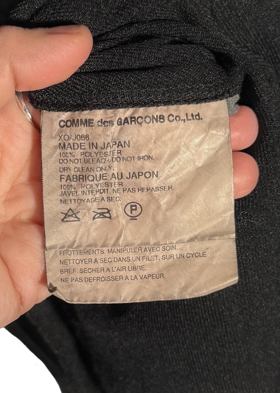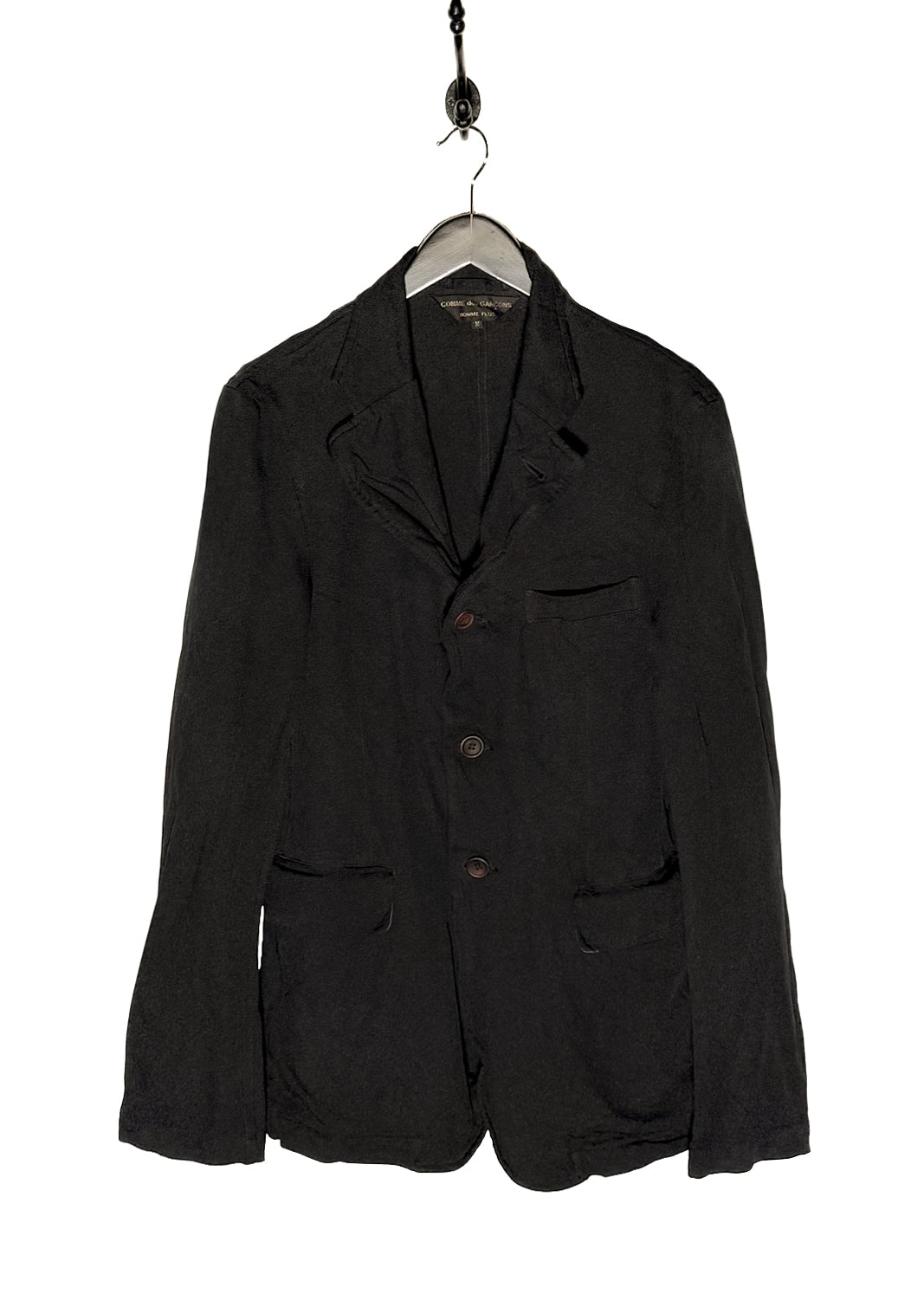 Classic piece from Comme Des Garçons in their signature polyester fabric. Lightweight woven construction. Tailored silhouette. Notched lapel. Three-button front closure with brown buttons. Long sleeves. One (1) chest patch pocket. Two (2) lower patch pockets. Unlined interior with visible seams. Made in Japan.