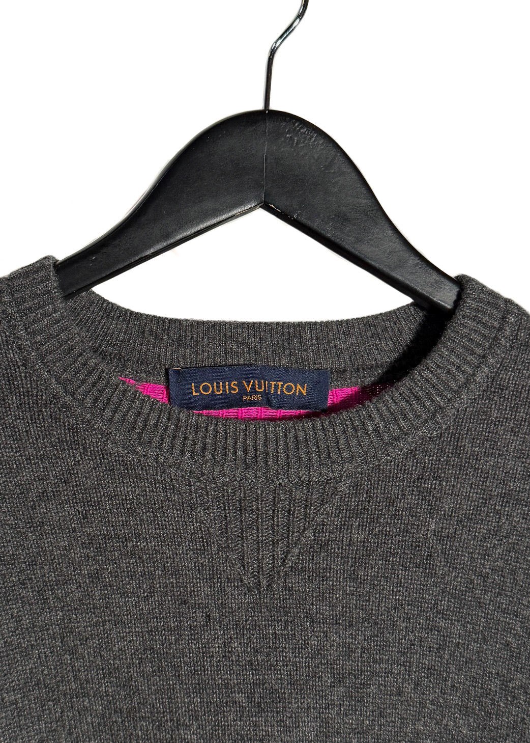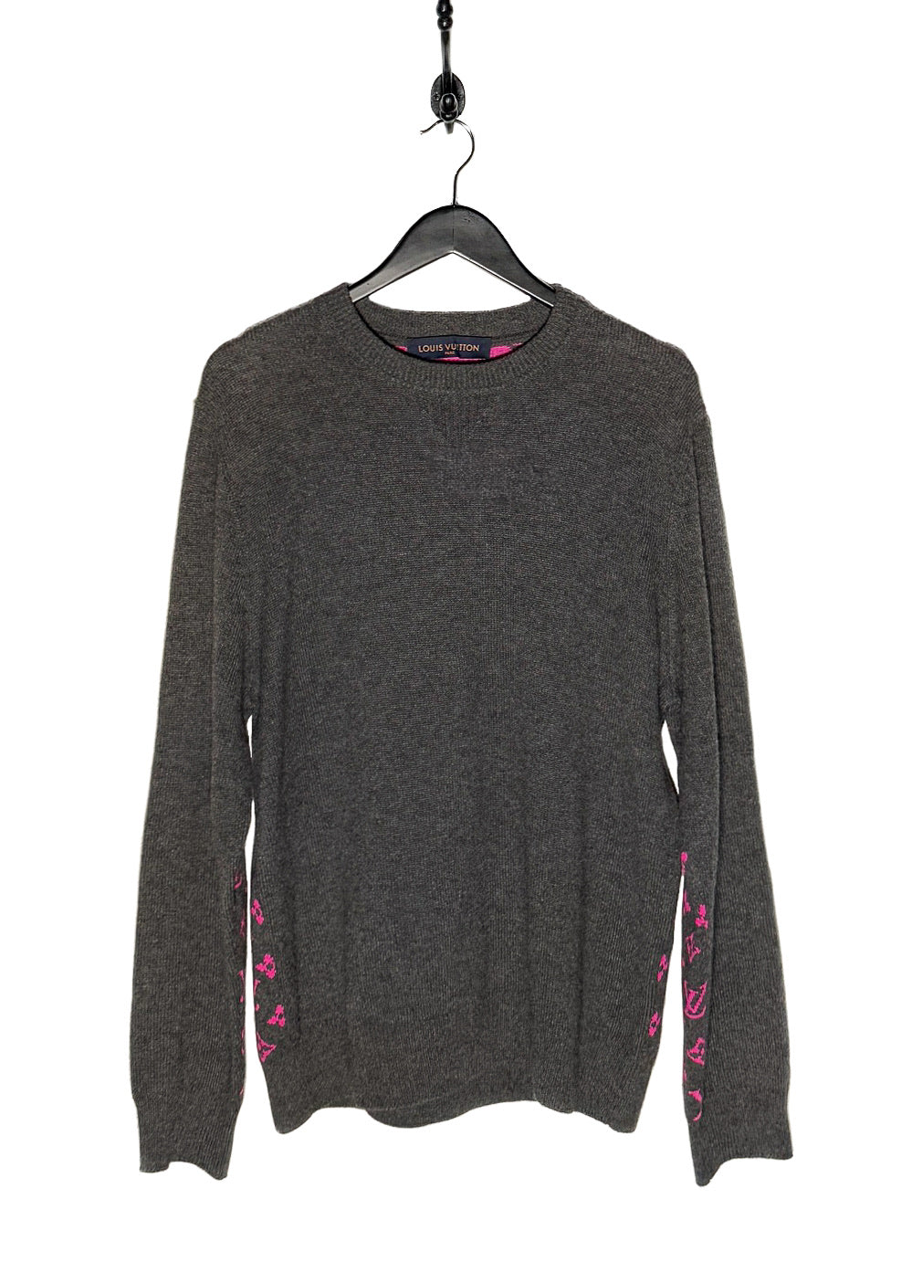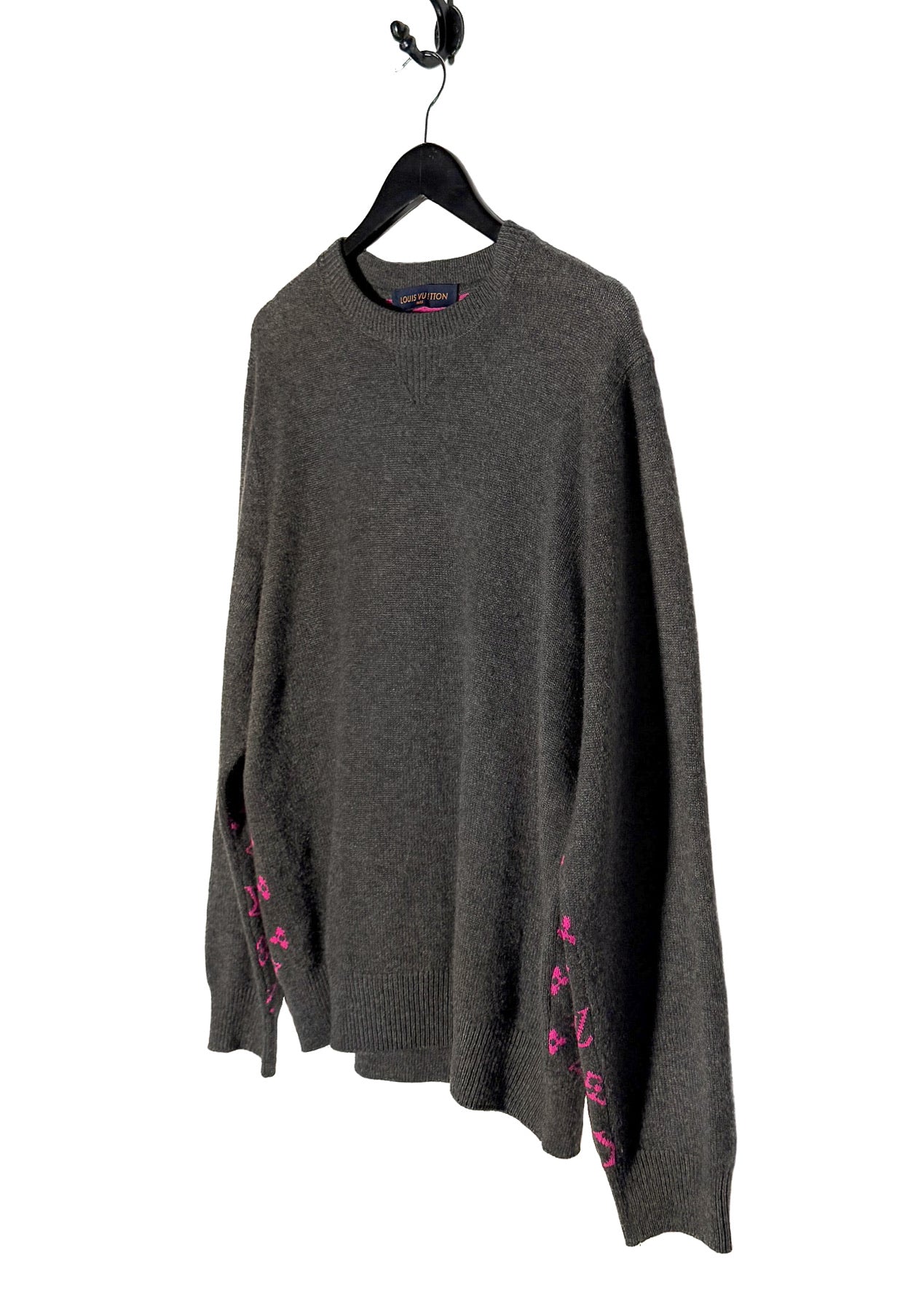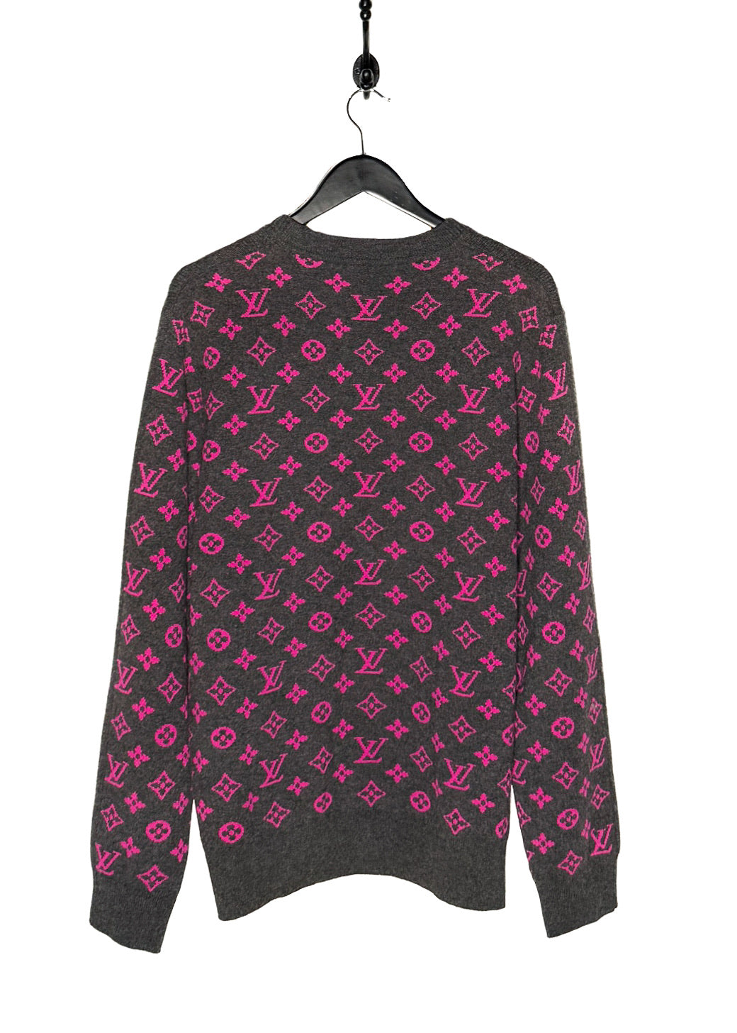Collection Automne Hiver 2018. Fait en cachemire 100 % avec une maille légère et douce. Fond gris avec motif Monogramme rose vif en intersia au dos et aux manches. Panneau avant uni. Encolure ronde côtelée, poignets et ourlet côtelés. Détail en V tricoté à l’avant de l’encolure. Fait en Italie.