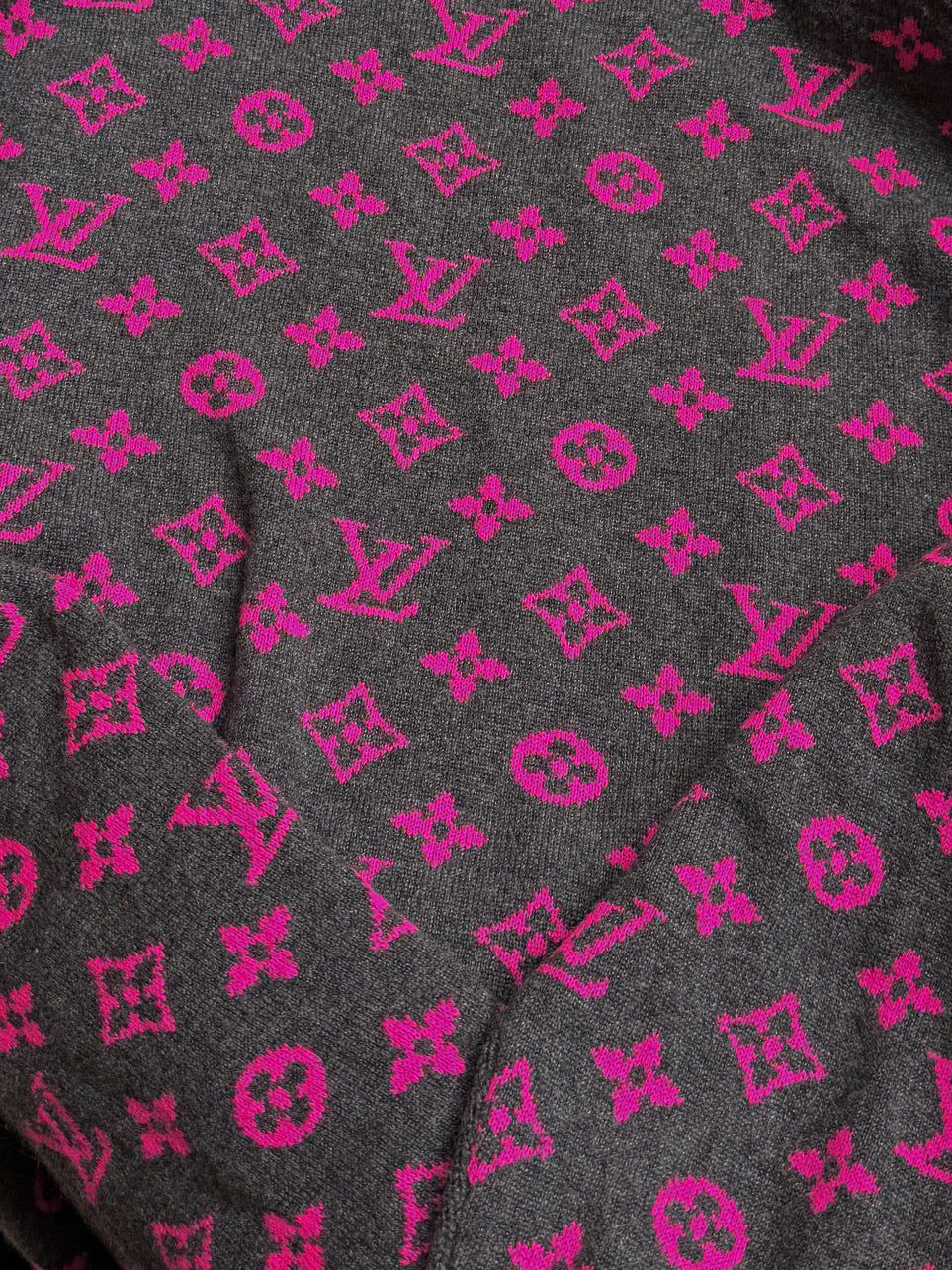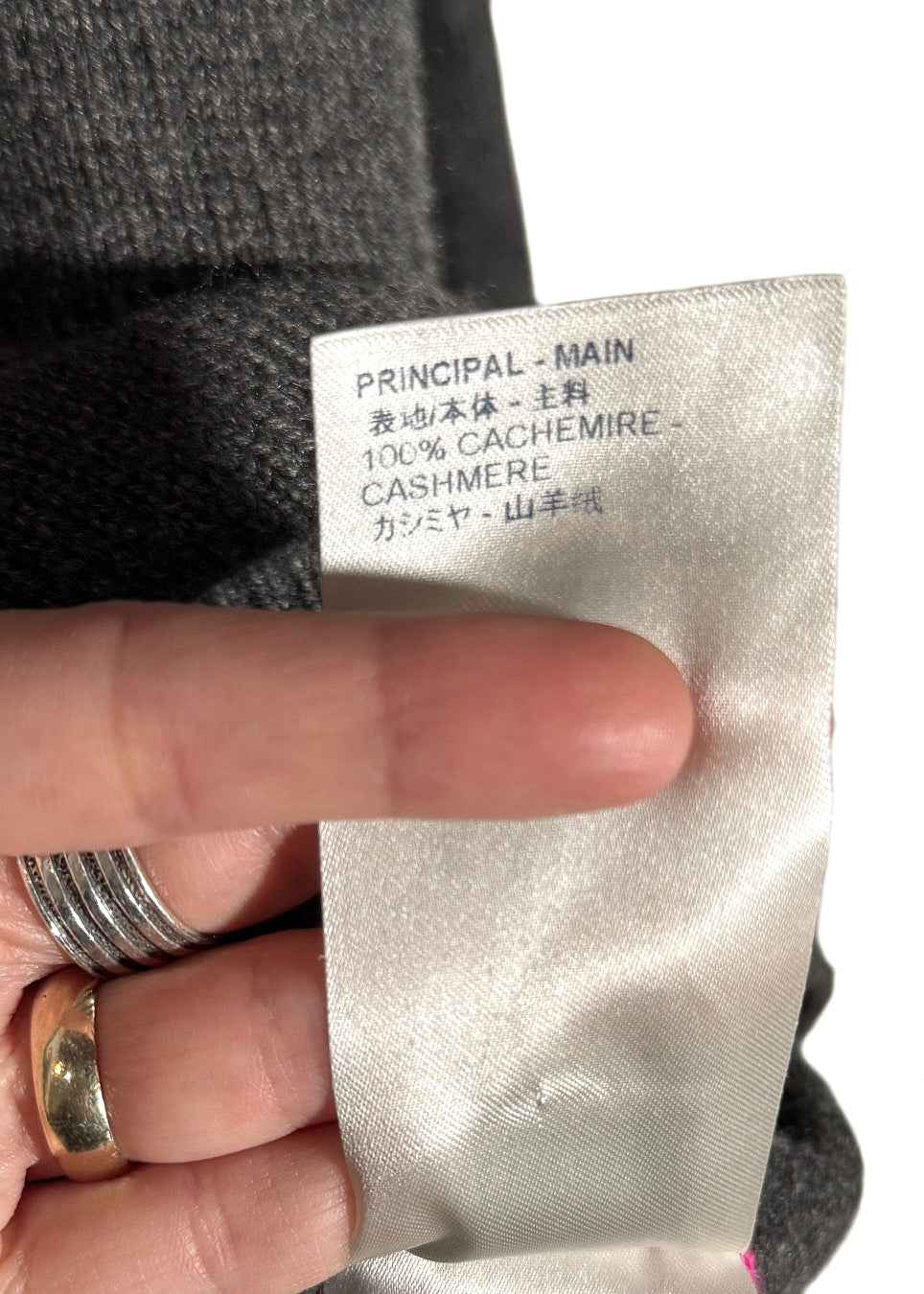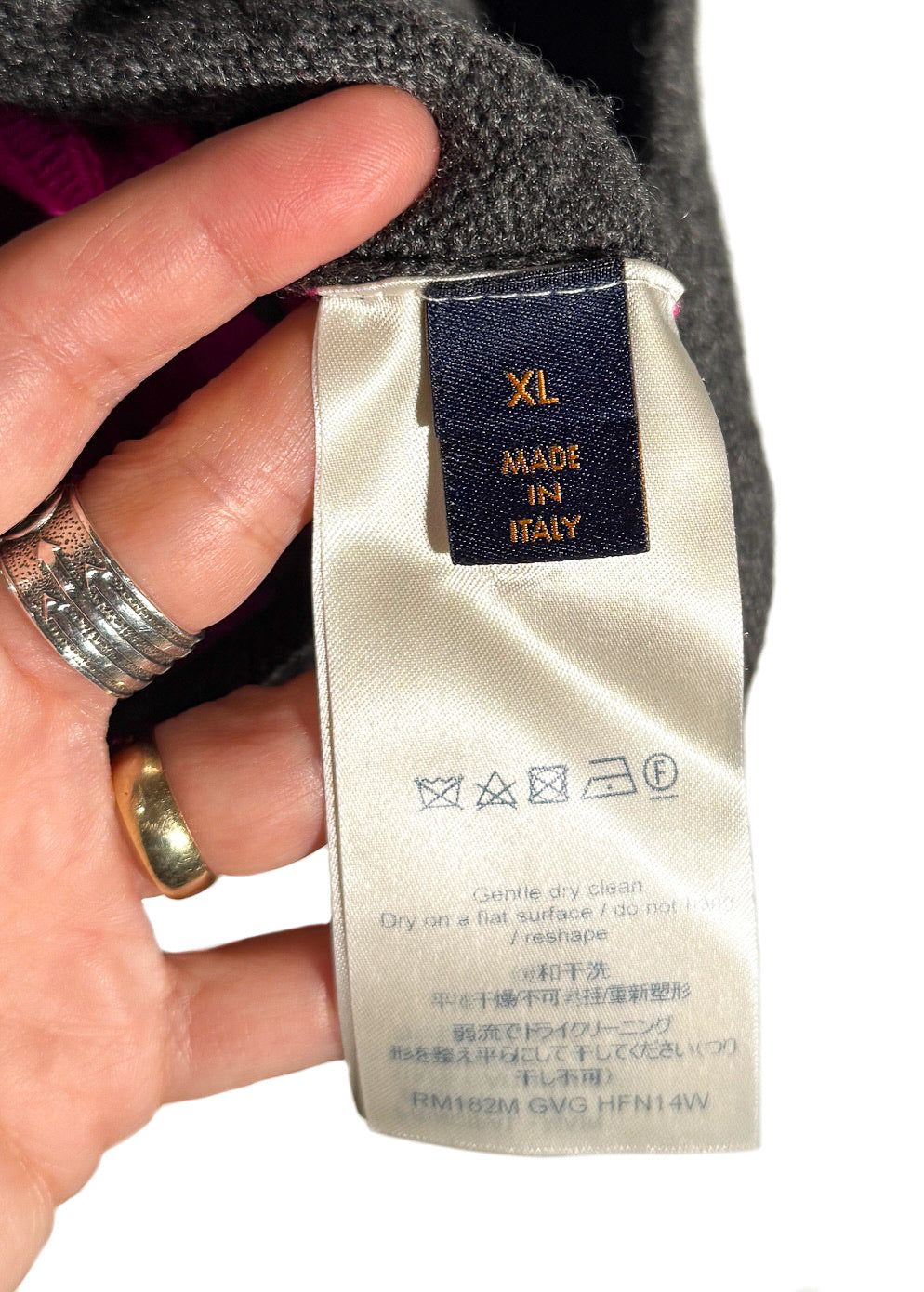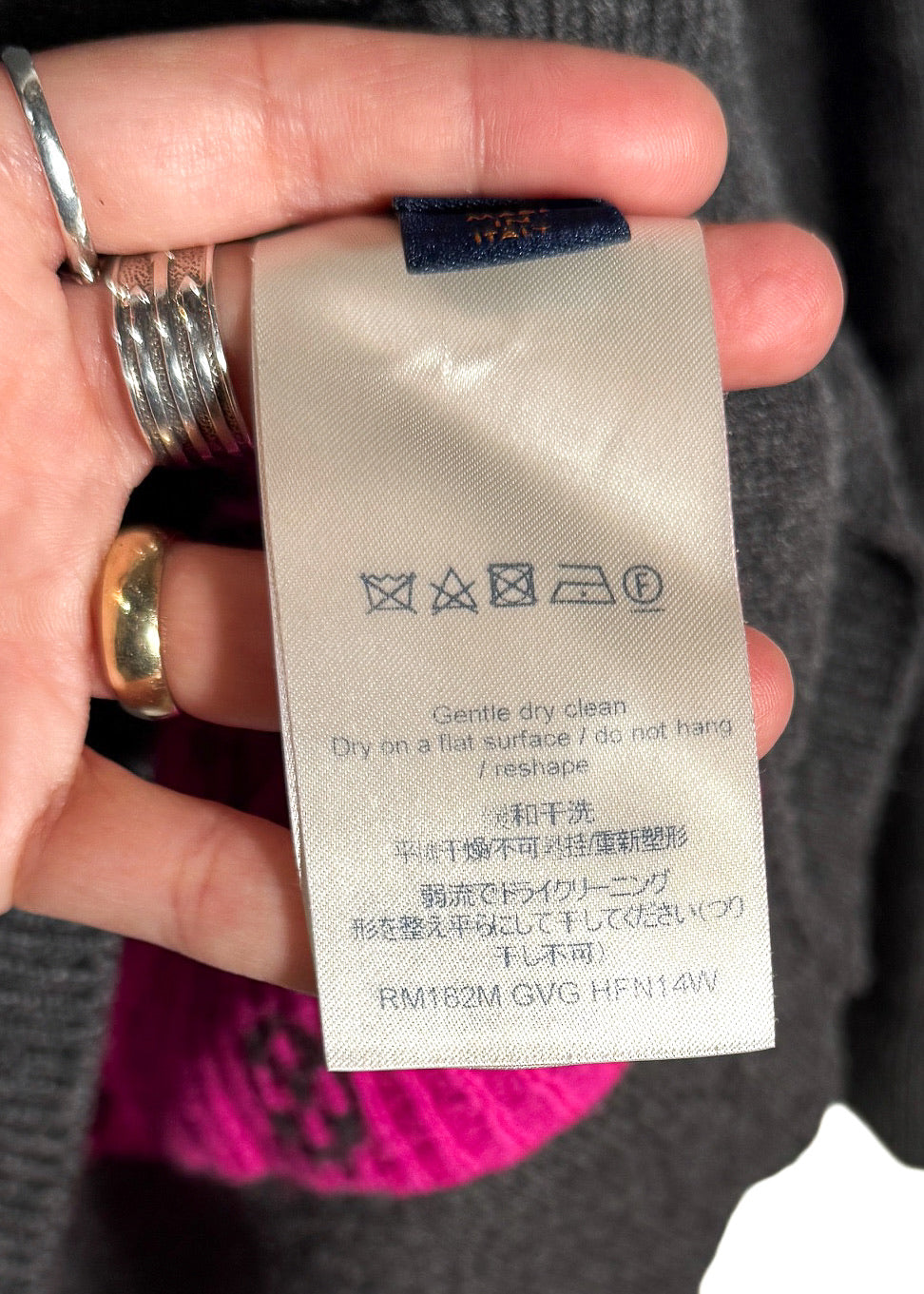 Collection Automne Hiver 2018. Fait en cachemire 100 % avec une maille légère et douce. Fond gris avec motif Monogramme rose vif en intersia au dos et aux manches. Panneau avant uni. Encolure ronde côtelée, poignets et ourlet côtelés. Détail en V tricoté à l’avant de l’encolure. Fait en Italie.