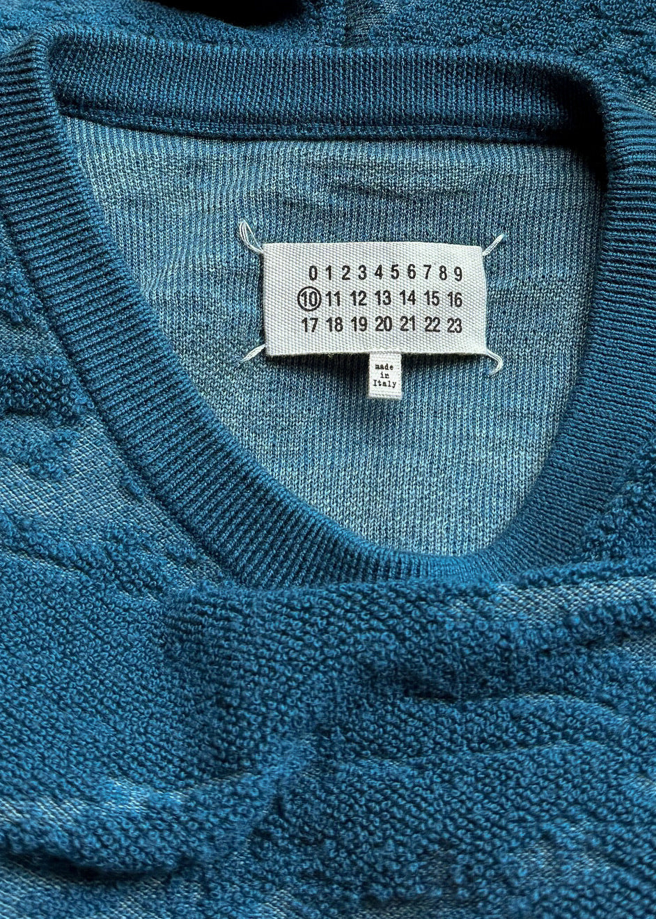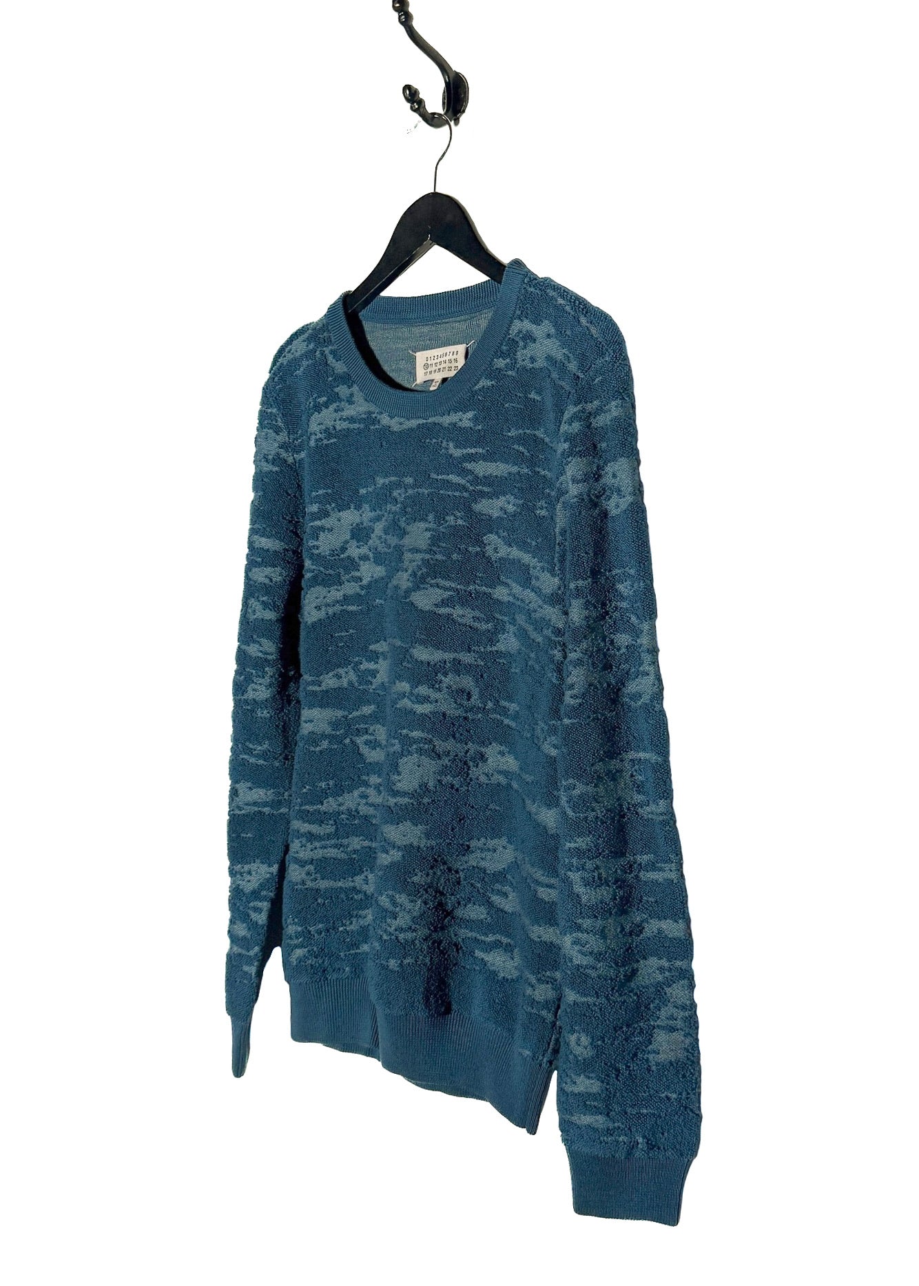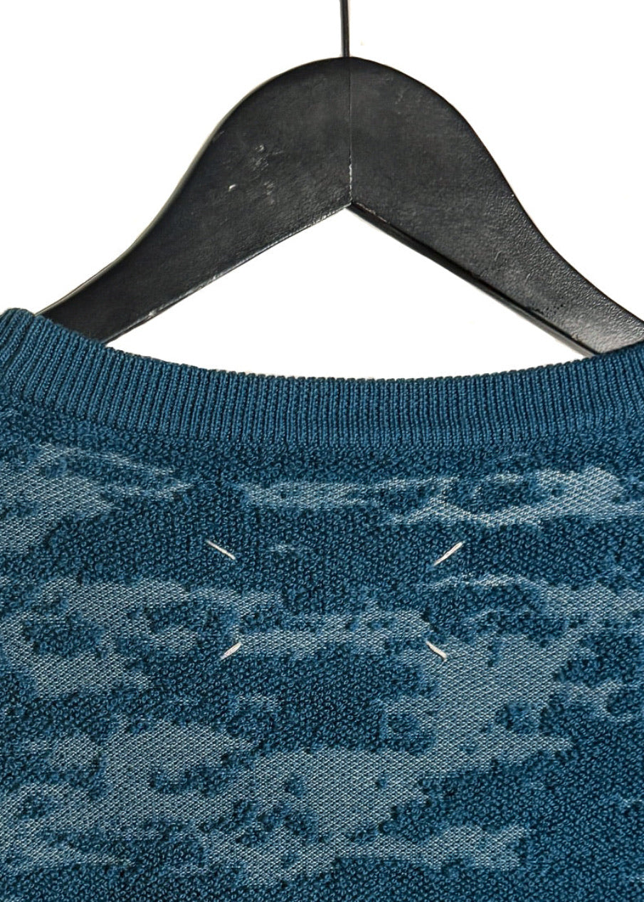 Collection 2014. Maille à texture chenille. Bleu turquoise avec un motif jacquard camouflage abstrait ton sur ton. Col rond. Manches longues. Bord-côtes au col, aux poignets et à la base. Quatre (4) points blancs signature en haut du dos. Ourlet droit. Coupe classique. Fabriqué en Italie.