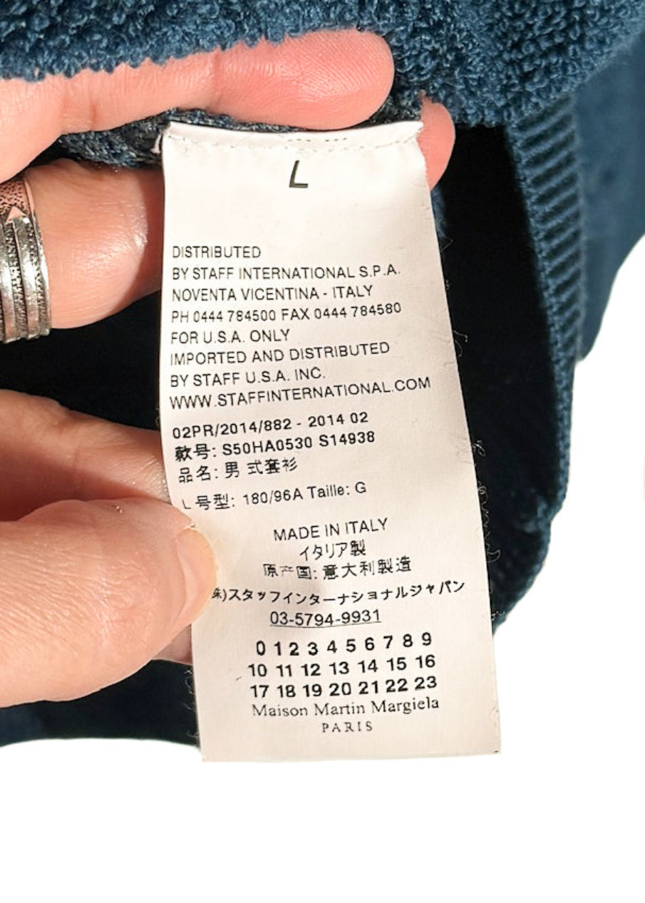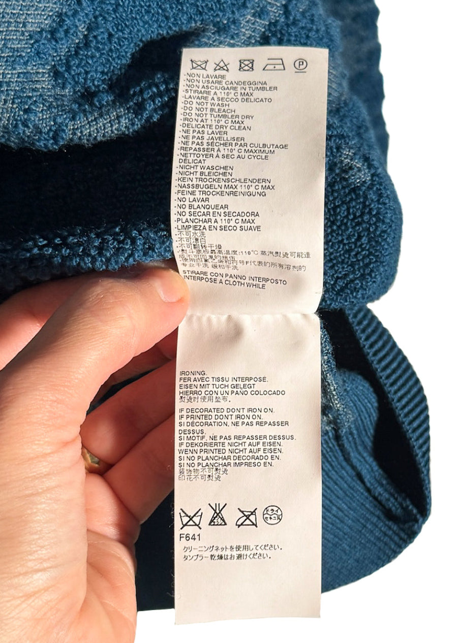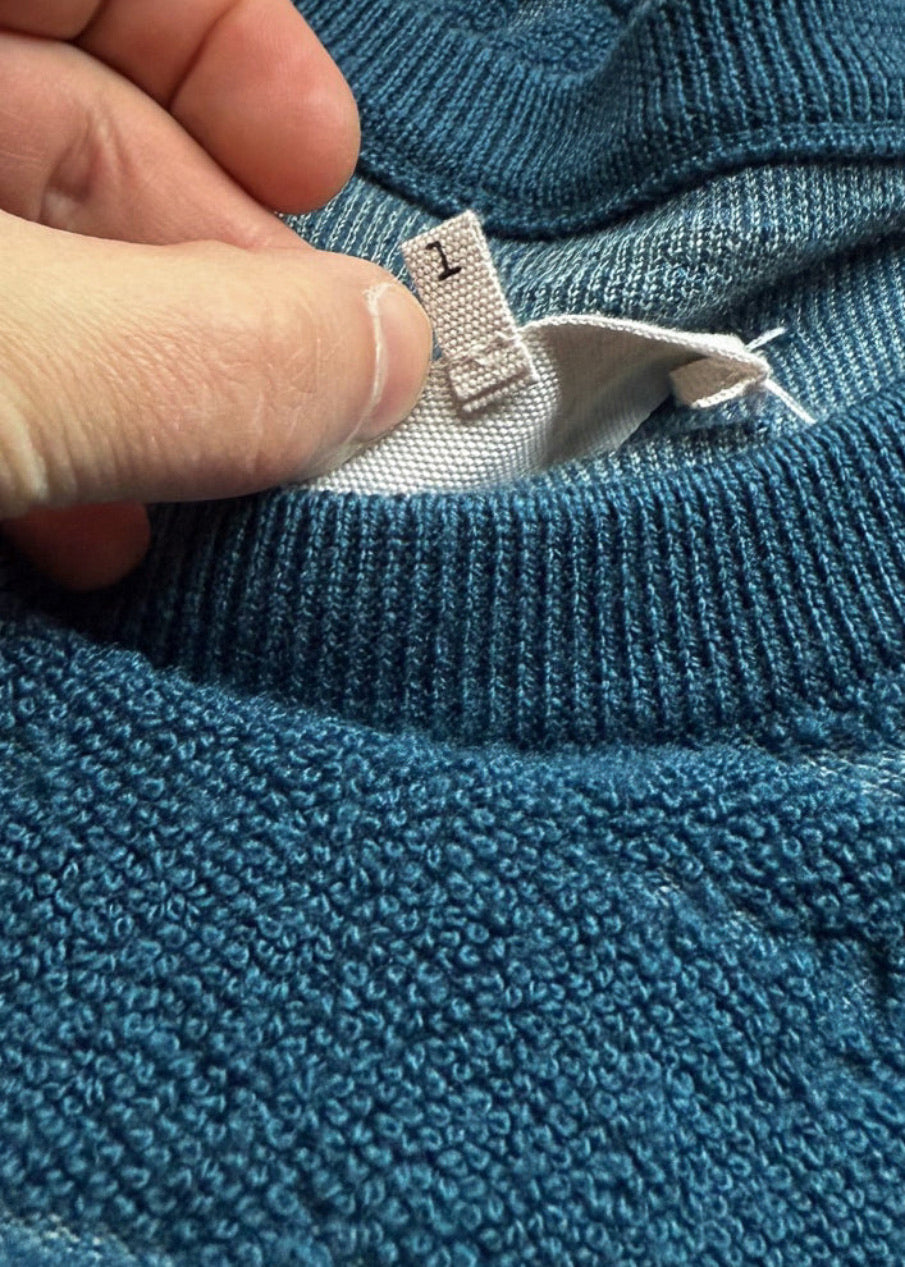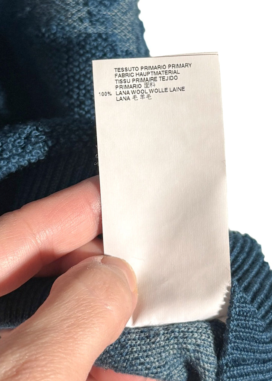 Collection 2014. Maille à texture chenille. Bleu turquoise avec un motif jacquard camouflage abstrait ton sur ton. Col rond. Manches longues. Bord-côtes au col, aux poignets et à la base. Quatre (4) points blancs signature en haut du dos. Ourlet droit. Coupe classique. Fabriqué en Italie.