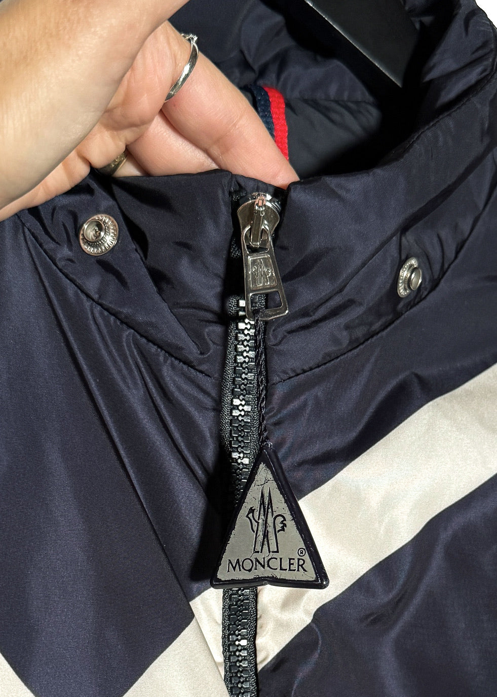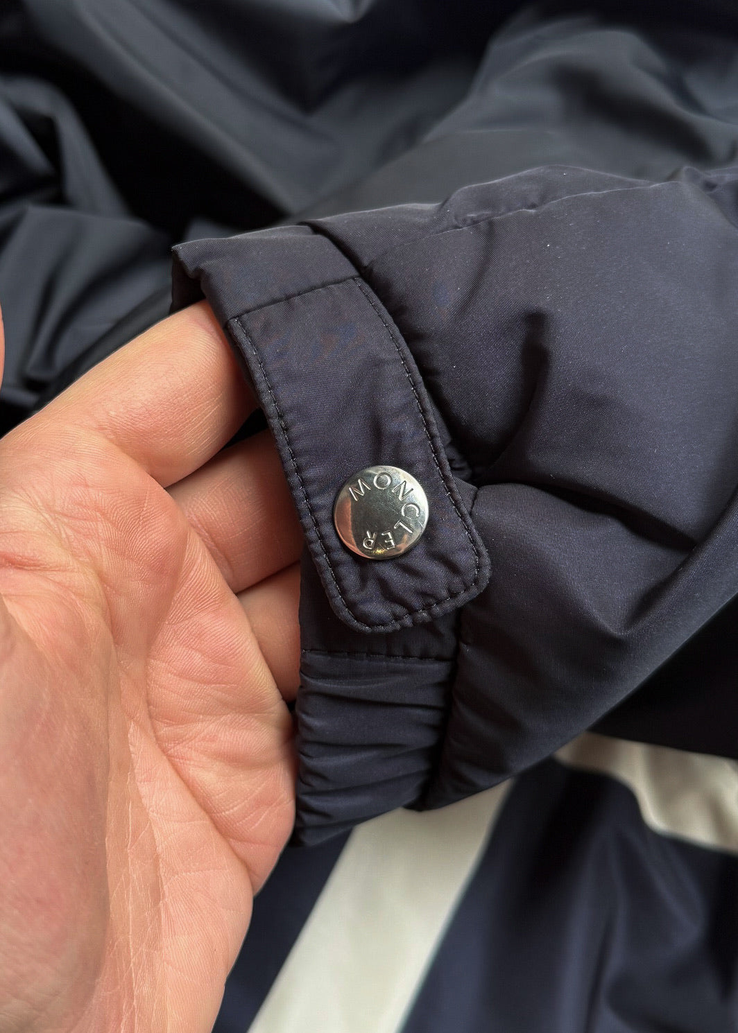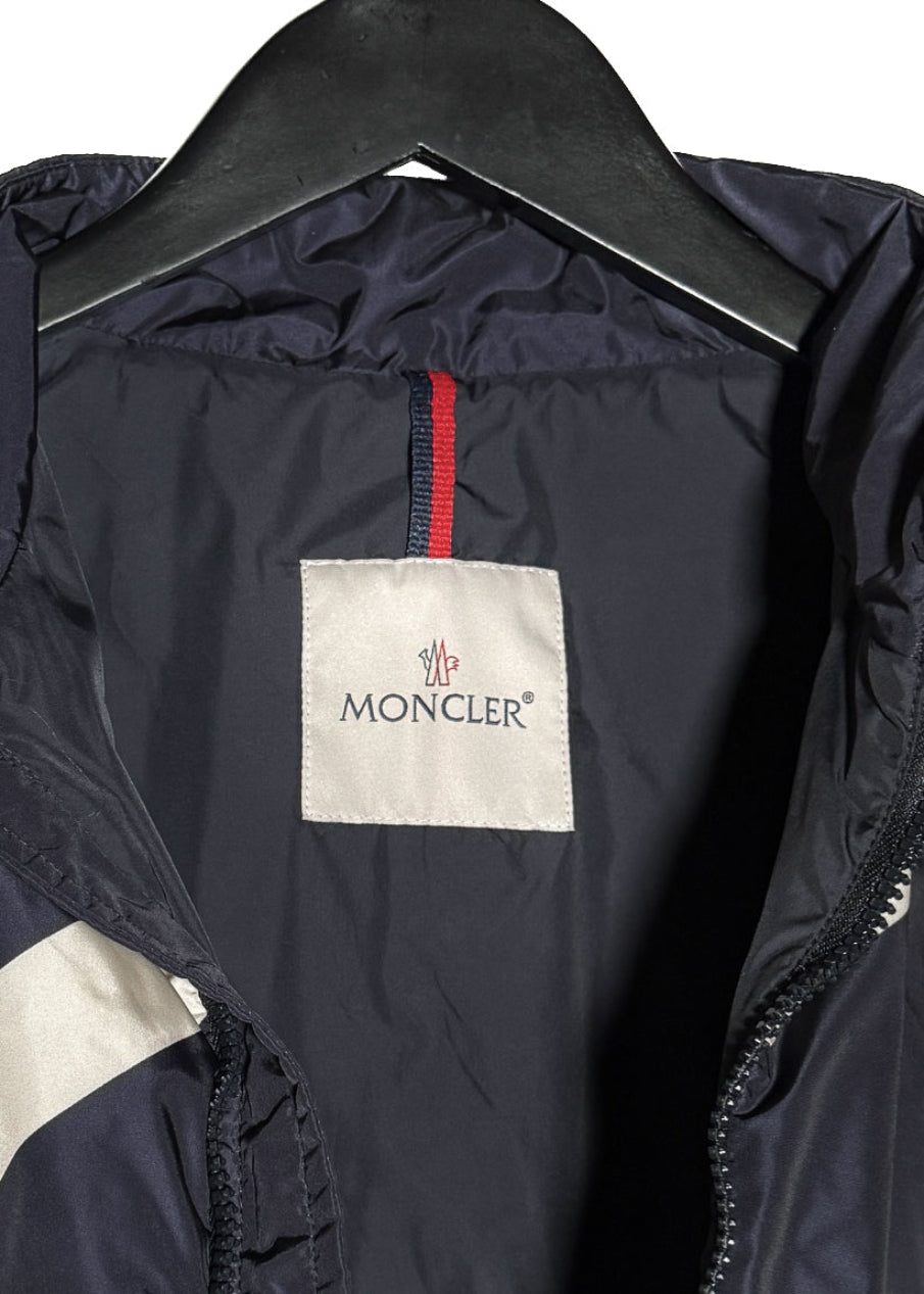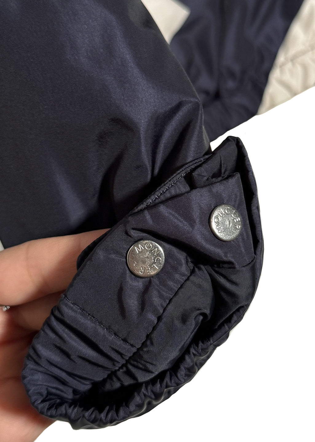 Nylon bleu marine avec léger rembourrage en duvet. Logo Moncler à lettrage ivoire surdimensionné. Col montant. Capuche d’origine manquante. Quincaillerie argentée griffée. Fermeture zippée double sur toute la longueur à l’avant. Breloque triangle d’authenticité Moncler toujours présente. Deux (2) poches latérales zippées. Poignets élastiqués avec pattes ajustables à boutons-pression. Ourlet élastiqué. Doublure intérieure en nylon lisse avec détail tricolore iconique Moncler à l’encolure intérieure au dos. Faite en Roumanie. Article d'occasion.