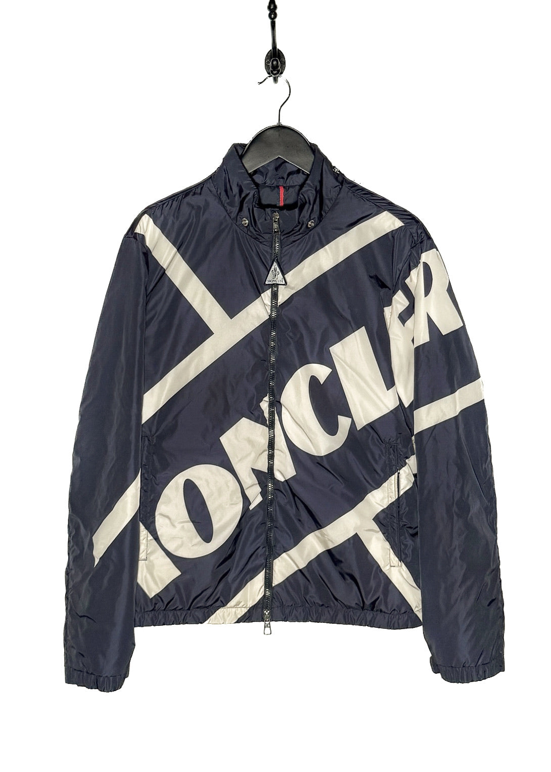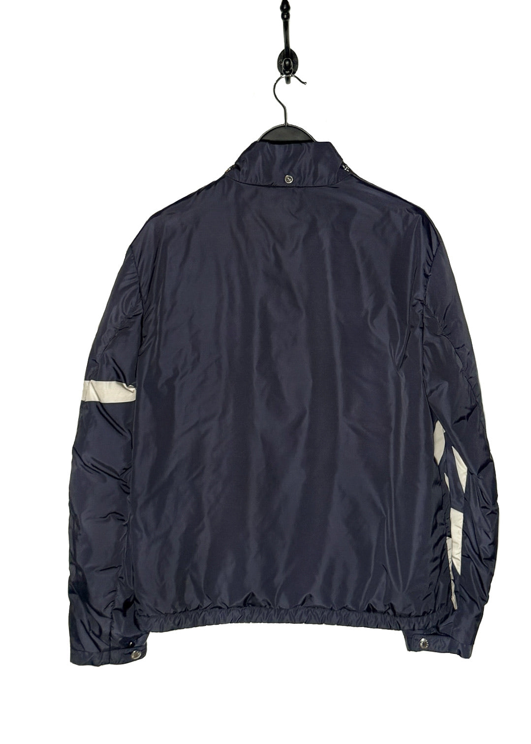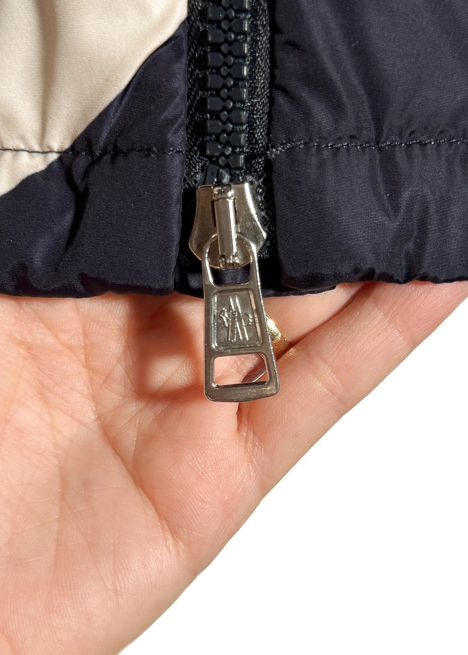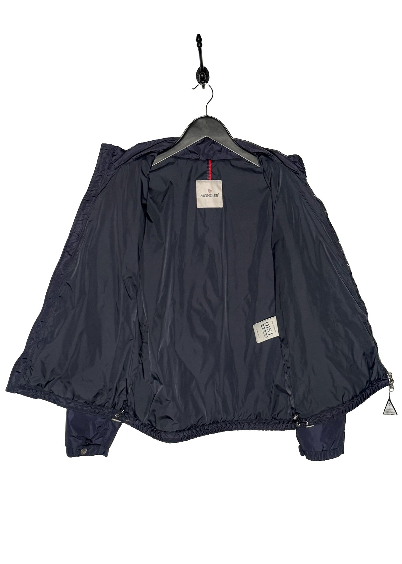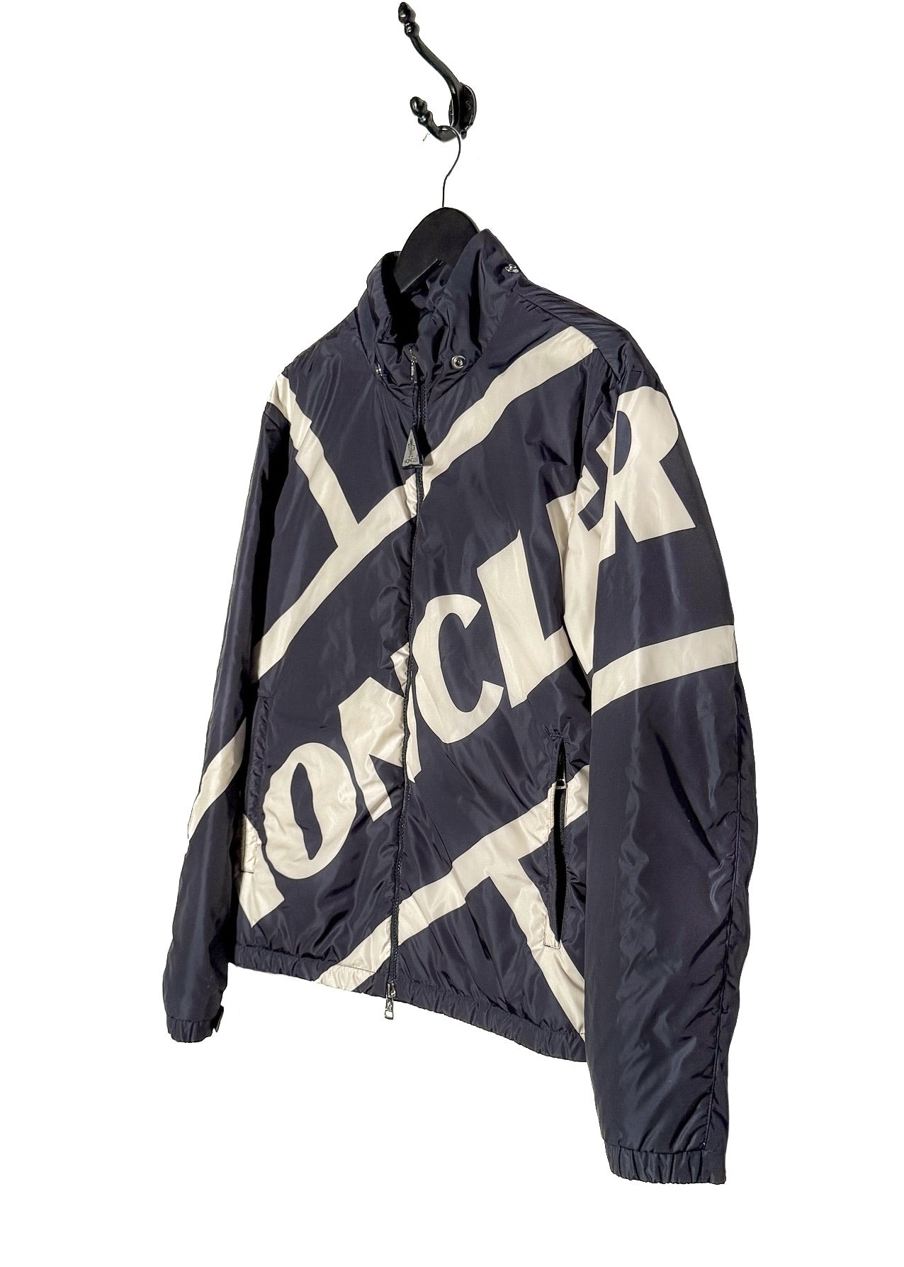 Nylon bleu marine avec léger rembourrage en duvet. Logo Moncler à lettrage ivoire surdimensionné. Col montant. Capuche d’origine manquante. Quincaillerie argentée griffée. Fermeture zippée double sur toute la longueur à l’avant. Breloque triangle d’authenticité Moncler toujours présente. Deux (2) poches latérales zippées. Poignets élastiqués avec pattes ajustables à boutons-pression. Ourlet élastiqué. Doublure intérieure en nylon lisse avec détail tricolore iconique Moncler à l’encolure intérieure au dos. Faite en Roumanie. Article d'occasion.