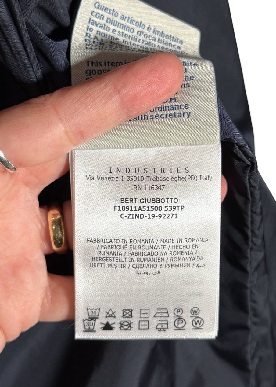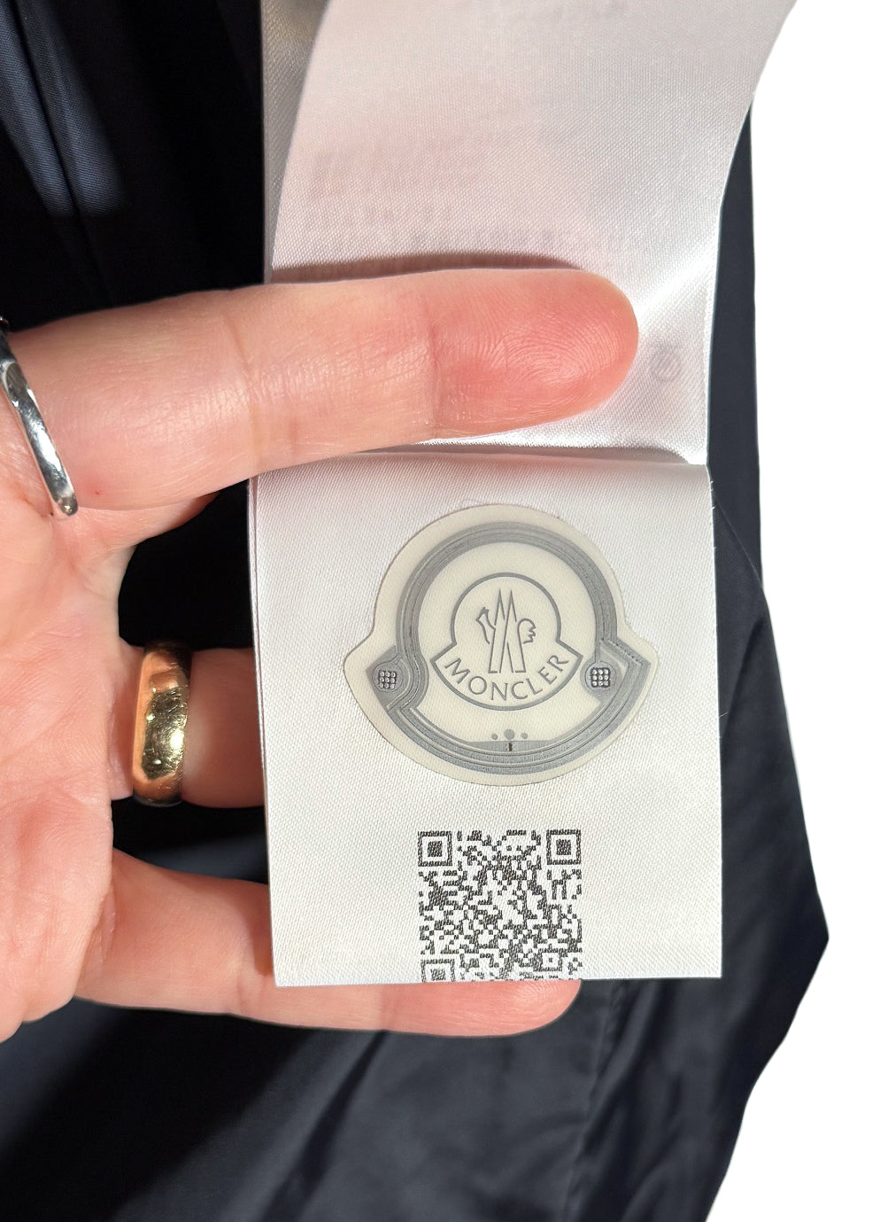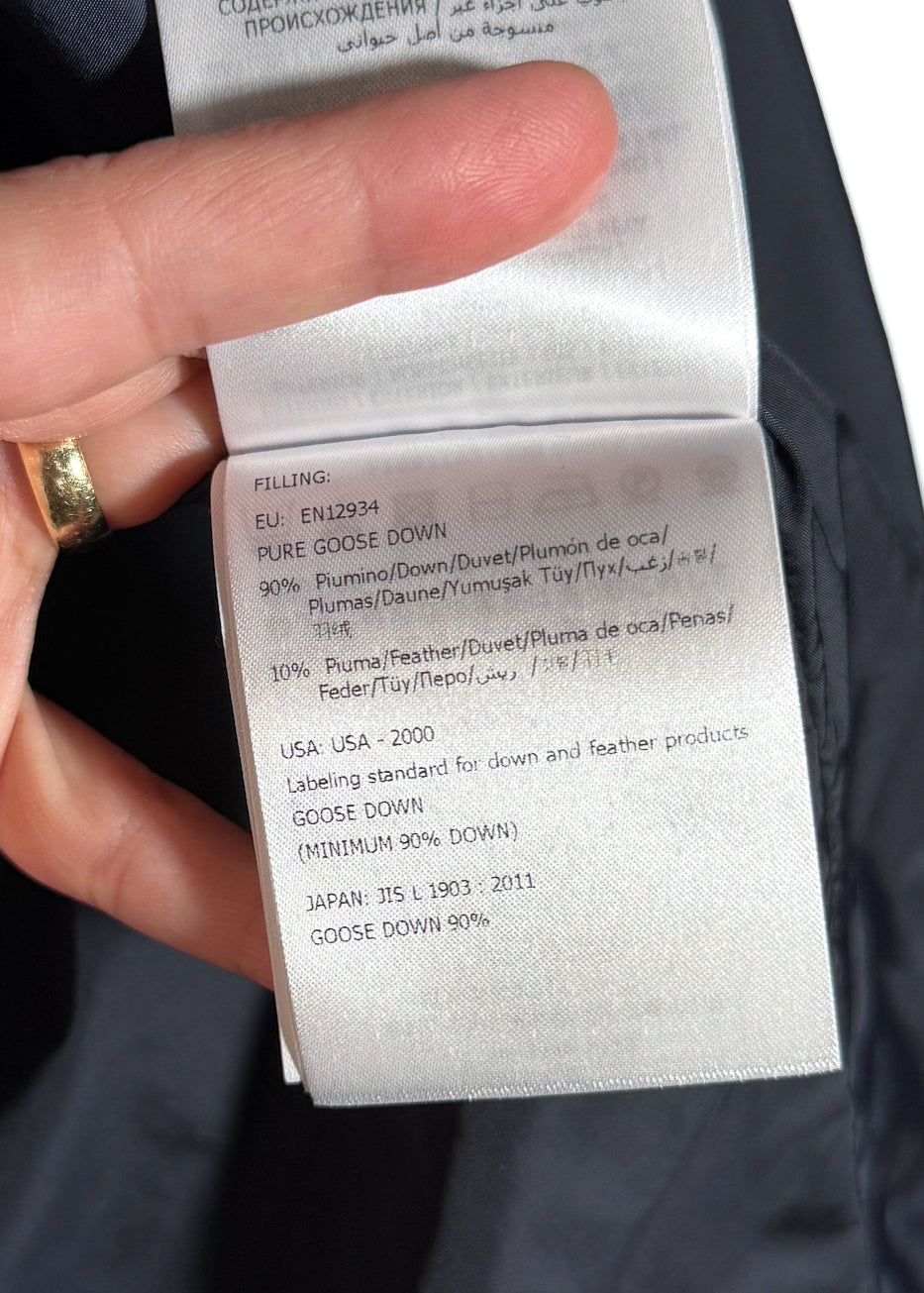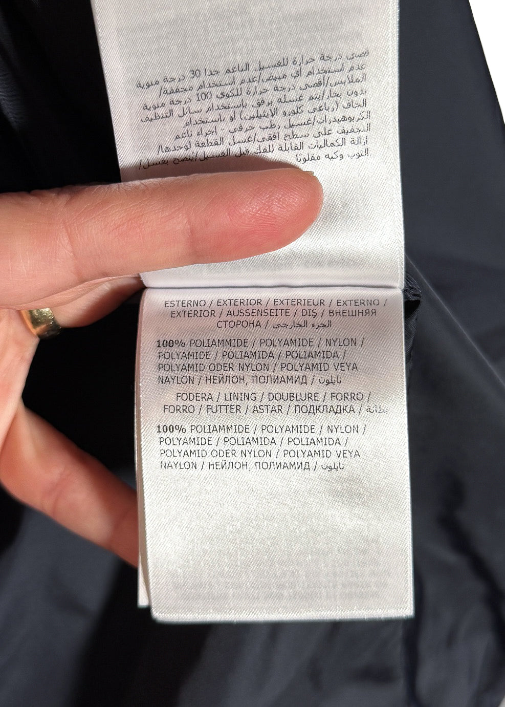 Nylon bleu marine avec léger rembourrage en duvet. Logo Moncler à lettrage ivoire surdimensionné. Col montant. Capuche d’origine manquante. Quincaillerie argentée griffée. Fermeture zippée double sur toute la longueur à l’avant. Breloque triangle d’authenticité Moncler toujours présente. Deux (2) poches latérales zippées. Poignets élastiqués avec pattes ajustables à boutons-pression. Ourlet élastiqué. Doublure intérieure en nylon lisse avec détail tricolore iconique Moncler à l’encolure intérieure au dos. Faite en Roumanie. Article d'occasion.