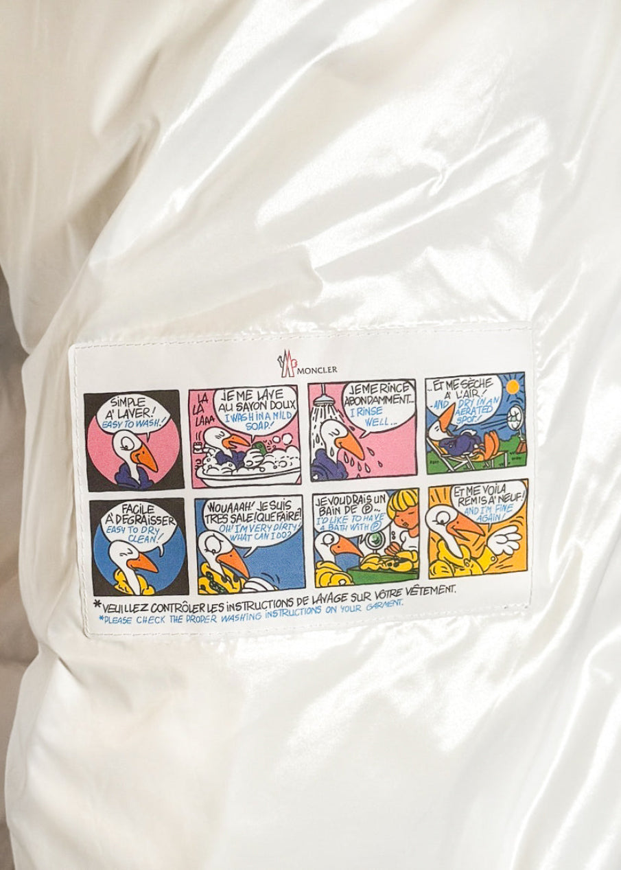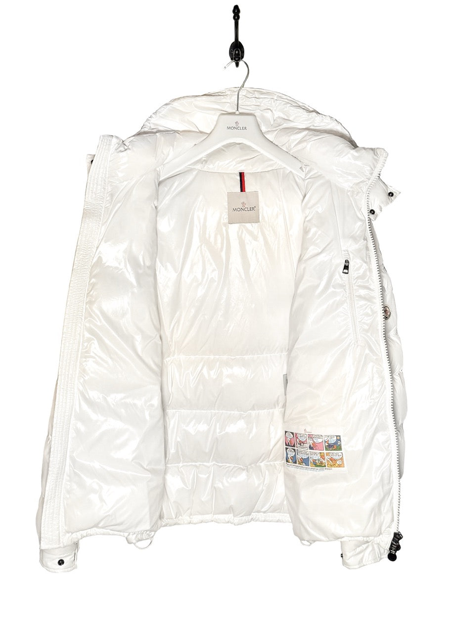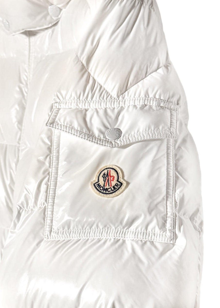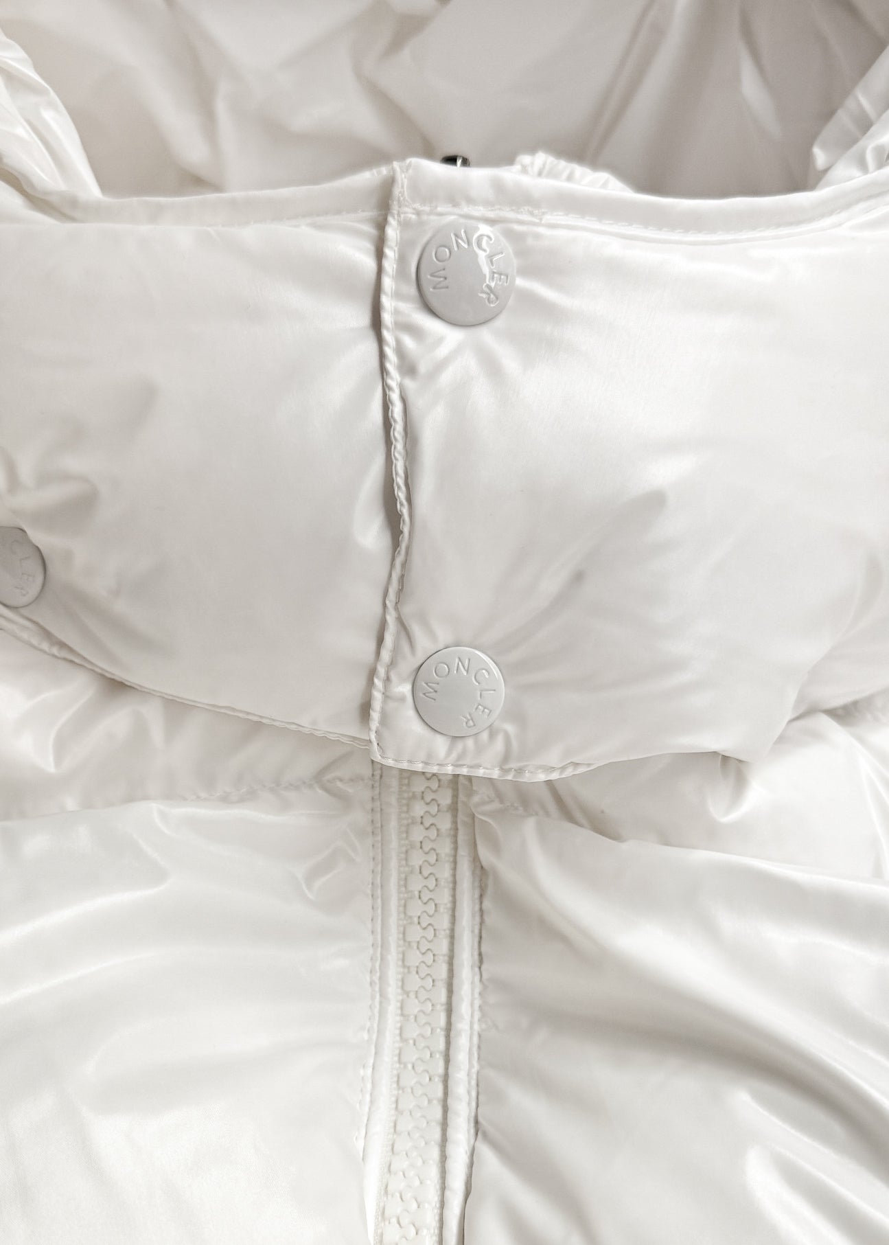 Manteau doudoune matelassée en duvet. Nylon blanc brillant matelassé. Éléments métalliques griffés. Capuche amovible avec boutons-pression et cordons de serrage. Fermeture à double zip épais sur le devant. Deux poches latérales zippées. Poche à rabat à bouton-pression avec logo Moncler en feutre sur la manche. Poignets réglables par boutons-pression. Intérieur entièrement doublé avec étiquette de lavage Moncler et poche zippée. Livré avec les étiquettes d'origine et le ticket de caisse. Fabriqué en Roumanie.