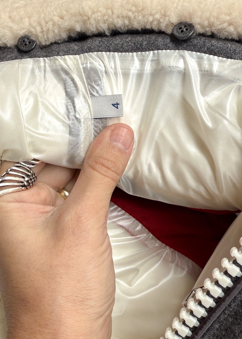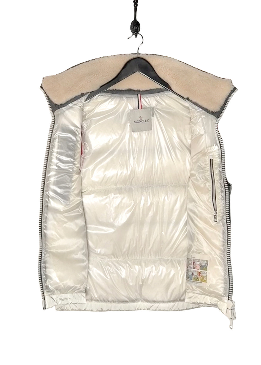 Veste Moncler x Ami Bastien matelassée grise en flanelle avec col en mouton amovible. Finitions contrastantes en nylon ivoire et rouge. Garnissage en duvet d'oie et plumes. Construction matelassée. Col montant doublé d’un empiècement en laine de mouton amovible. Écusson Moncler brodé surdimensionné sur la poitrine. Trois (3) poches zippées à l’avant. Fermeture éclair frontale à double sens avec dents épaisses blanches et tirettes de marque. Intérieur entièrement doublé en nylon brillant ivoire, avec étiquette d’entretien Moncler illustrée. Coupe carrée. Faite en Roumanie.
