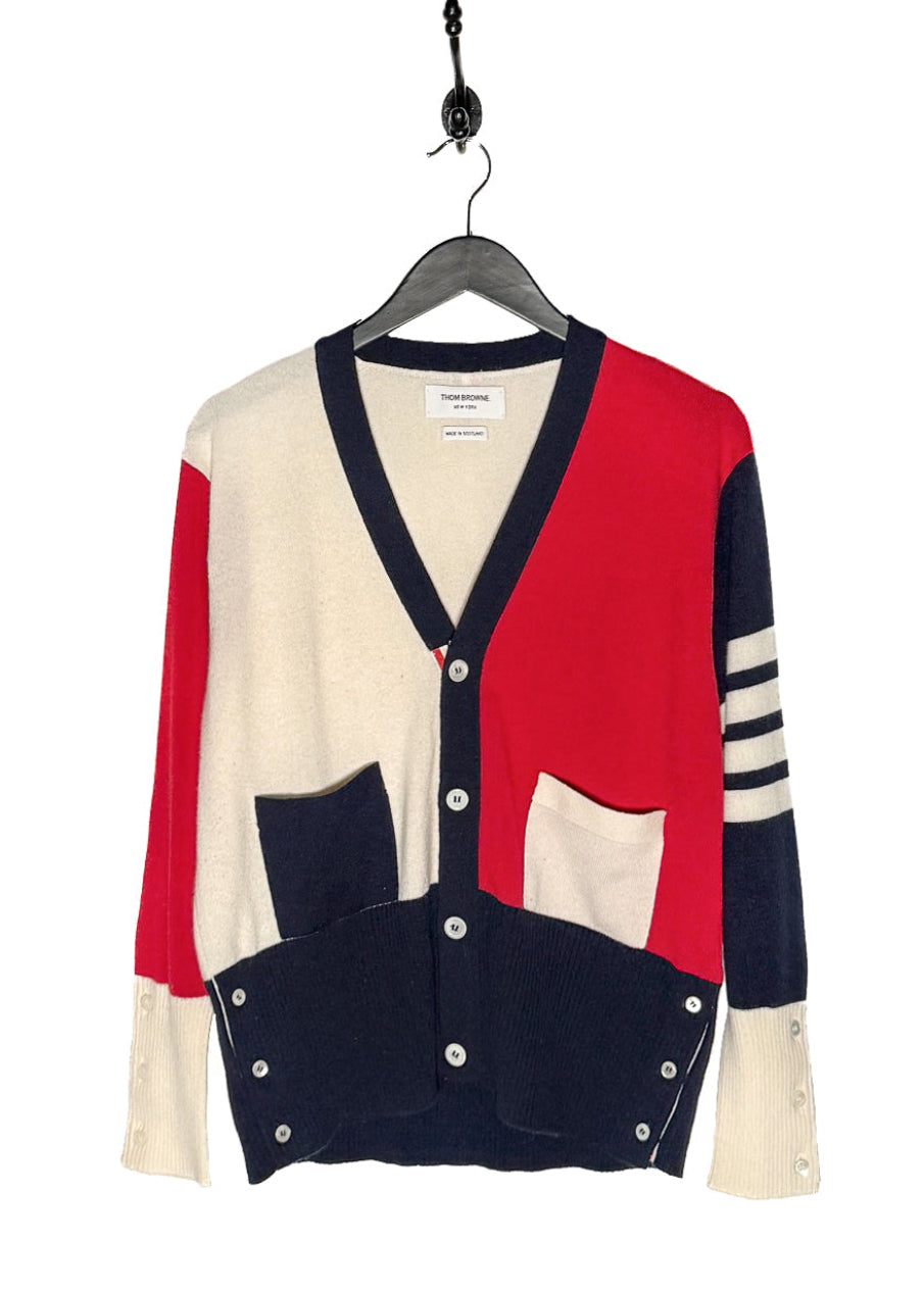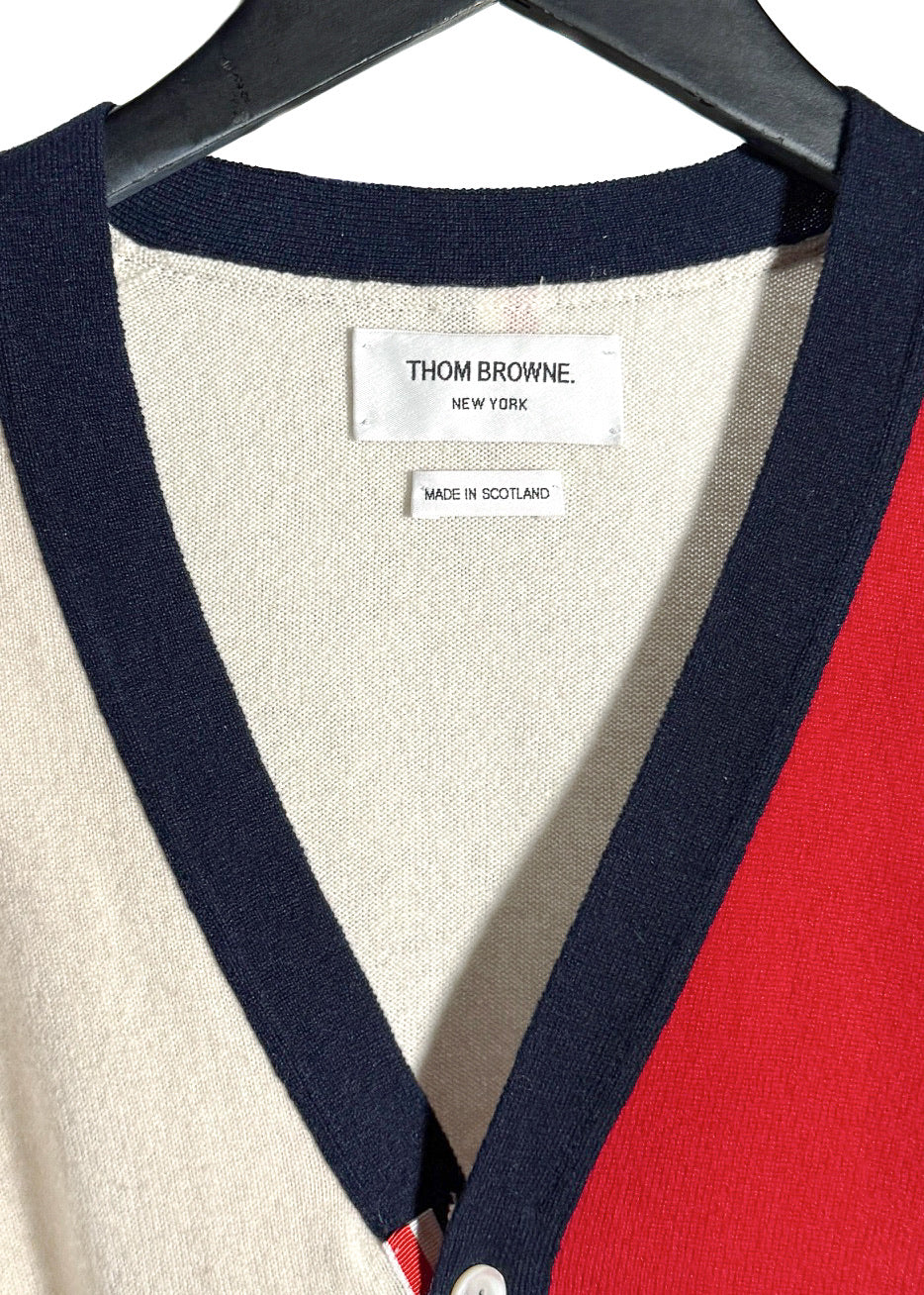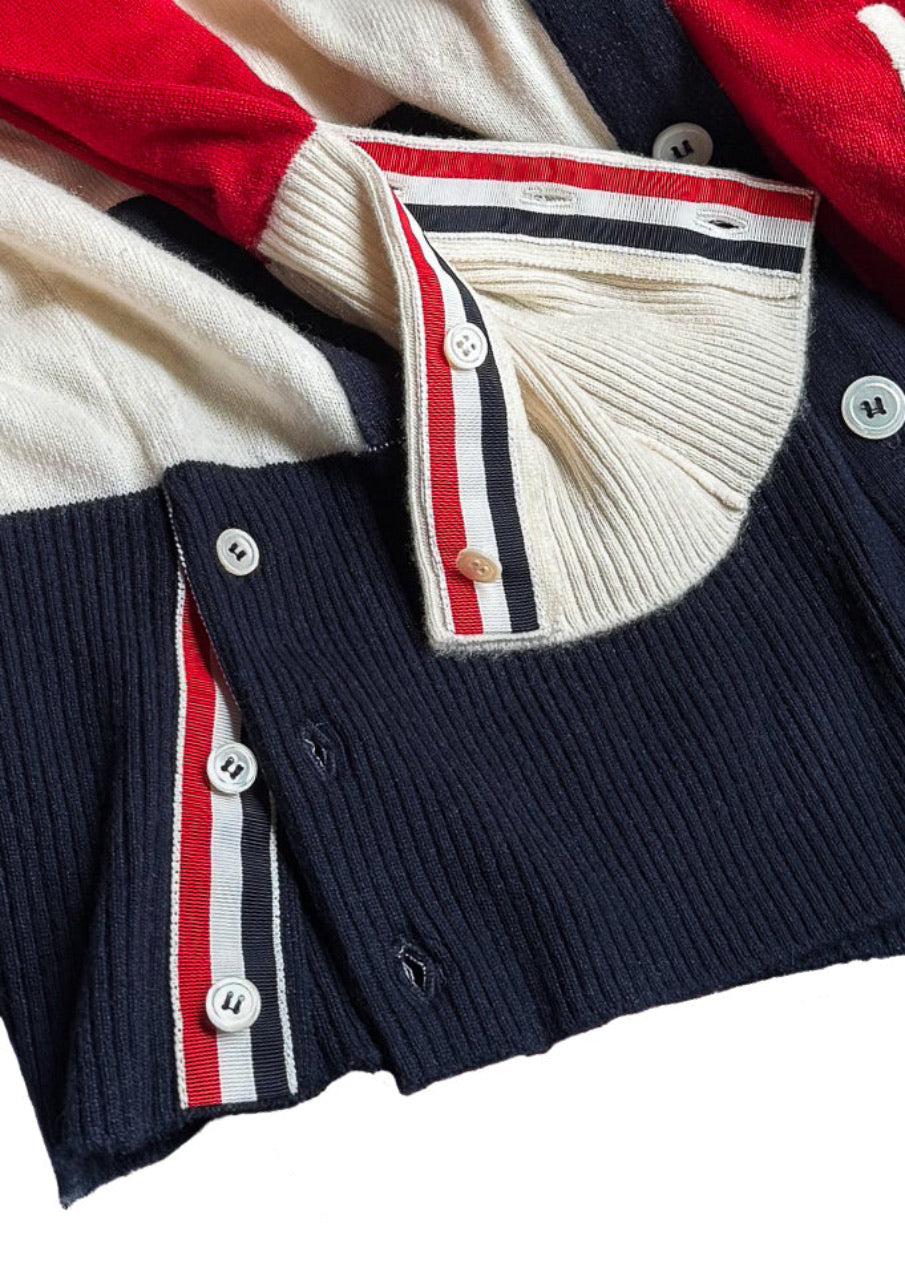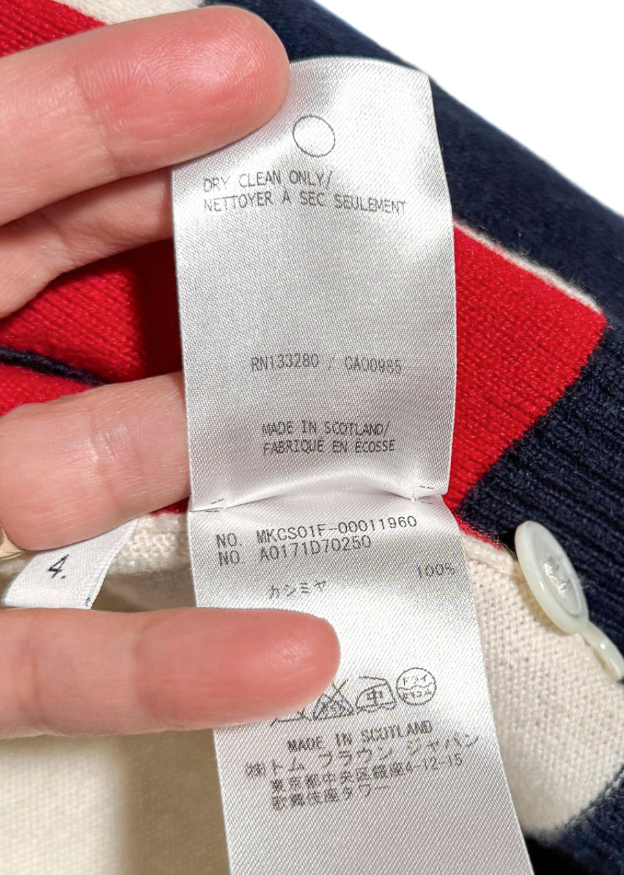 Tricoté en maille fine dans un cachemire souple. Design à blocks de couleurs rouge, marine et ivoire. Encolure en V. Fermeture boutonnée sur le devant. Col, poignets et ourlet en maille côtelée. Poignets avec pattes boutonnées fonctionnelles. Deux (2) poches plaquées à l’avant. Détail emblématique à quatre (4) bandes sur la manche. Finitions en gros-grain tricolore emblématiques le long des pattes de boutonnage et languette en boucle au haut du dos. Ourlet droit. Coupe ajustée. Fait en Écosse.