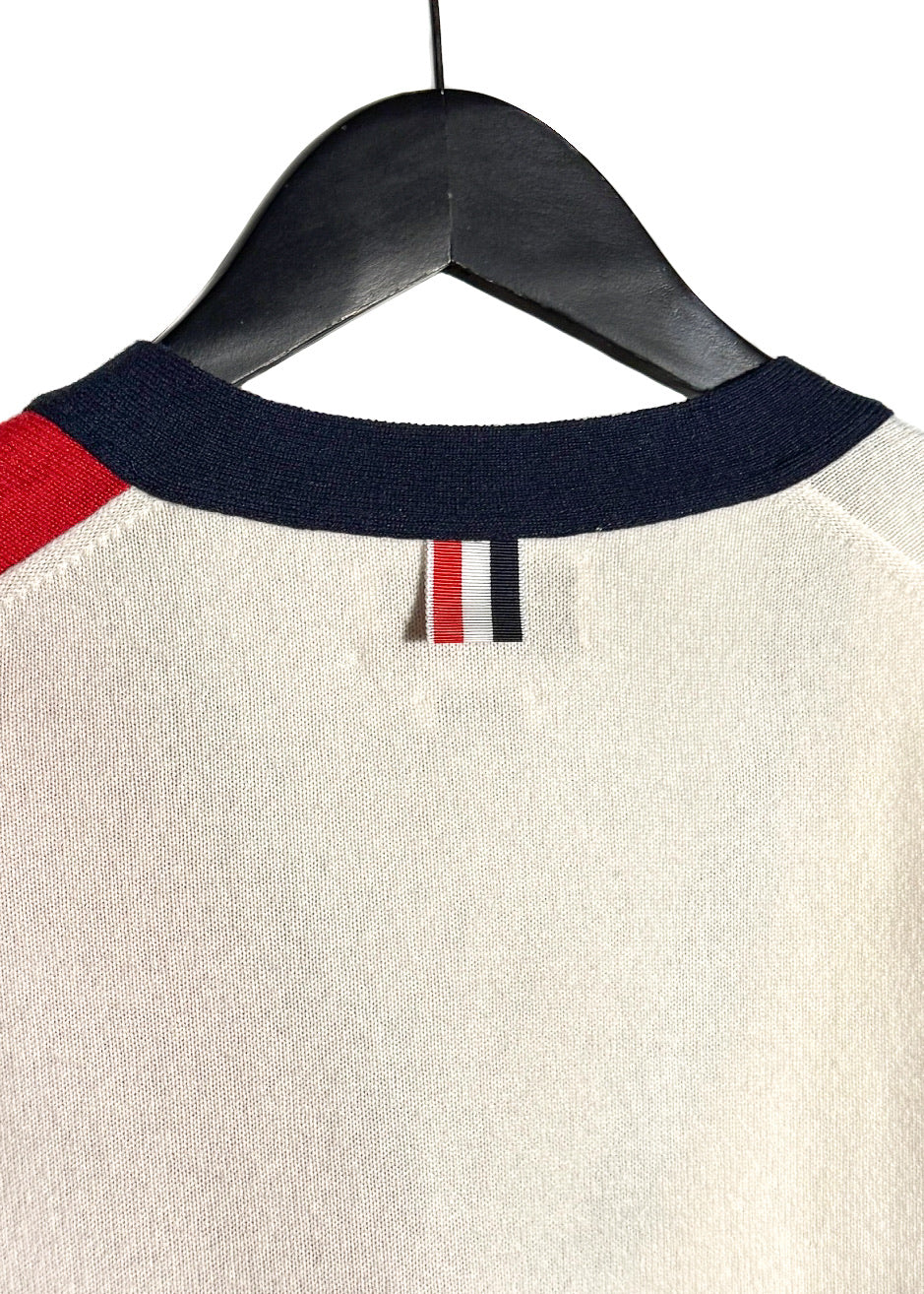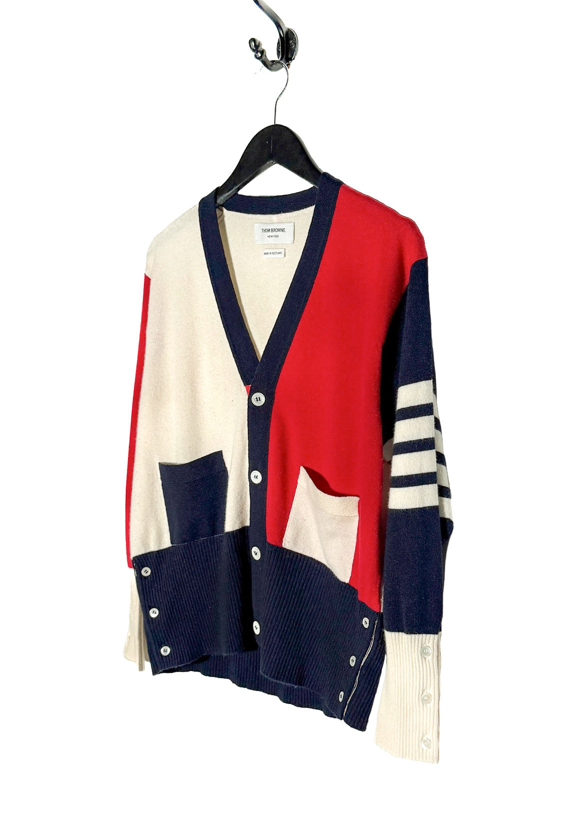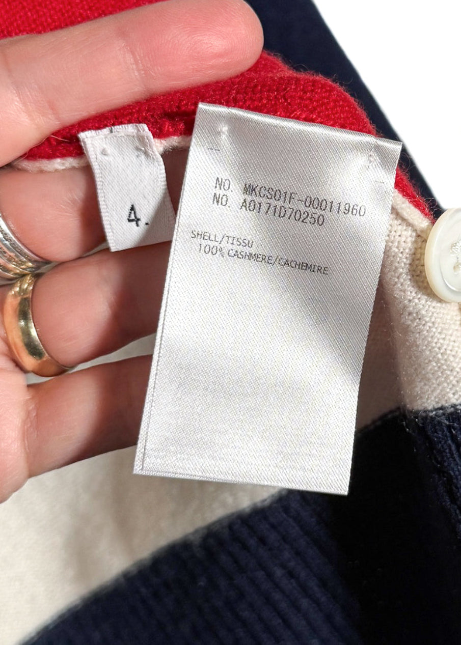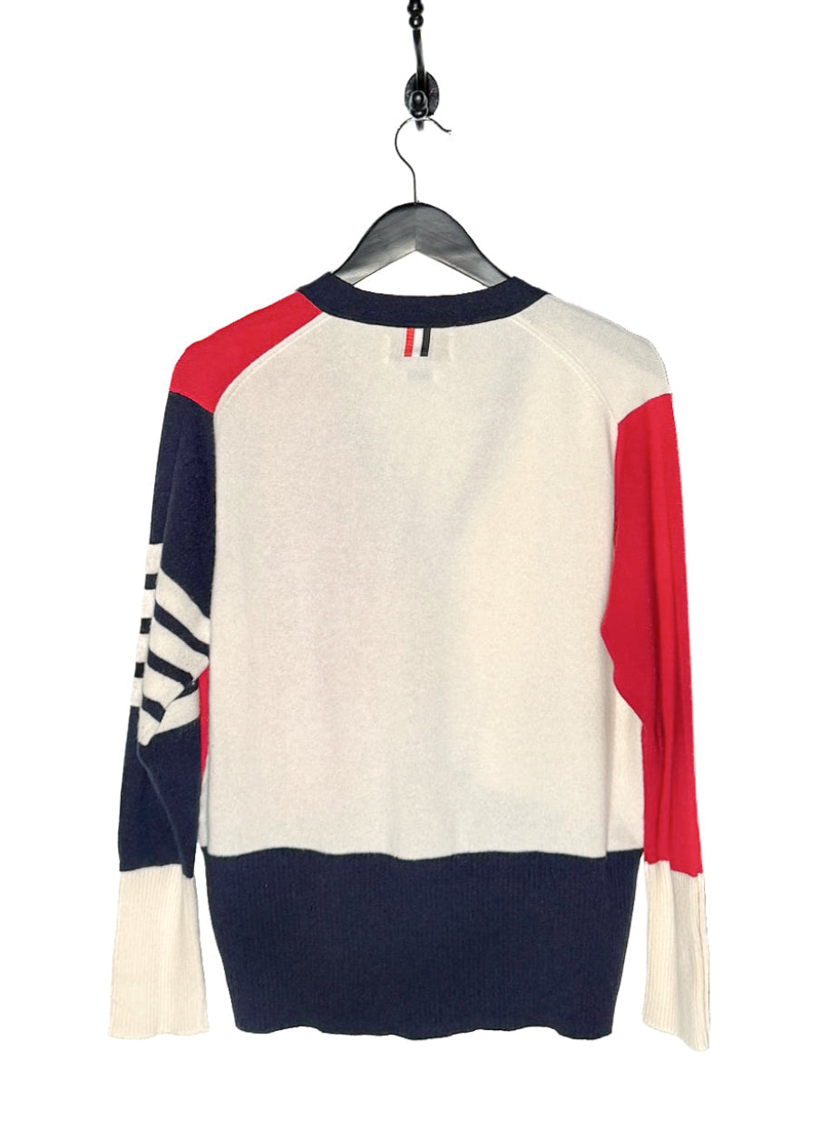 Tricoté en maille fine dans un cachemire souple. Design à blocks de couleurs rouge, marine et ivoire. Encolure en V. Fermeture boutonnée sur le devant. Col, poignets et ourlet en maille côtelée. Poignets avec pattes boutonnées fonctionnelles. Deux (2) poches plaquées à l’avant. Détail emblématique à quatre (4) bandes sur la manche. Finitions en gros-grain tricolore emblématiques le long des pattes de boutonnage et languette en boucle au haut du dos. Ourlet droit. Coupe ajustée. Fait en Écosse.