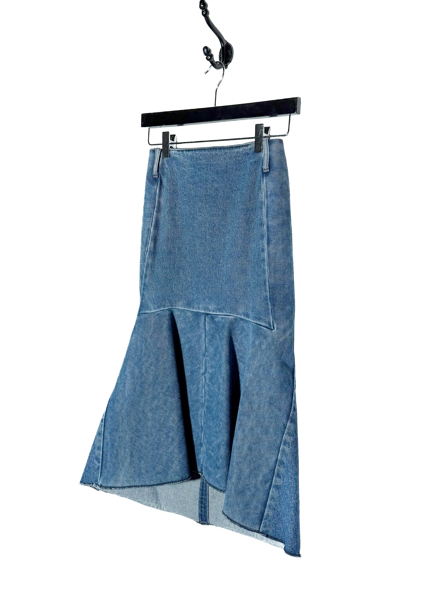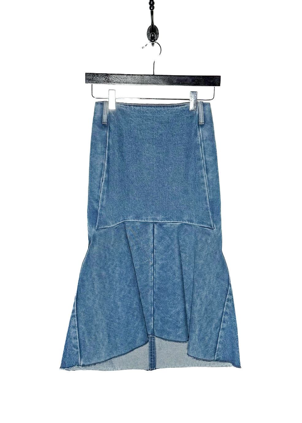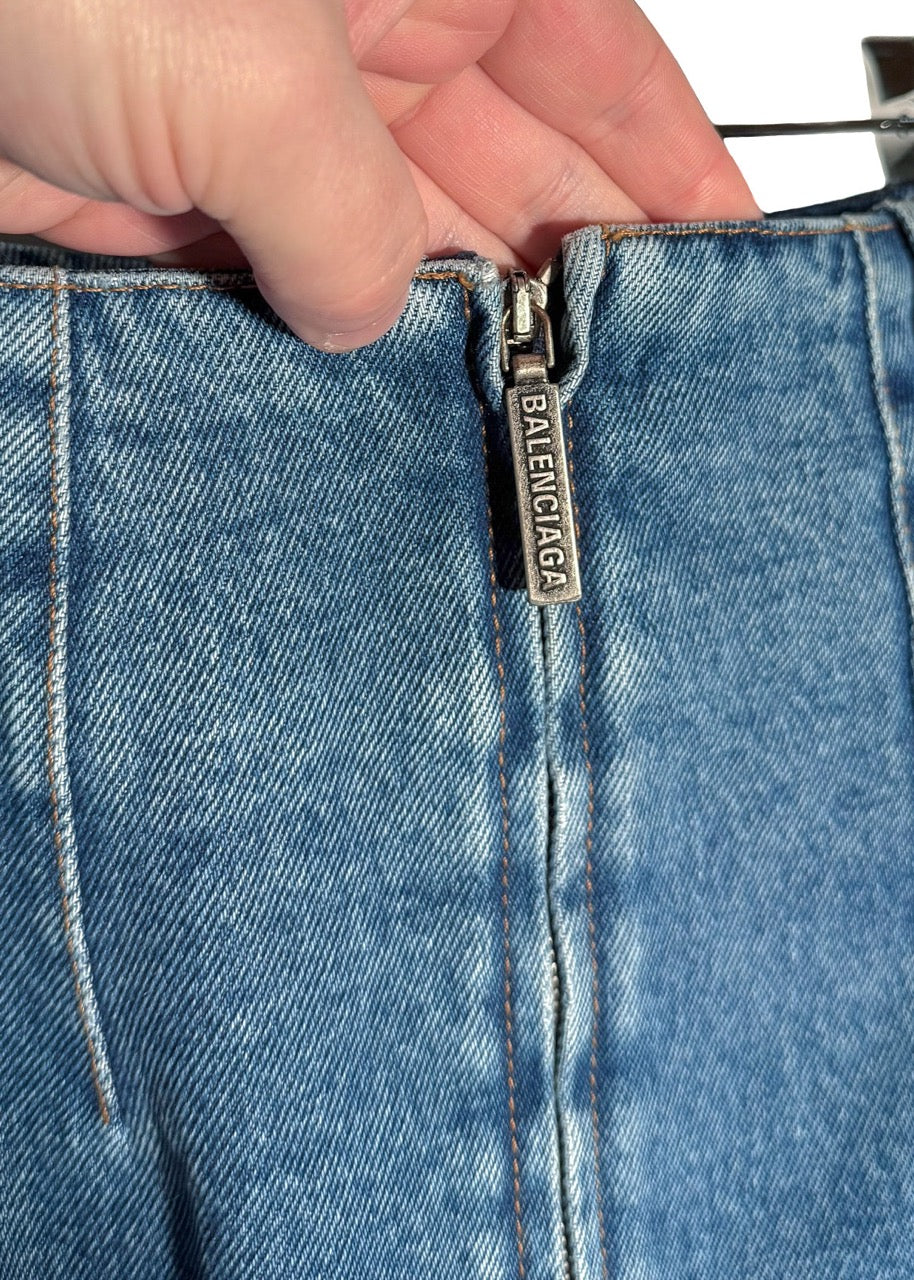 Silhouette structurée taille mi-haute avec partie supérieure ajustée et ourlet évasé type sirène. Denim bleu moyen délavé. Construction à panneaux avec coutures de mise en forme. Panneaux inférieurs et latéraux renforcés avec entoilage pour la structure. Ourlet brut. Fermeture zippée au dos avec tirette gravée Balenciaga. Collection Printemps Été 2018. Faite en Italie.