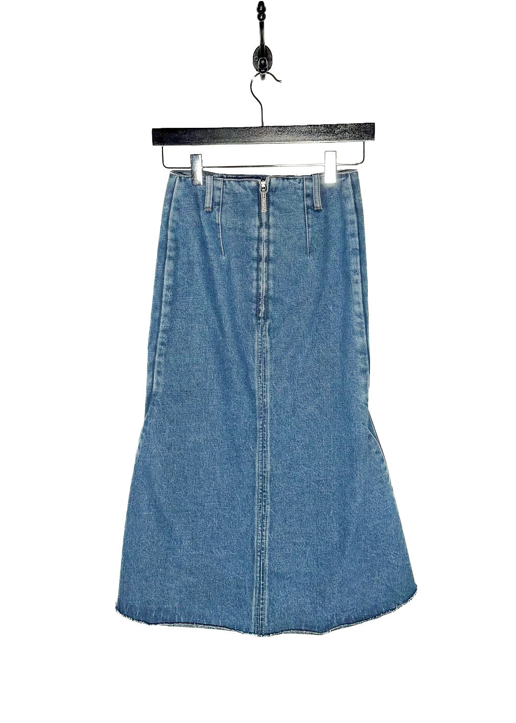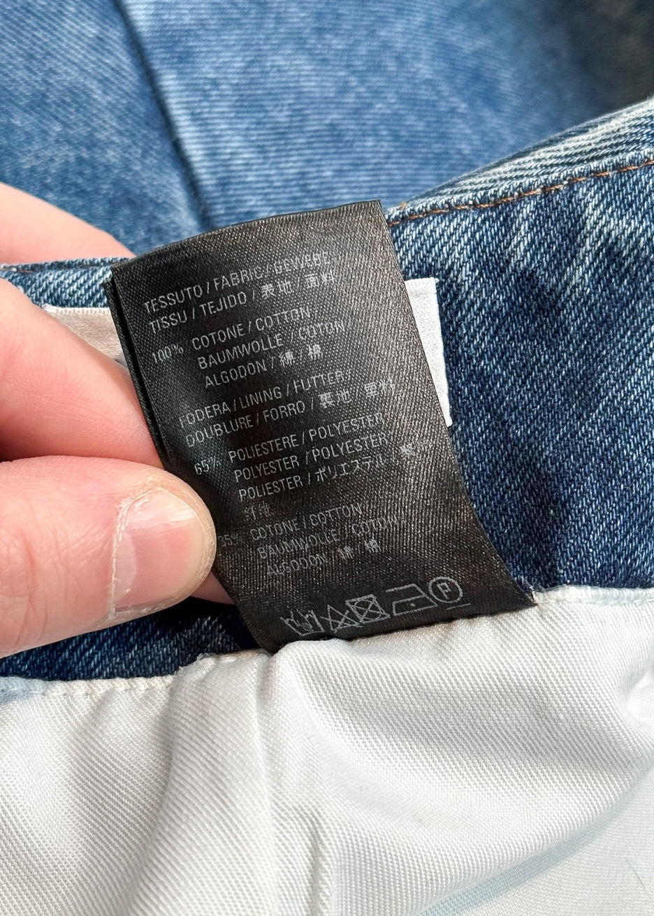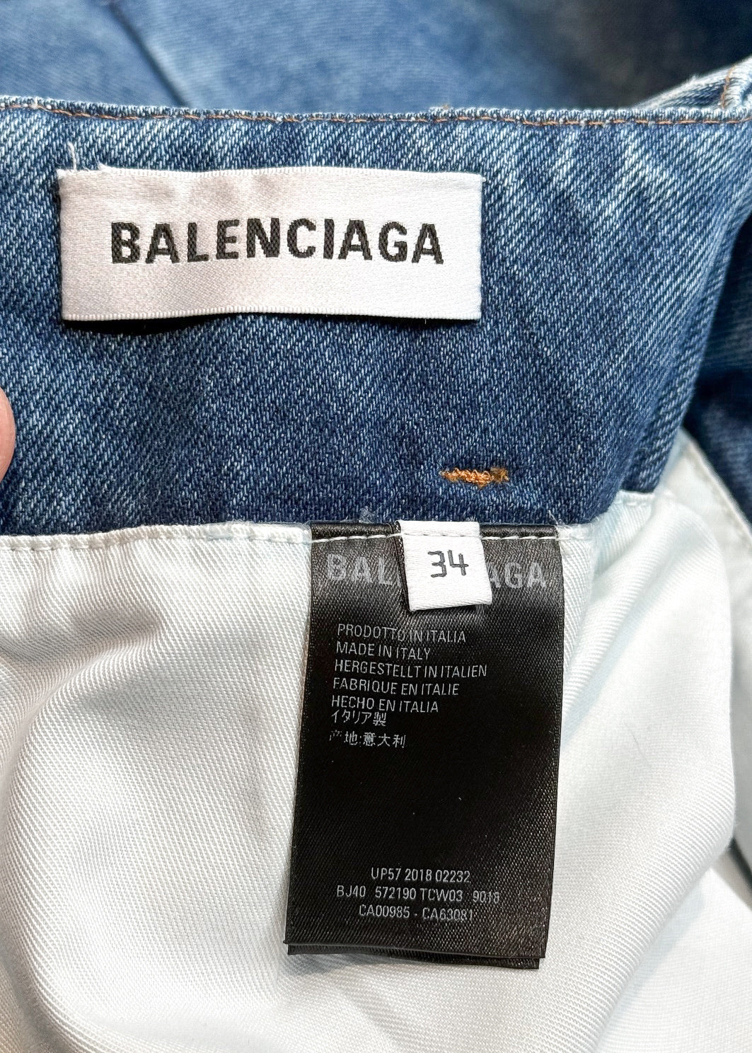 Silhouette structurée taille mi-haute avec partie supérieure ajustée et ourlet évasé type sirène. Denim bleu moyen délavé. Construction à panneaux avec coutures de mise en forme. Panneaux inférieurs et latéraux renforcés avec entoilage pour la structure. Ourlet brut. Fermeture zippée au dos avec tirette gravée Balenciaga. Collection Printemps Été 2018. Faite en Italie.
