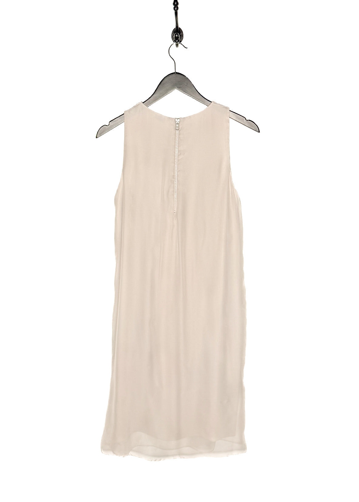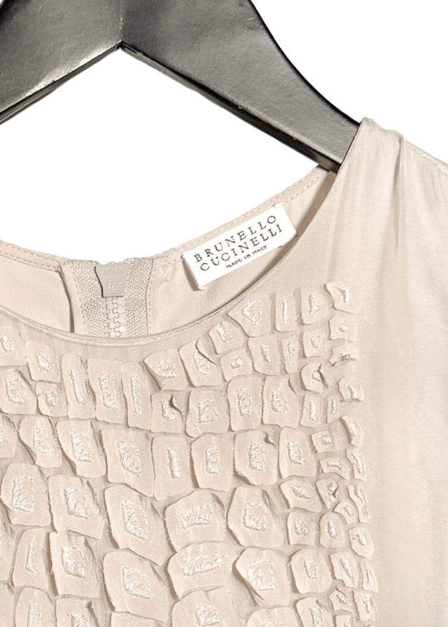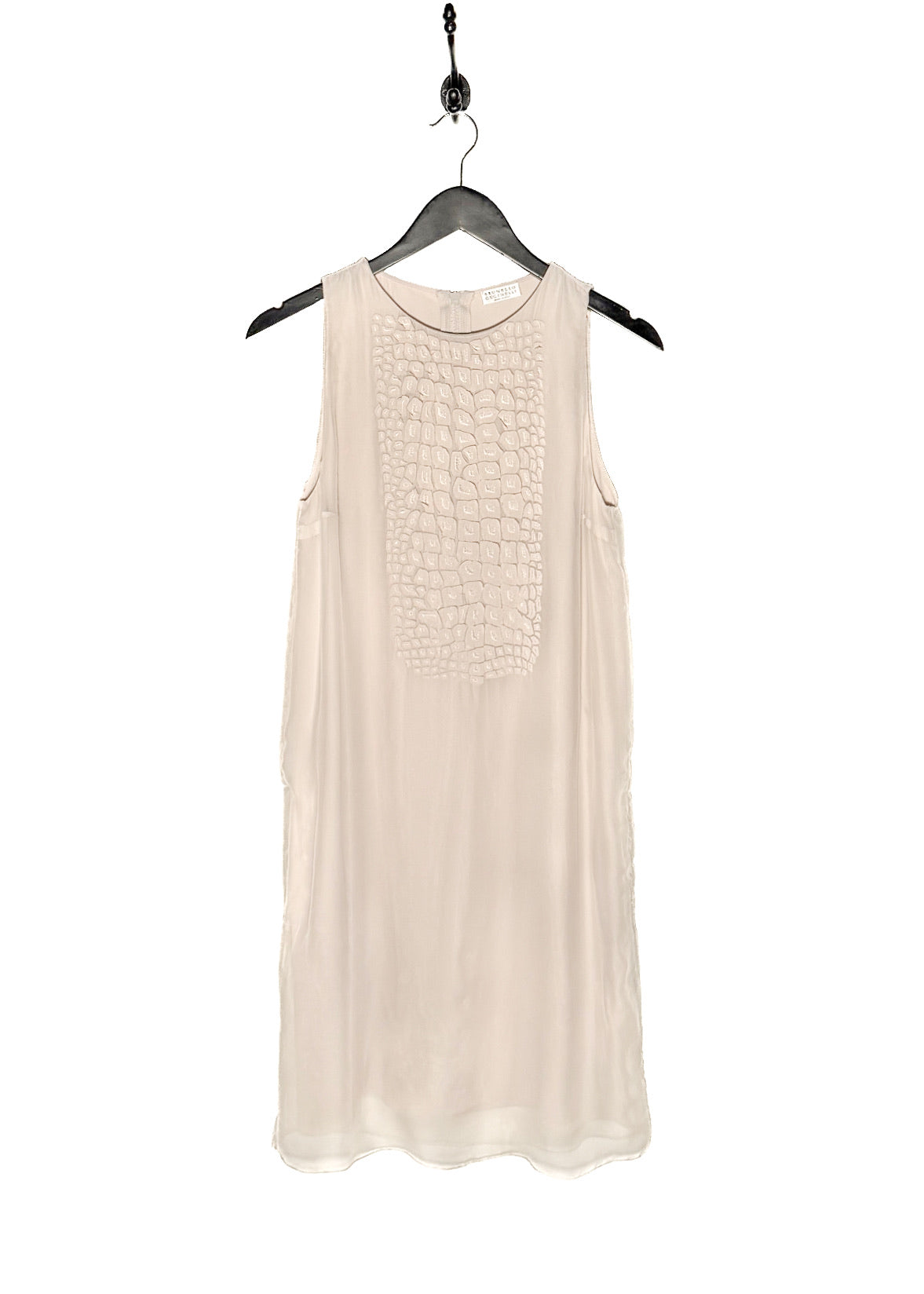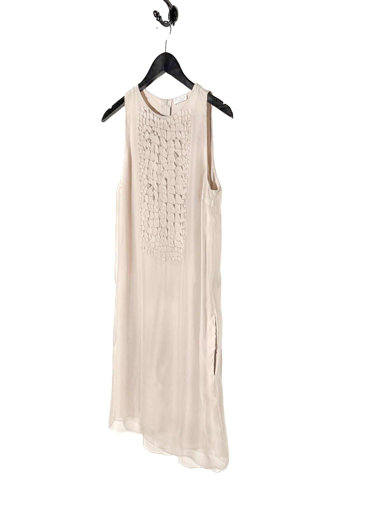 Coupe droite de type shift sans manches. Longueur au genou. Textile en soie léger avec tombé fluide. Panneau avant avec appliqué en relief ton sur ton composé de petits patchs de soie irréguliers, cousus individuellement, créant une finition texturée tridimensionnelle. Encolure ronde. Poches latérales. Fermeture à glissière au dos. Dos épuré. Faite en Italie.