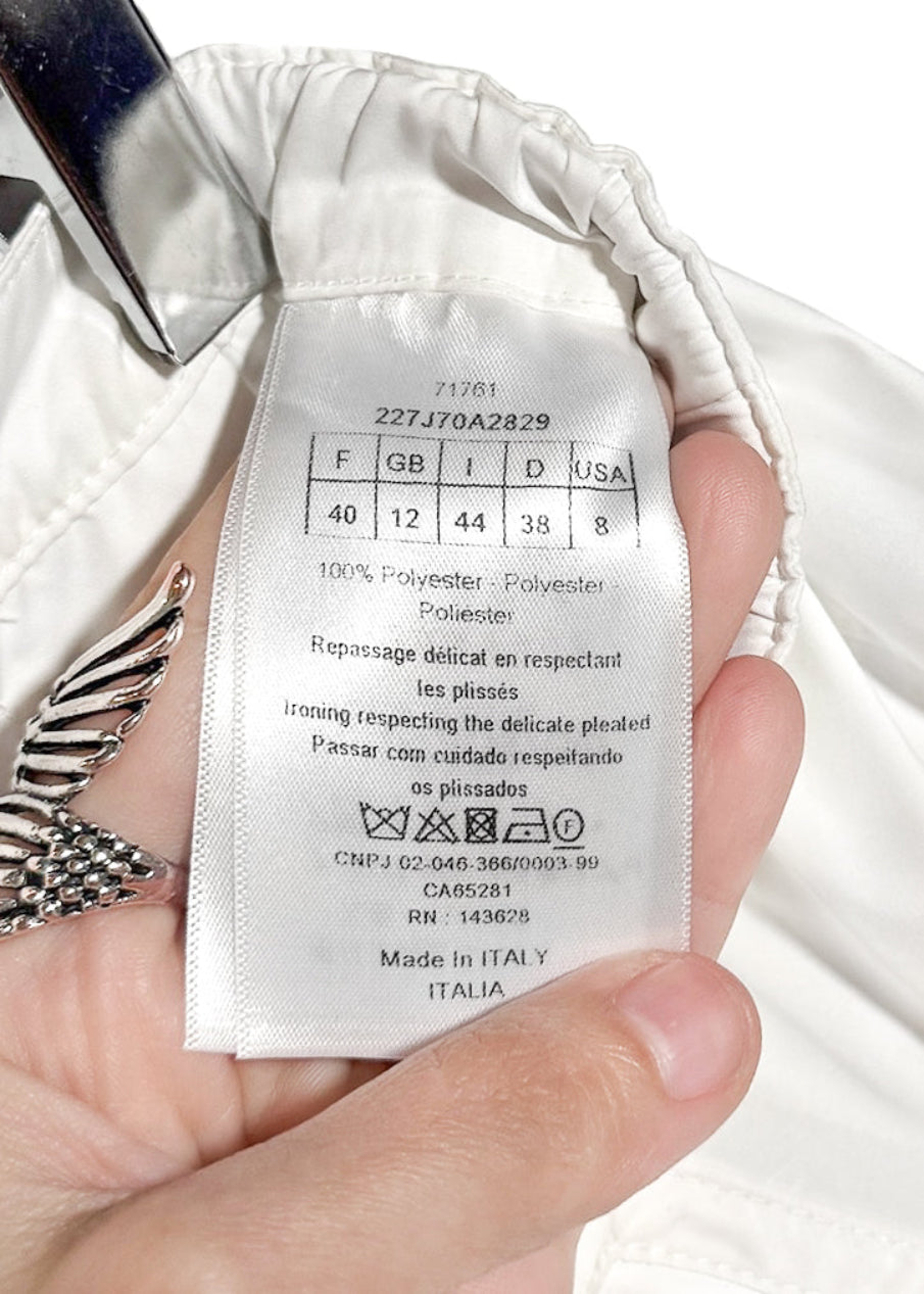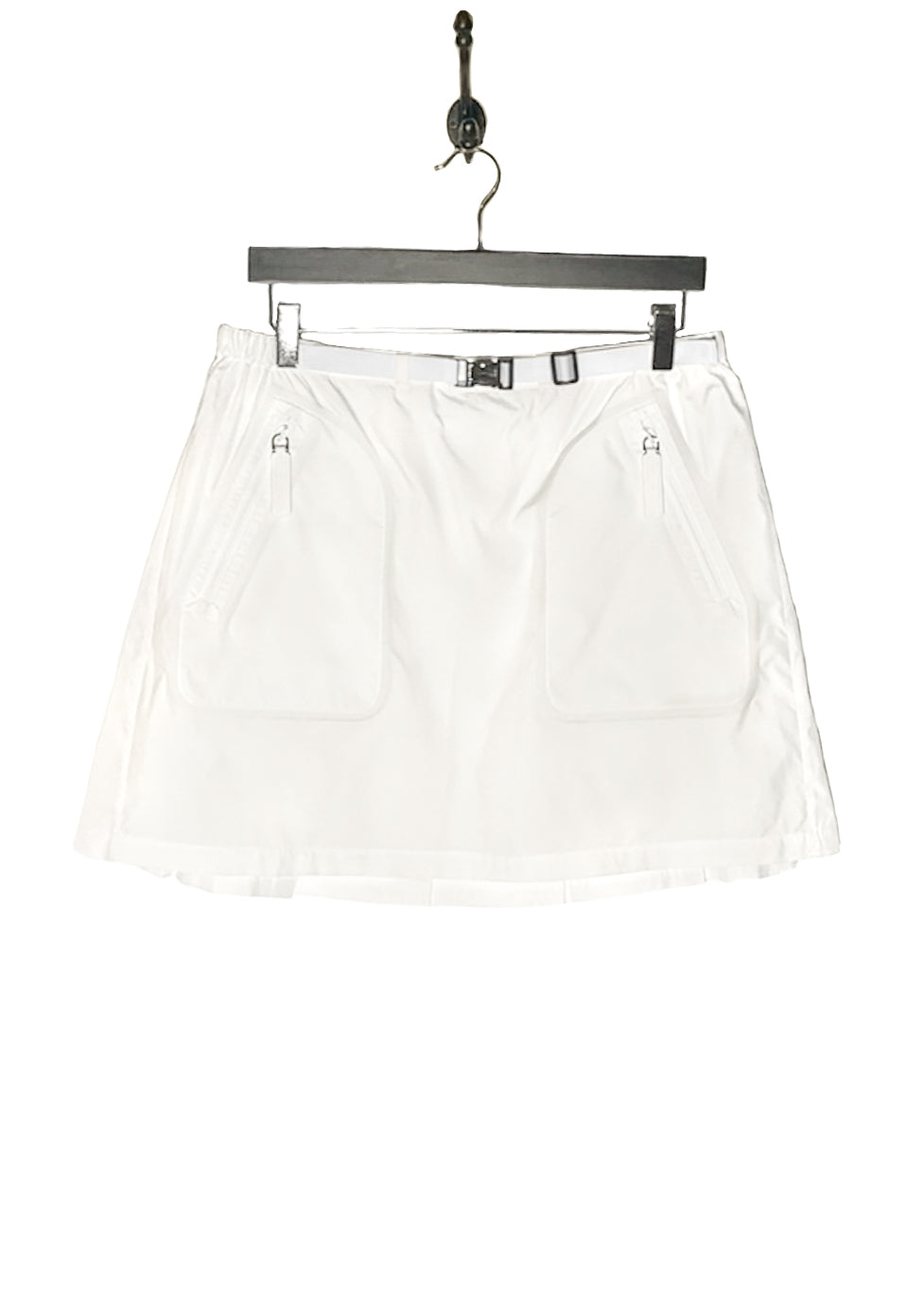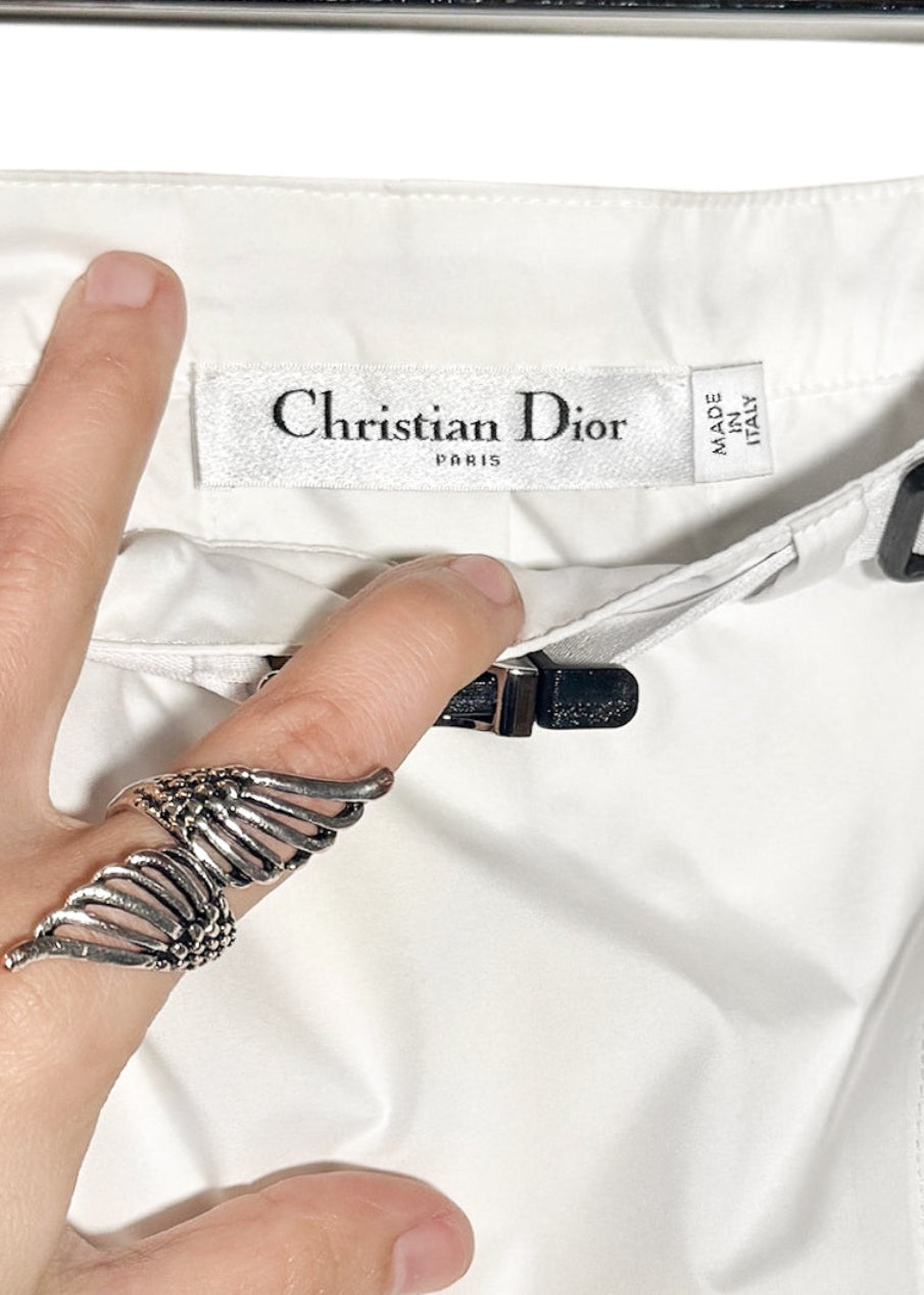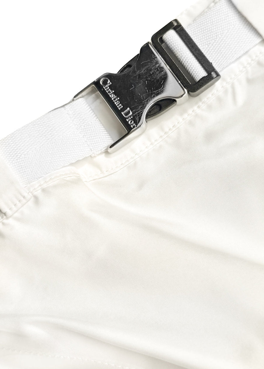 Design utilitaire technique longueur mini en textile blanc léger. Inspiration tennis. Ceinture ajustable avec boucle métallique Christian Dior gravée. Taille élastiquée. Poches zippées en biais avec tirettes Christian Dior embossées. Devant plat. Plis arrière. Faite en Italie.
