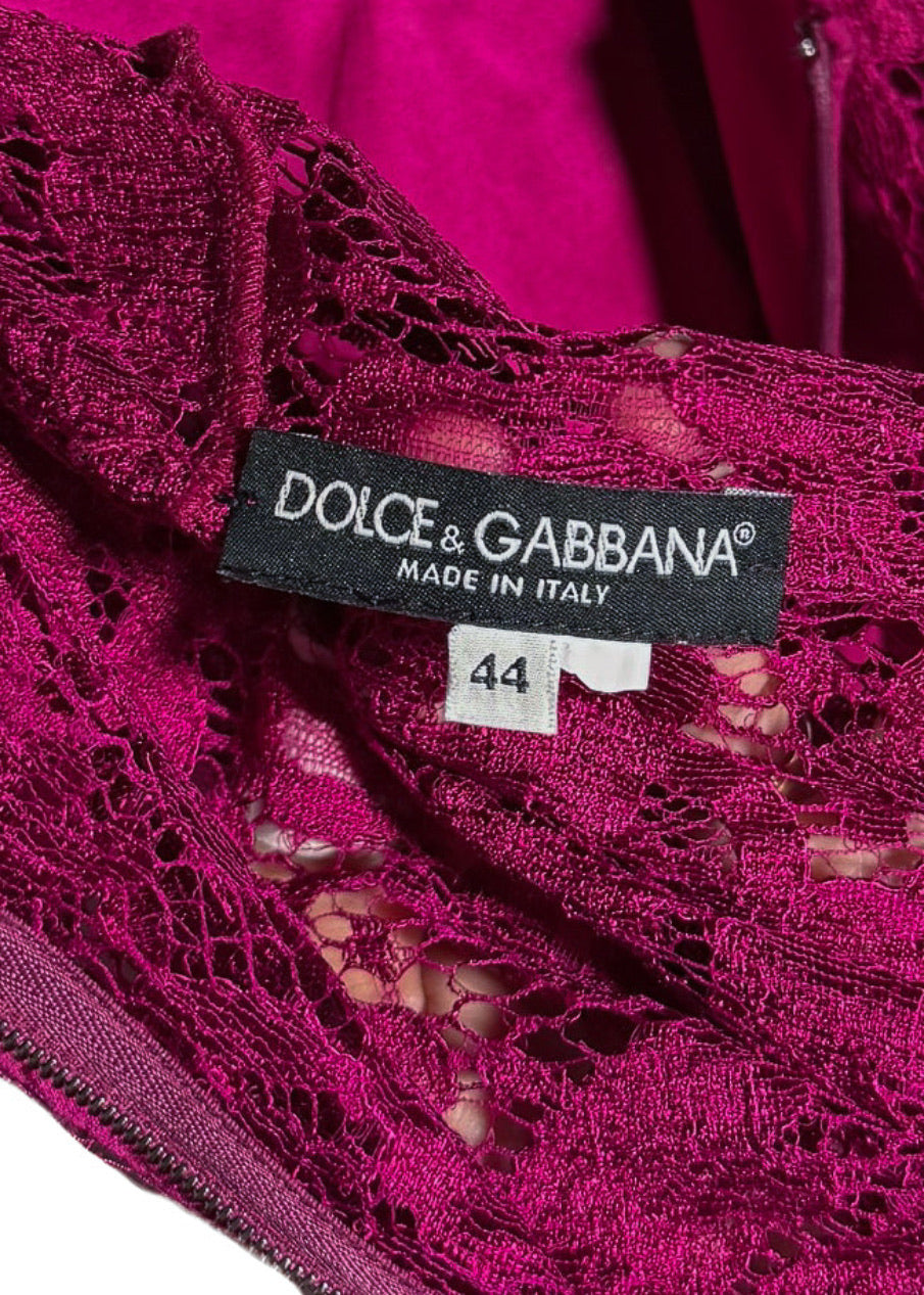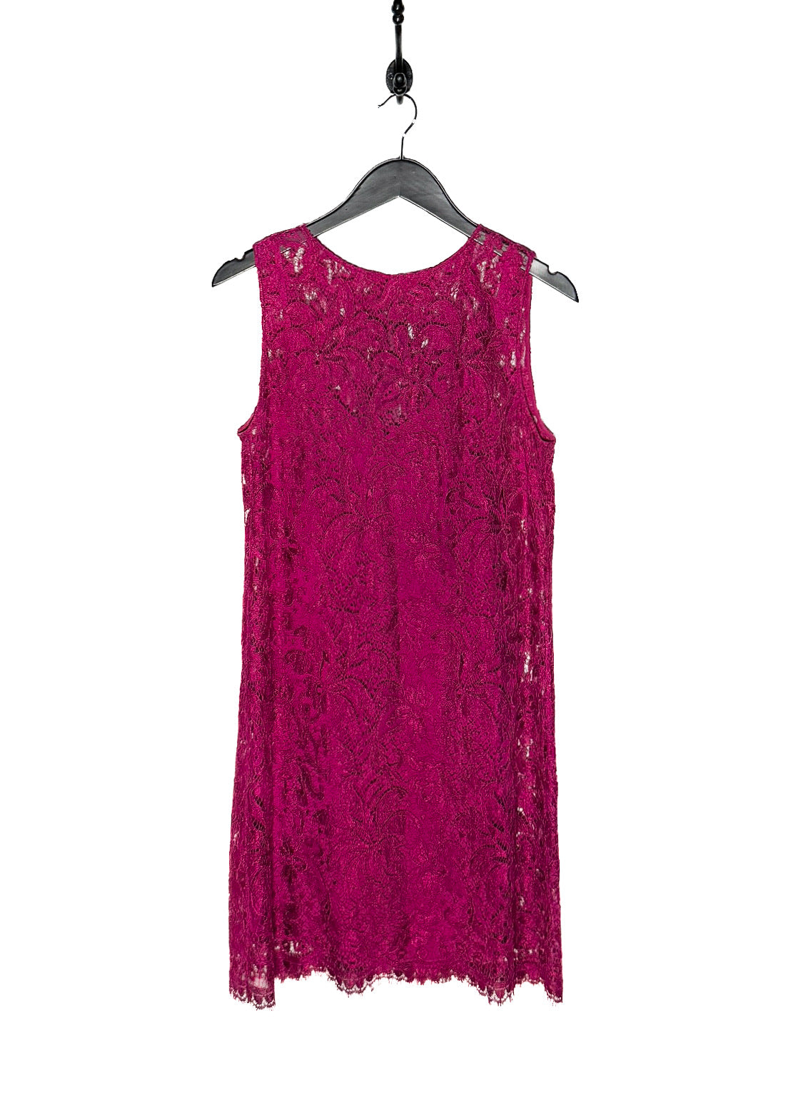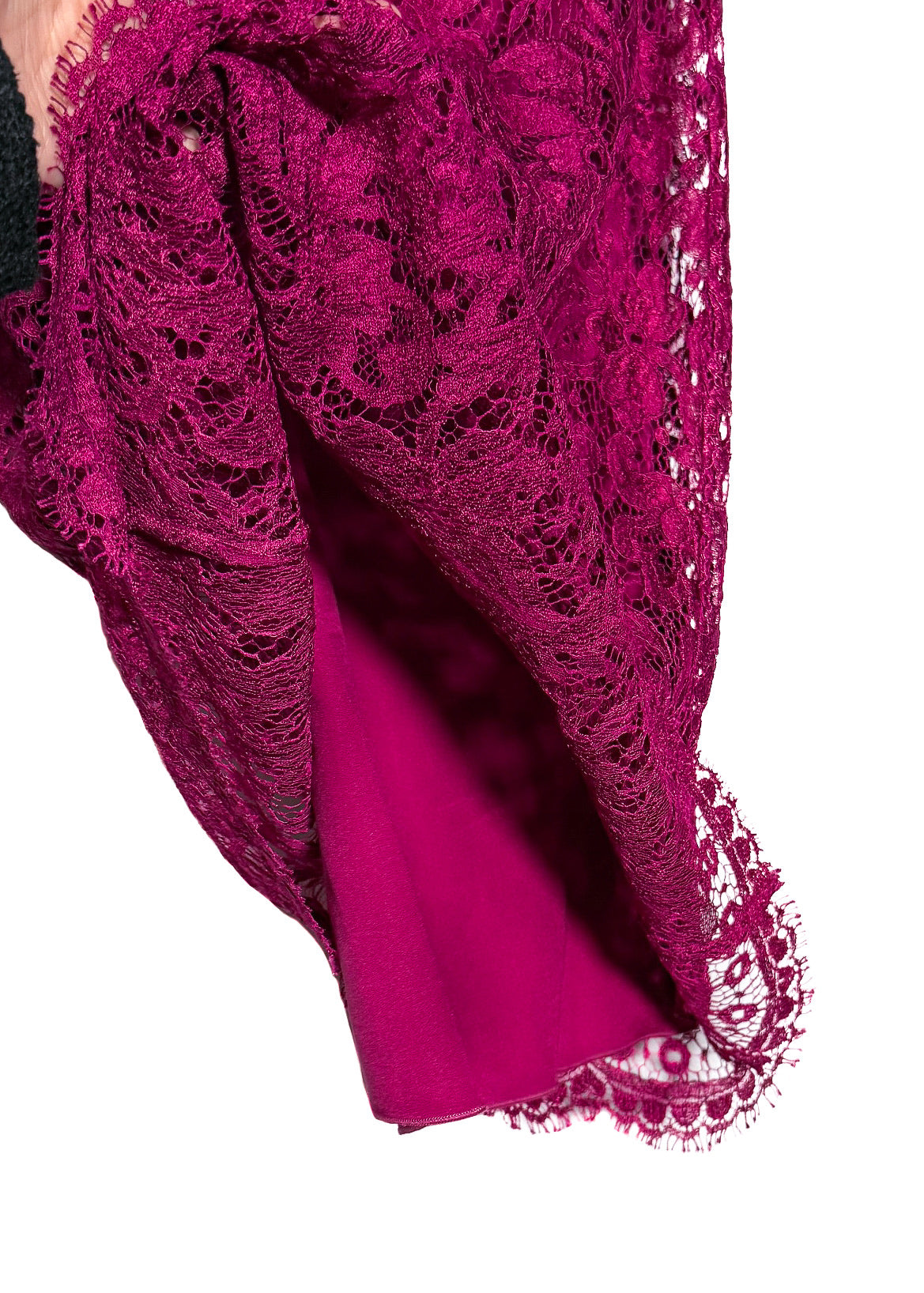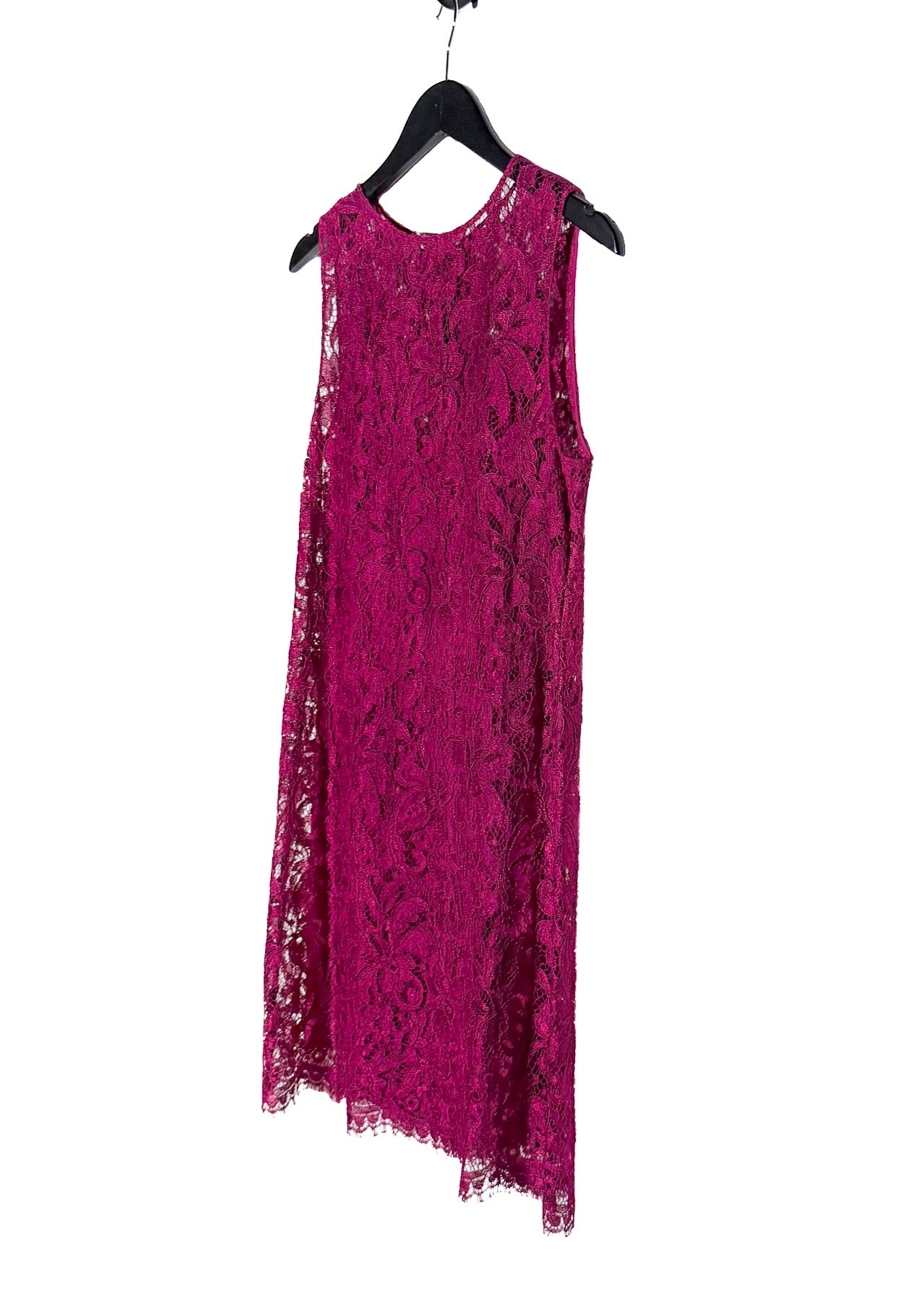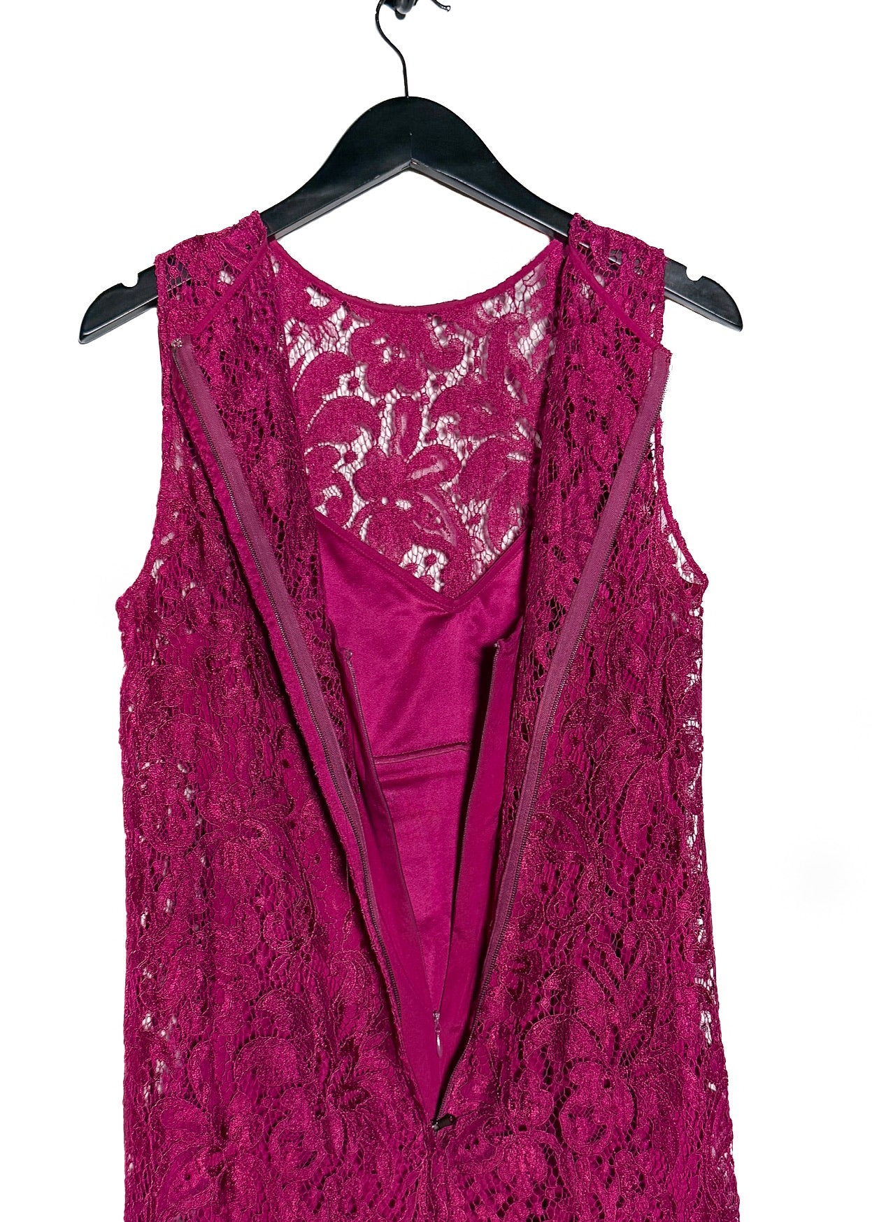 Robe mi-longue entièrement en dentelle. Couleur magenta profond et riche. Coupe droite. Sans manches. Encolure ronde. Fermeture éclair invisible au dos. Ourlet festonné en dentelle. Superposition de dentelle transparente avec doublure en satin ton sur ton intégrée. Emmanchures et encolure ronde aux finitions soignées. Fabriquée en Italie.