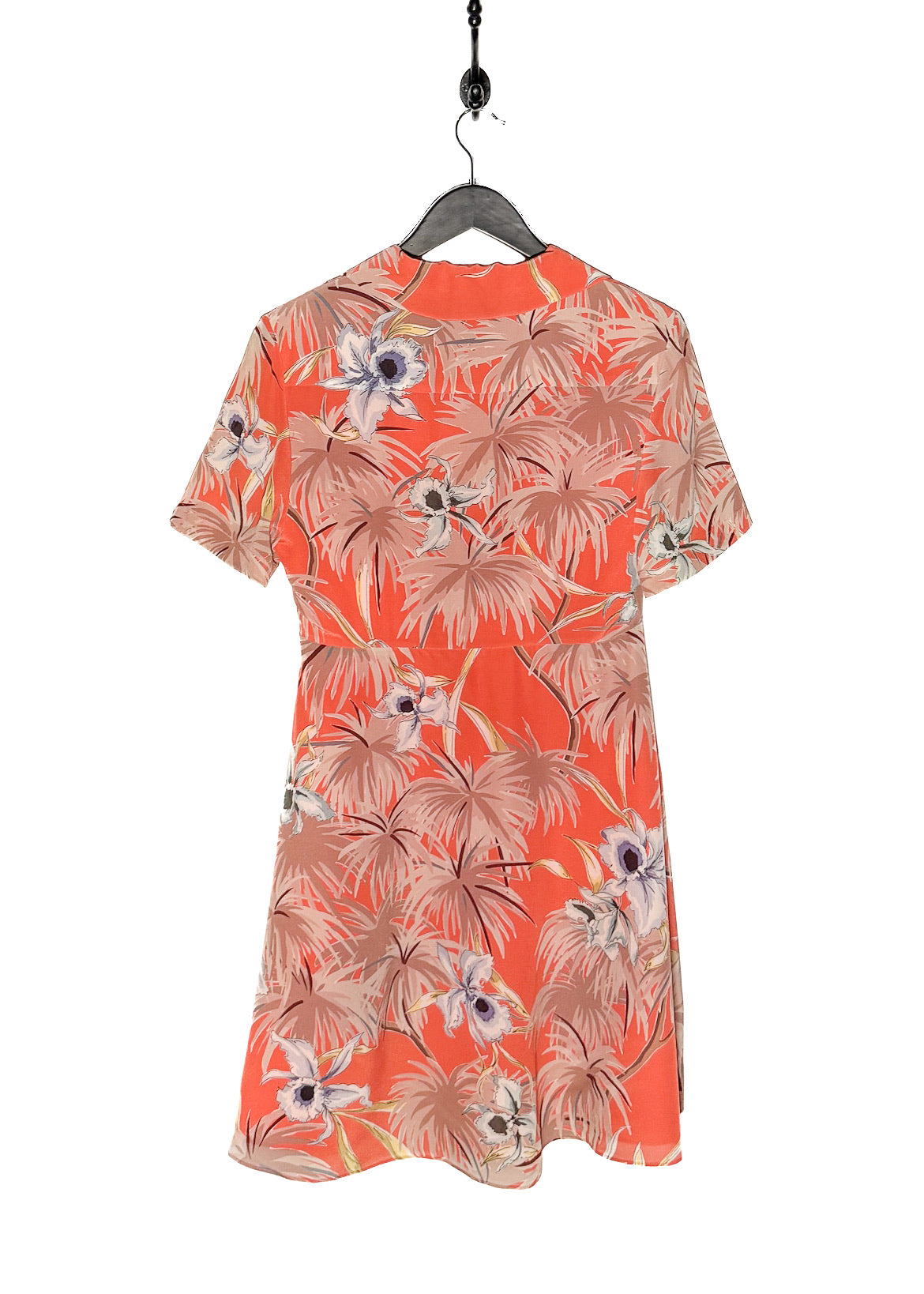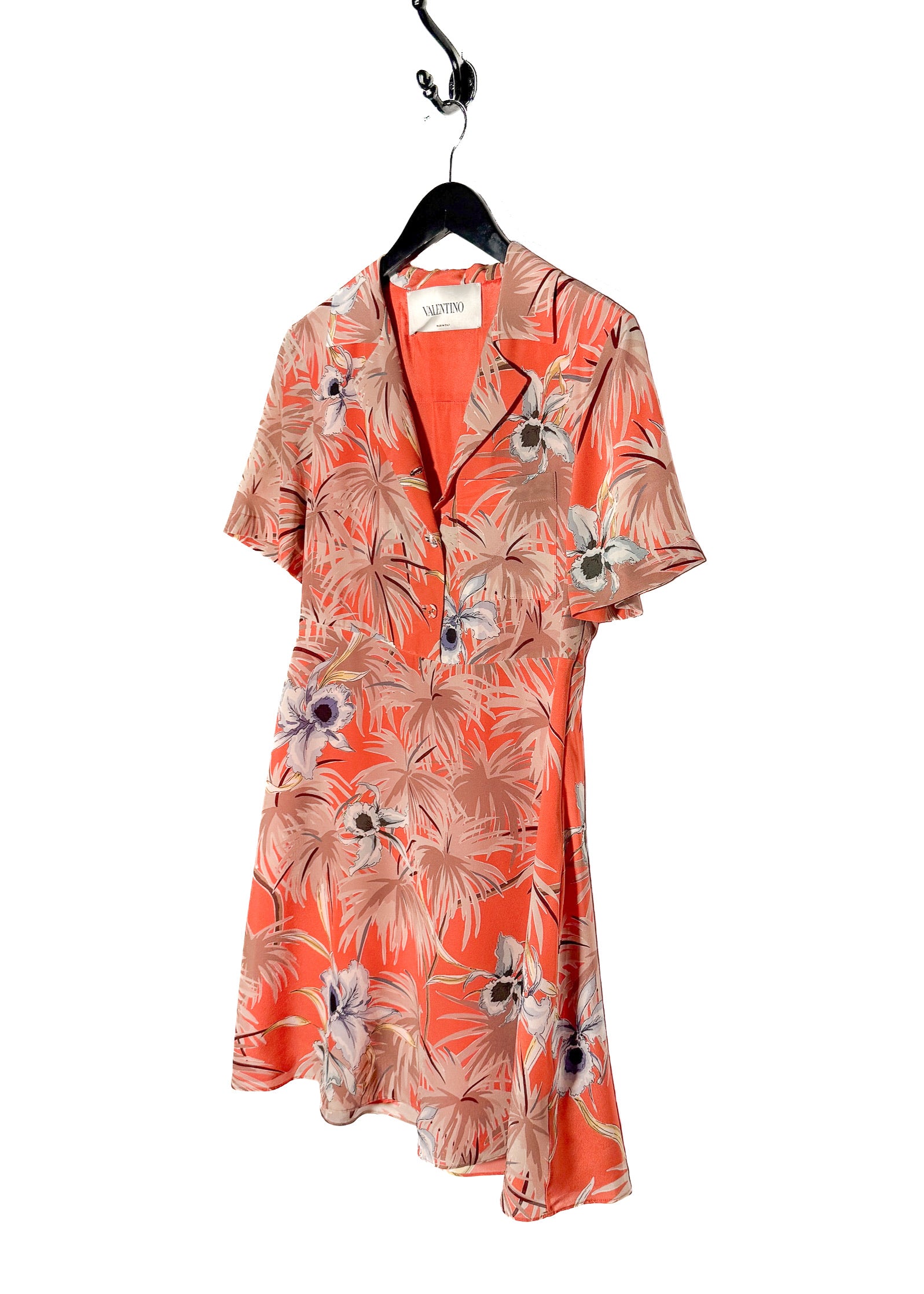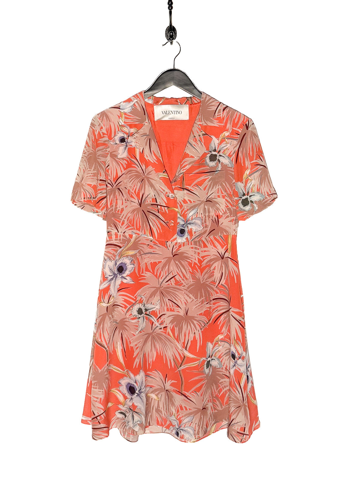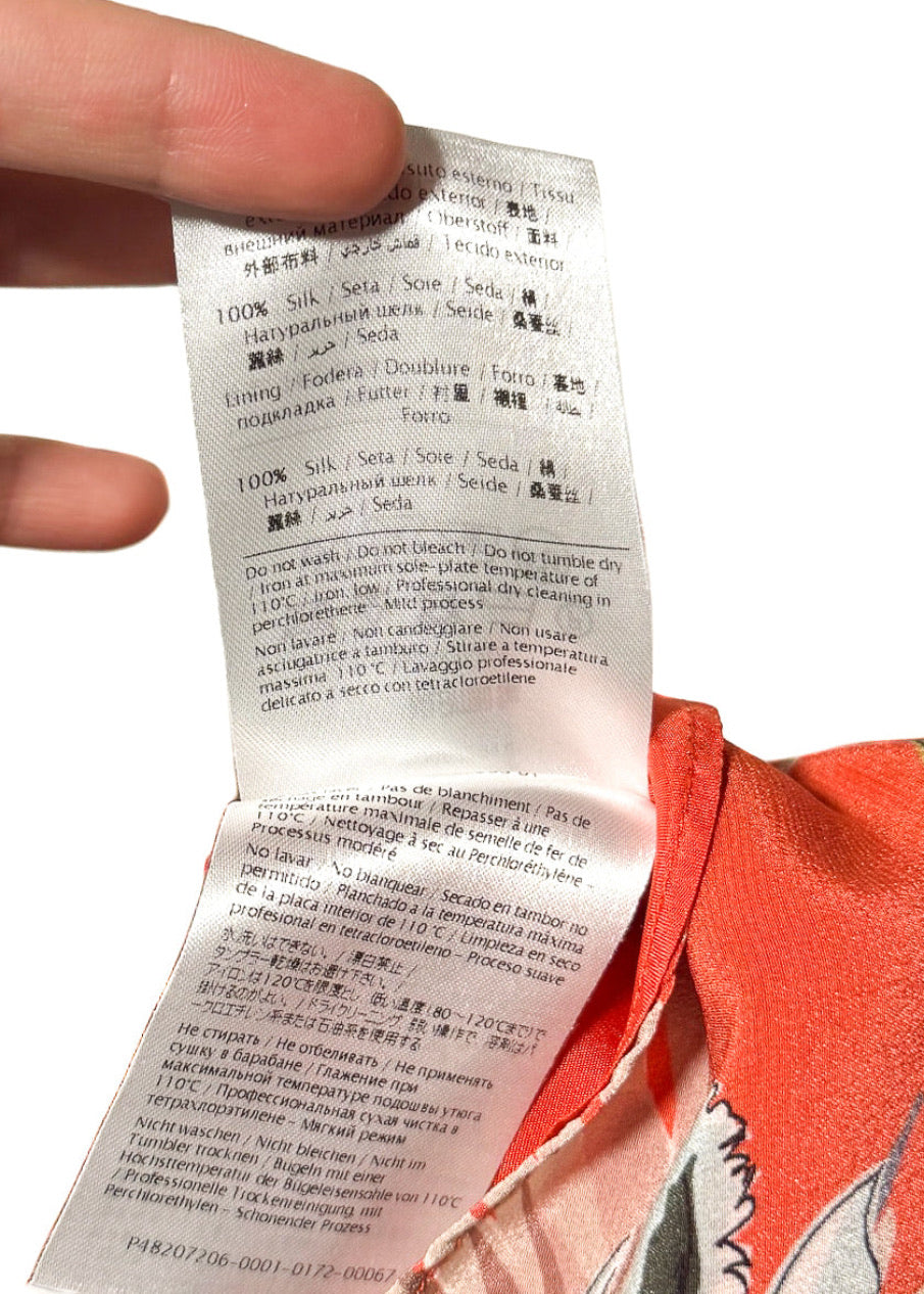 Soie légère avec imprimé floral tropical sur l’ensemble, dans des tons d’orange, de beige et de neutres doux. Encolure en V avec revers crantés et fermeture boutonnée à l’avant. Boutons recouverts de tissu. Manches courtes volantées. Couture de taille marquée. Fermeture zippée sur le côté. Poche poitrine passepoilée. Jupe fluide au-dessus du genou. Entièrement doublée en soie. Faite en Italie.