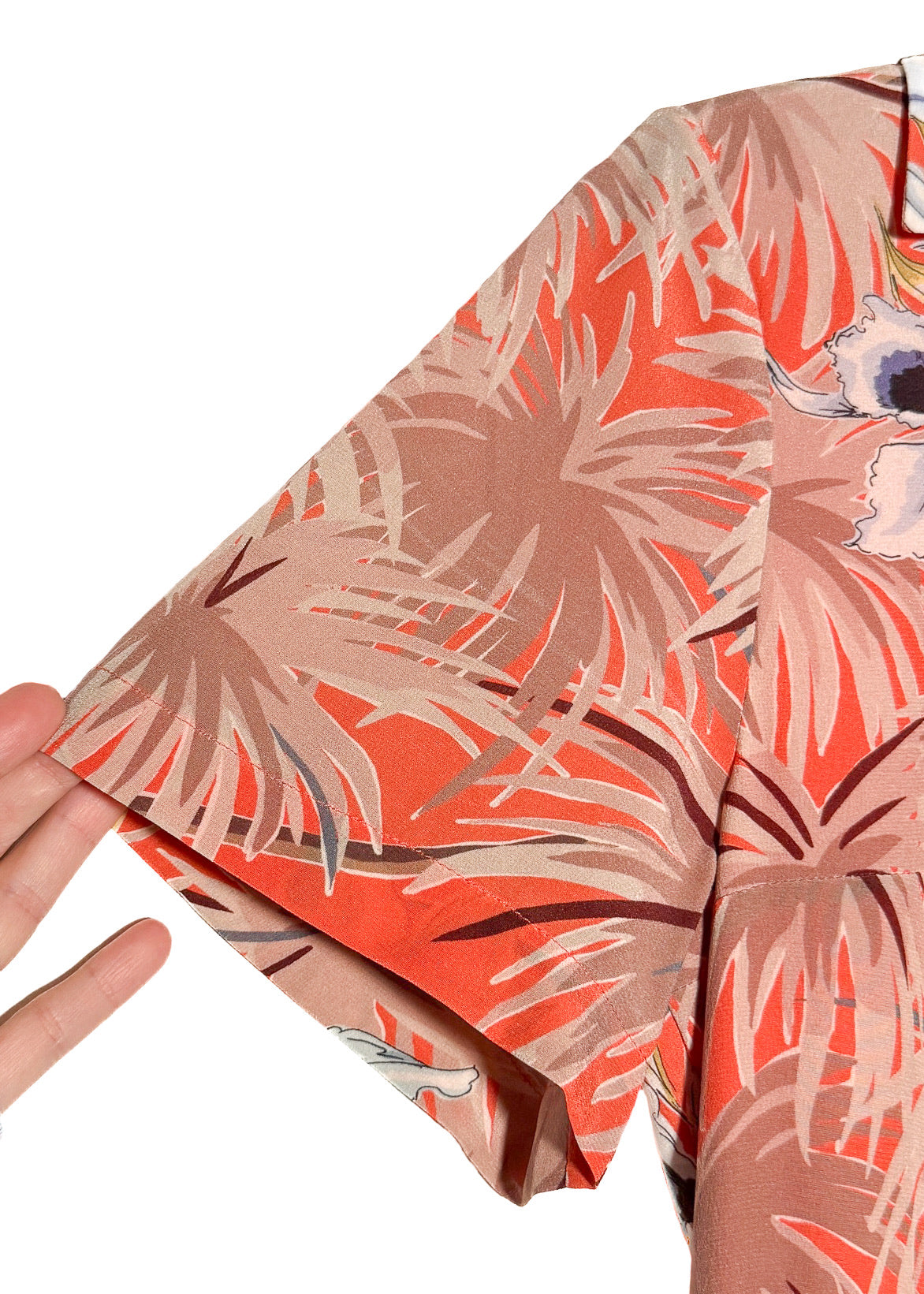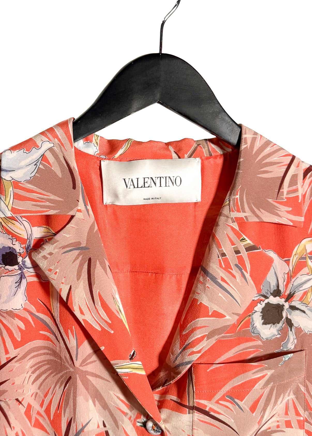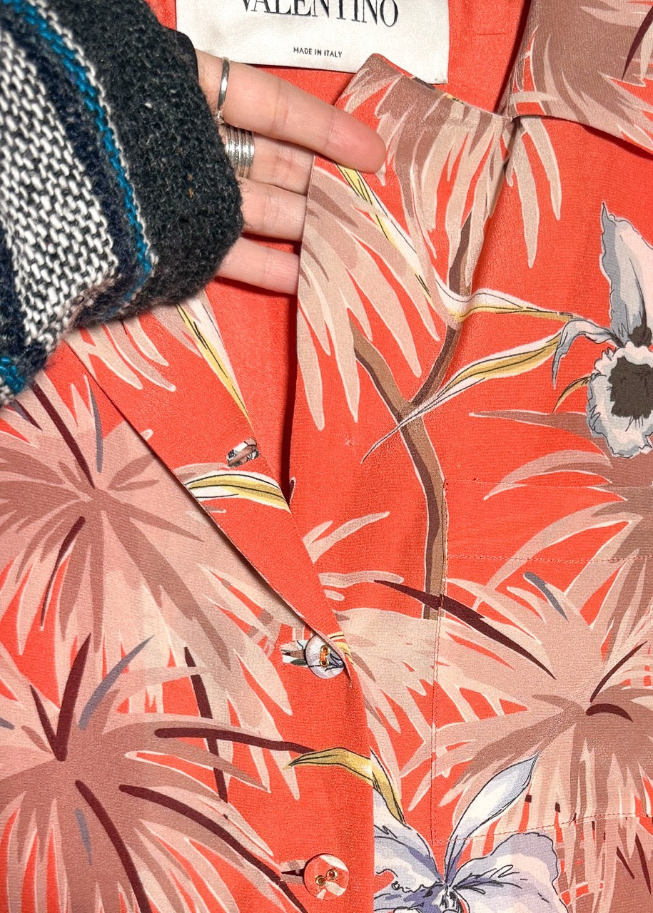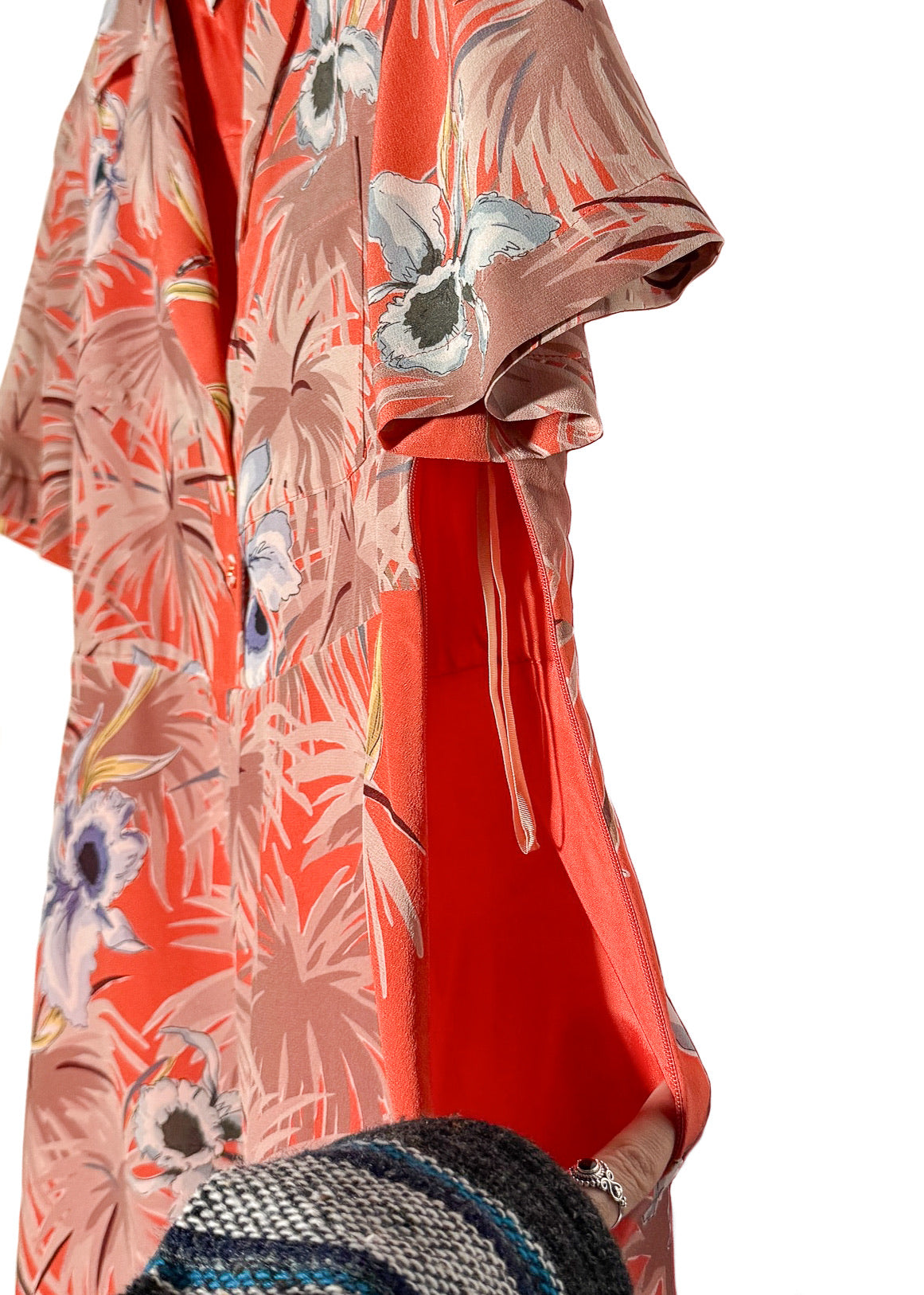 Soie légère avec imprimé floral tropical sur l’ensemble, dans des tons d’orange, de beige et de neutres doux. Encolure en V avec revers crantés et fermeture boutonnée à l’avant. Boutons recouverts de tissu. Manches courtes volantées. Couture de taille marquée. Fermeture zippée sur le côté. Poche poitrine passepoilée. Jupe fluide au-dessus du genou. Entièrement doublée en soie. Faite en Italie.