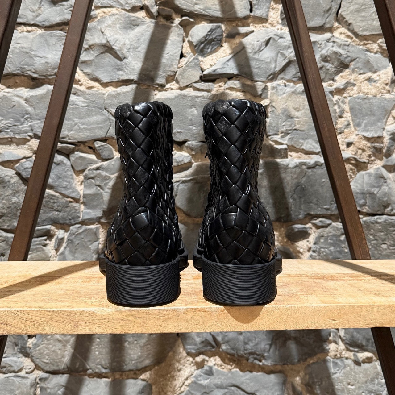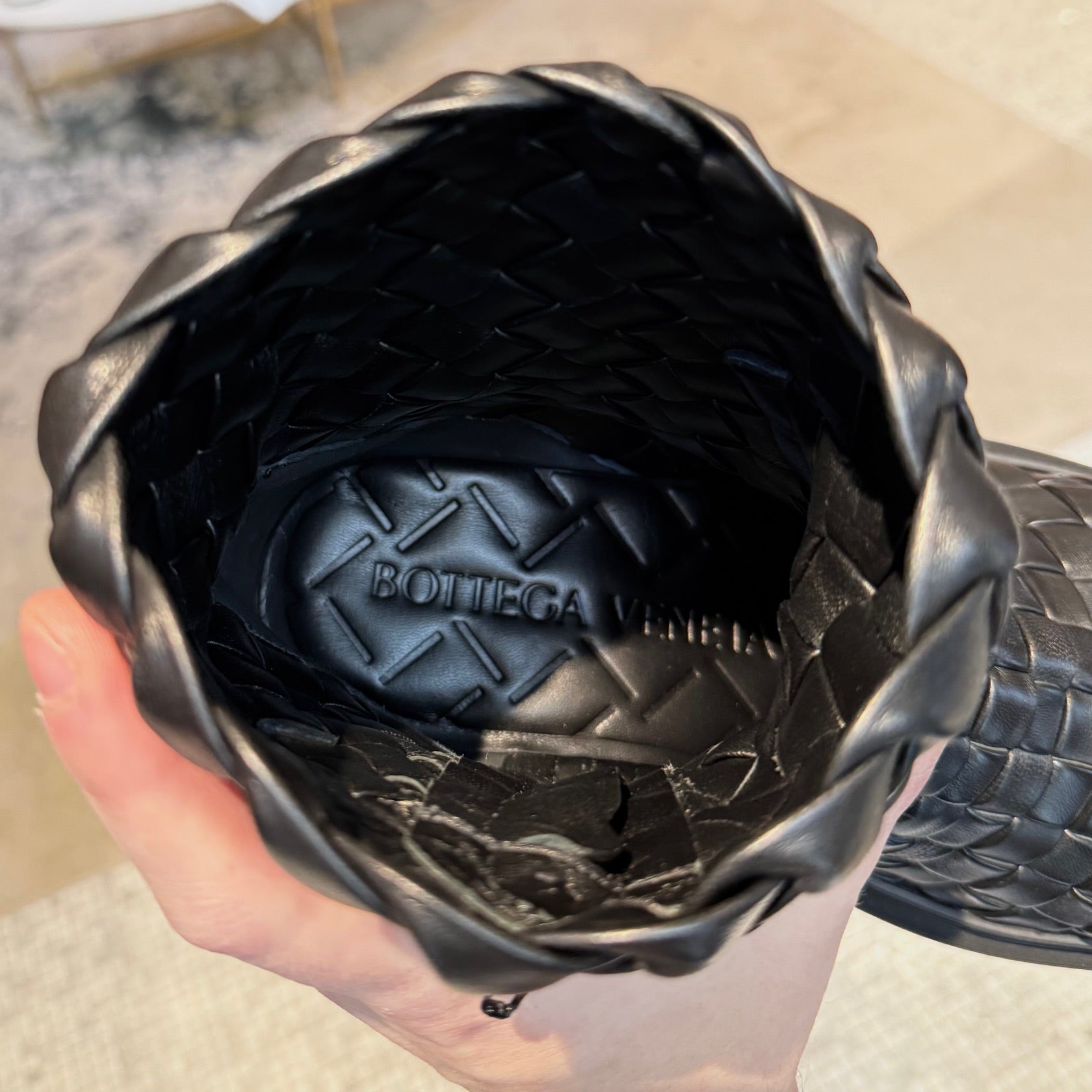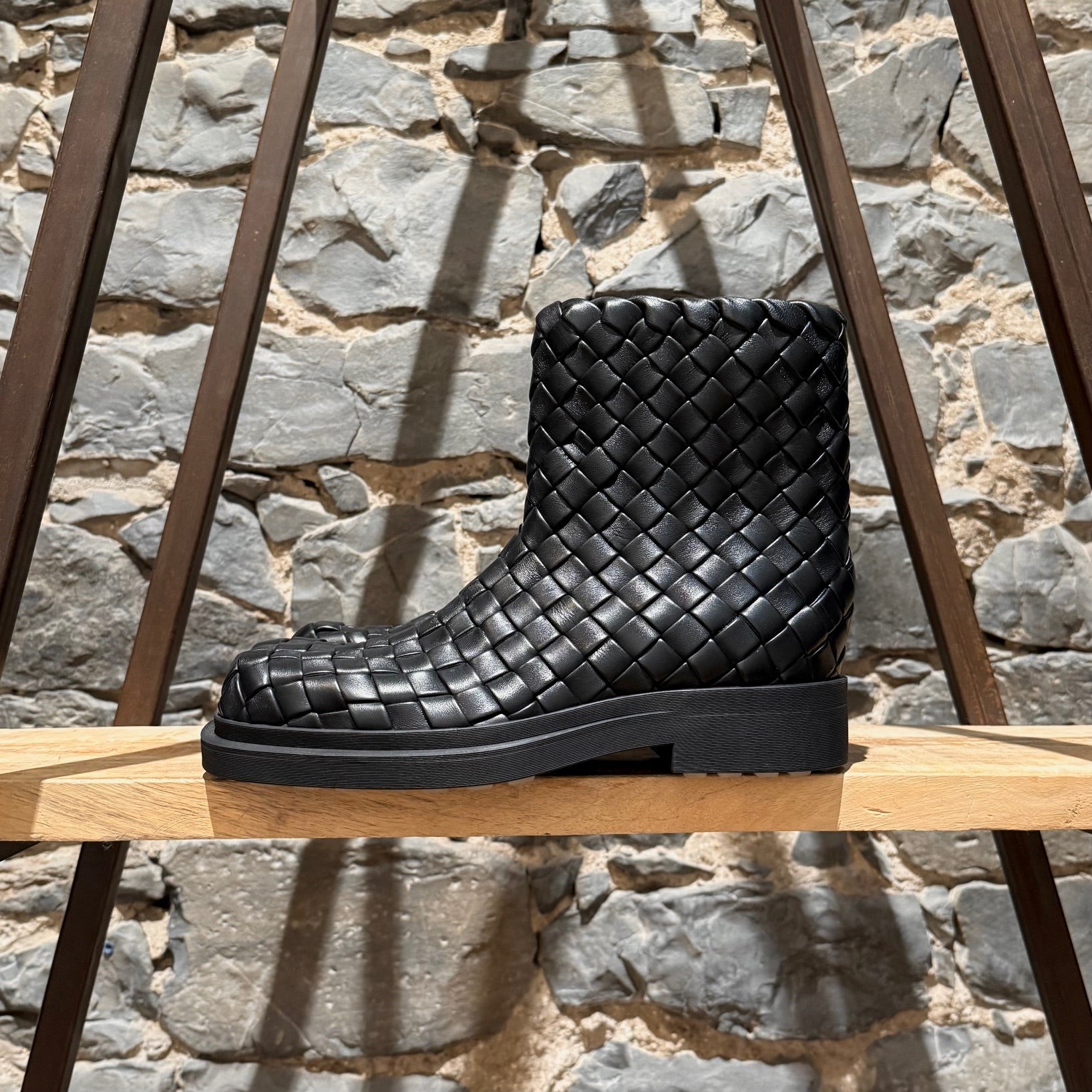 Cuir d’agneau noir souple, entièrement tressés selon le motif intrecciato emblématique, avec bout carré. Semelles épaisses en caoutchouc avec empiècements antidérapants. Fermetures éclair latérales. Semelle intérieure en cuir avec logo Bottega Veneta embossé. Faites en Italie. Livrées avec la boîte d’origine Bottega Veneta et un sac poussière.