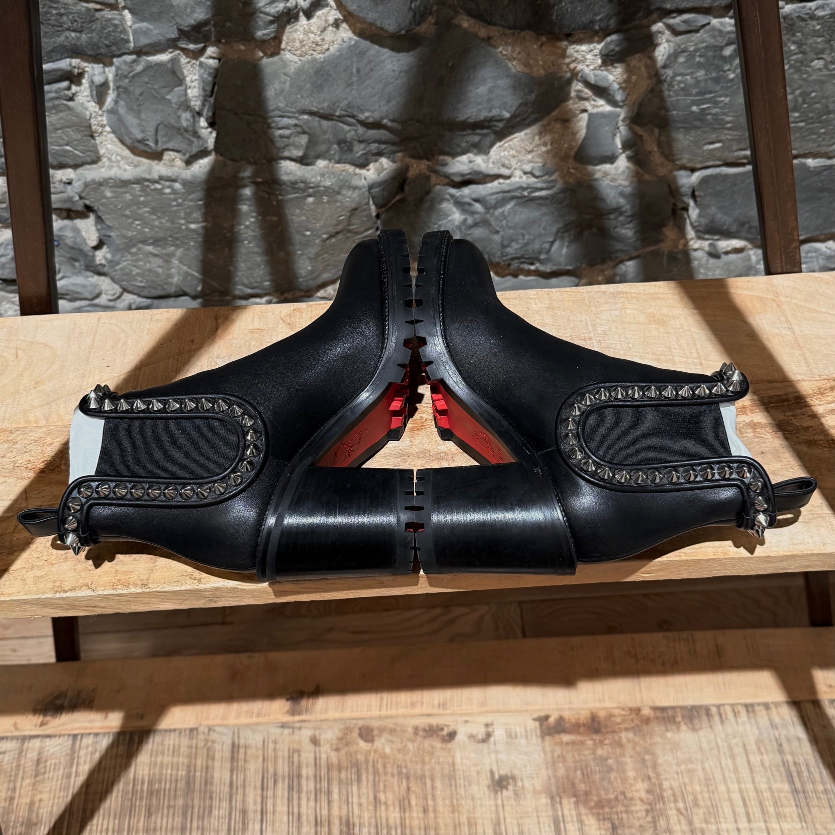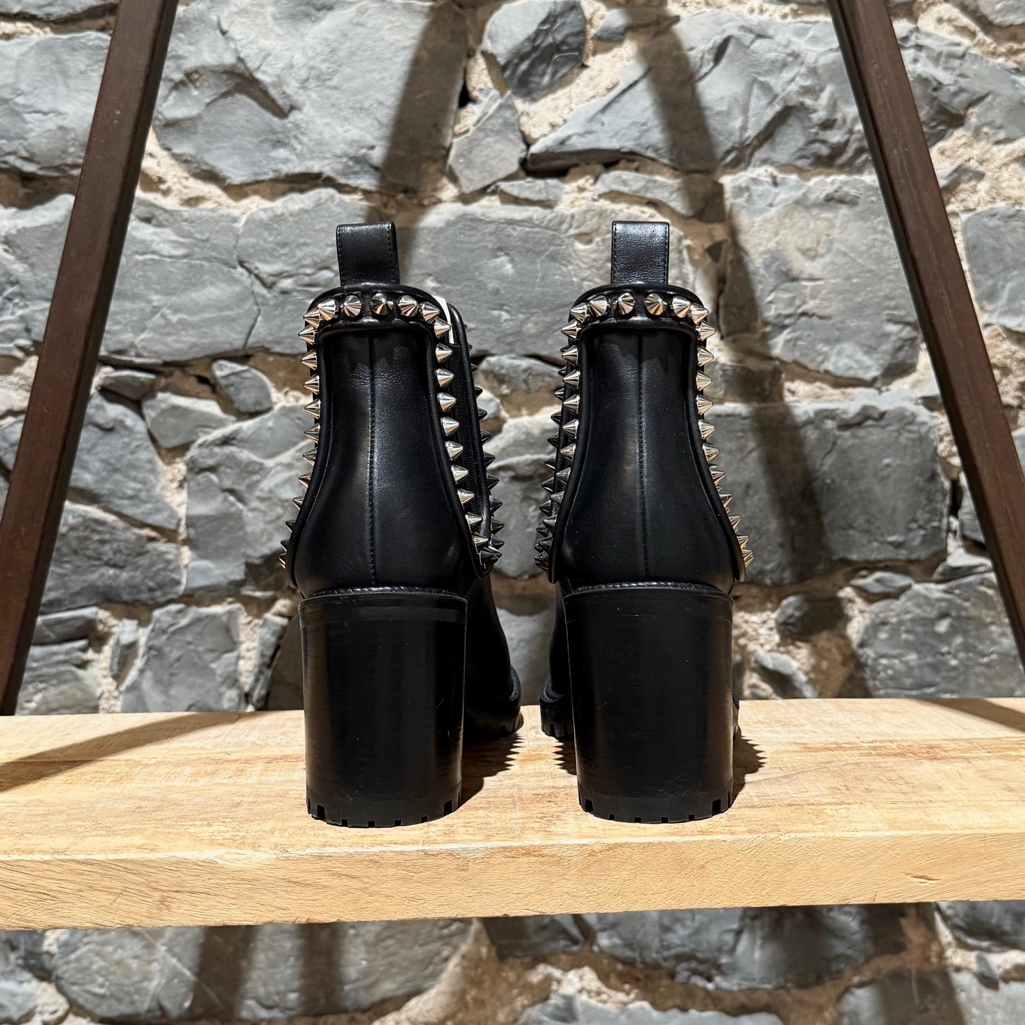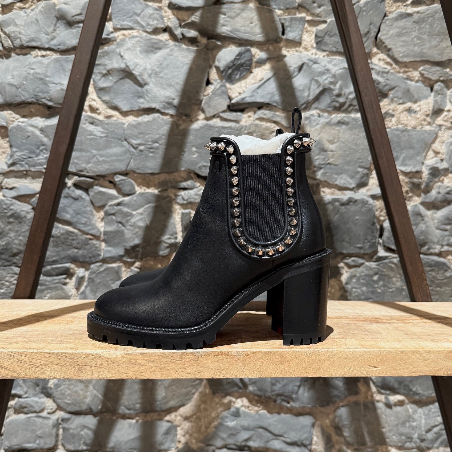 Bottines à la cheville en cuir de veau lisse noir. Panneaux latéraux élastiques. Bordure soulignée de clous métalliques argentés. Bout rond. Tirants à l’arrière. Talon bloc. Semelle extérieure épaisse en caoutchouc noir avec base rouge signature. Doublure et semelle intérieure en cuir beige. Faites en Italie. Livrées avec la boîte d’origine, les sacs poussière rouges Christian Louboutin et des clous supplémentaires dans une pochette.