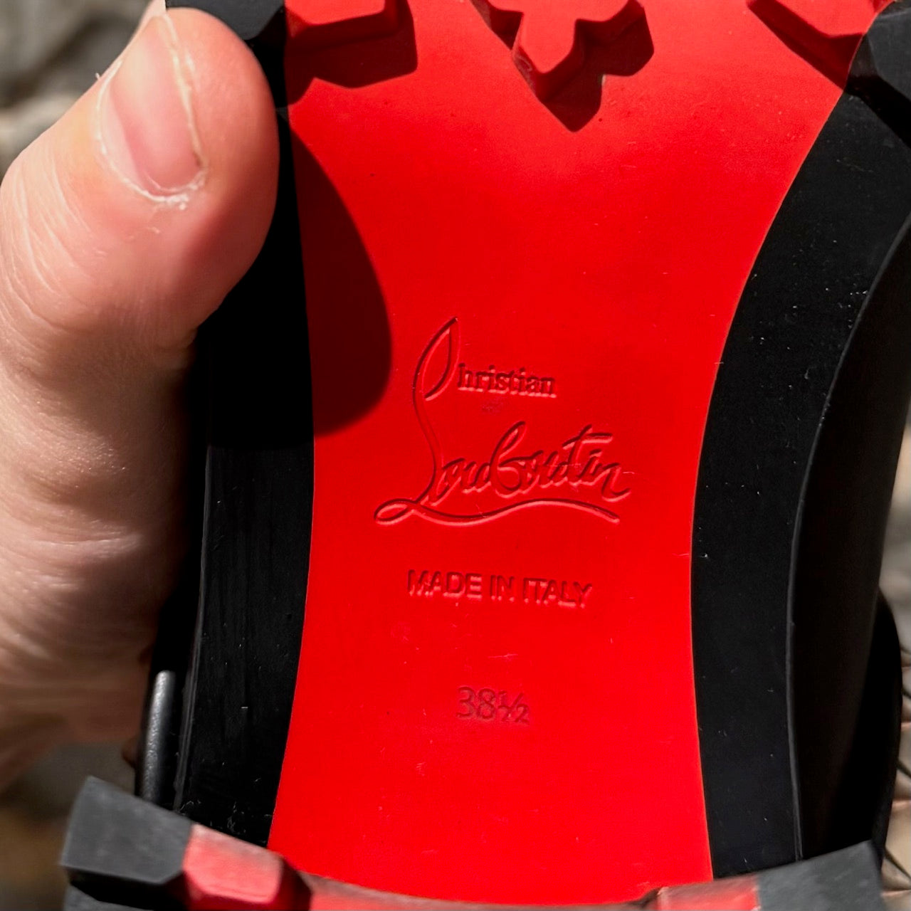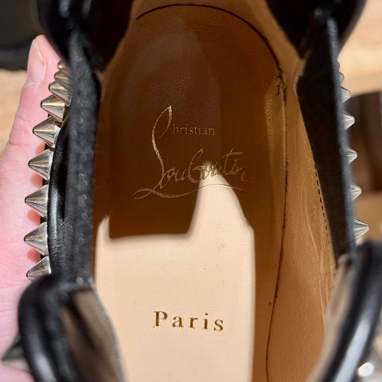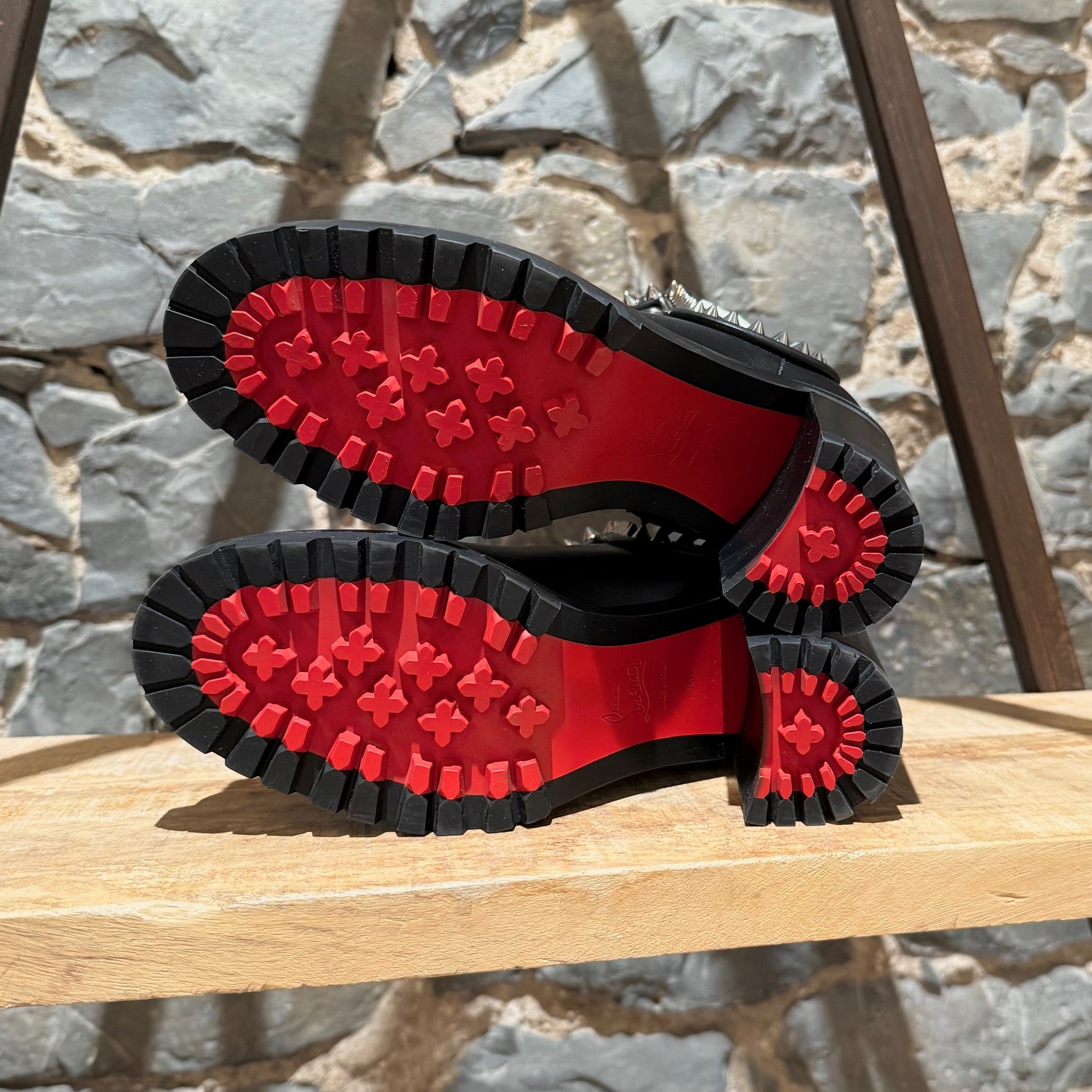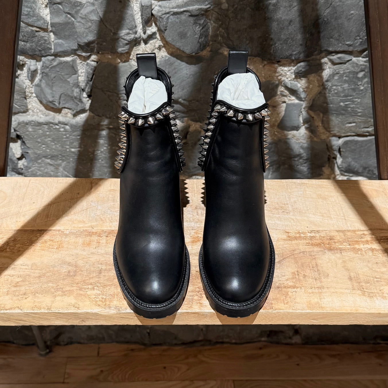 Bottines à la cheville en cuir de veau lisse noir. Panneaux latéraux élastiques. Bordure soulignée de clous métalliques argentés. Bout rond. Tirants à l’arrière. Talon bloc. Semelle extérieure épaisse en caoutchouc noir avec base rouge signature. Doublure et semelle intérieure en cuir beige. Faites en Italie. Livrées avec la boîte d’origine, les sacs poussière rouges Christian Louboutin et des clous supplémentaires dans une pochette.