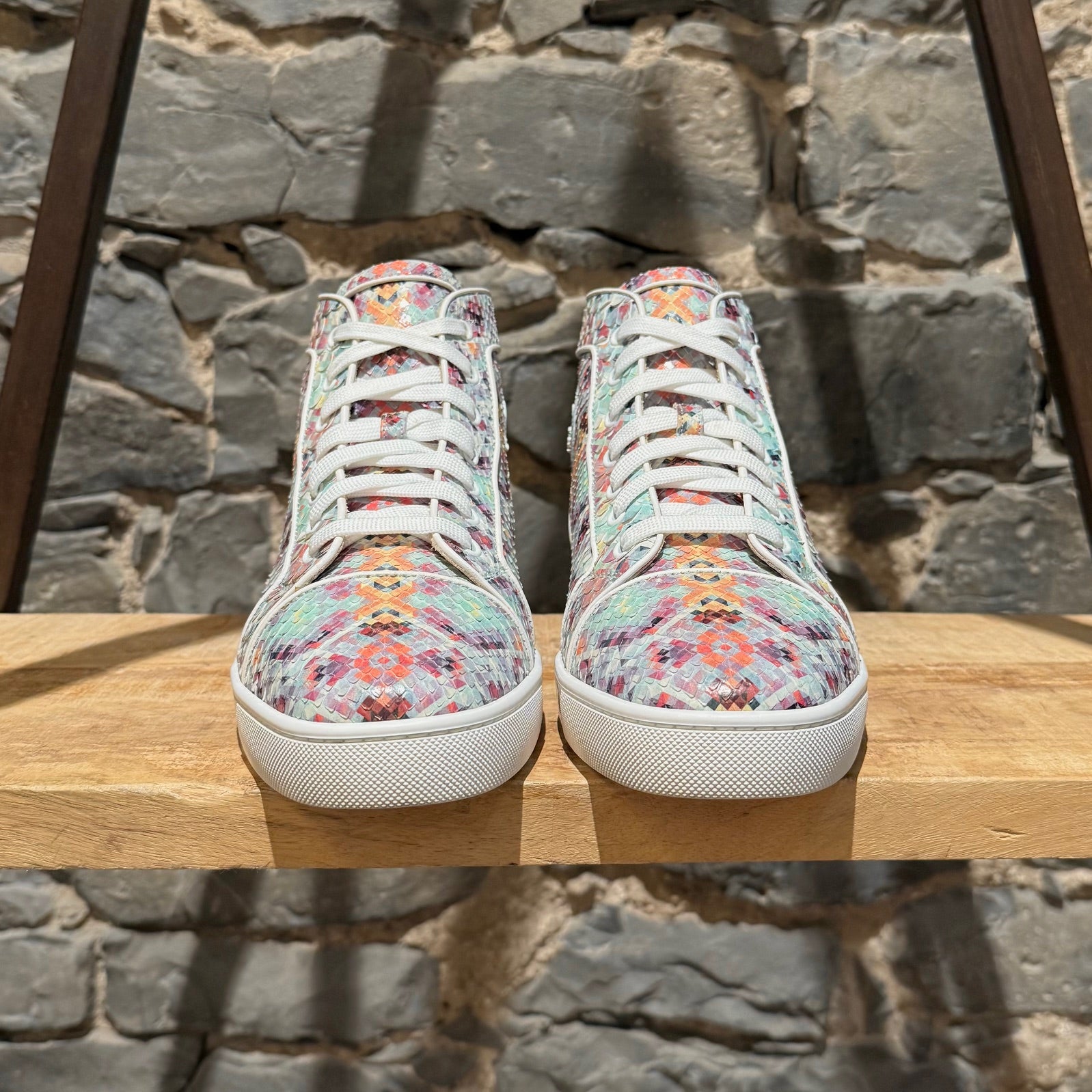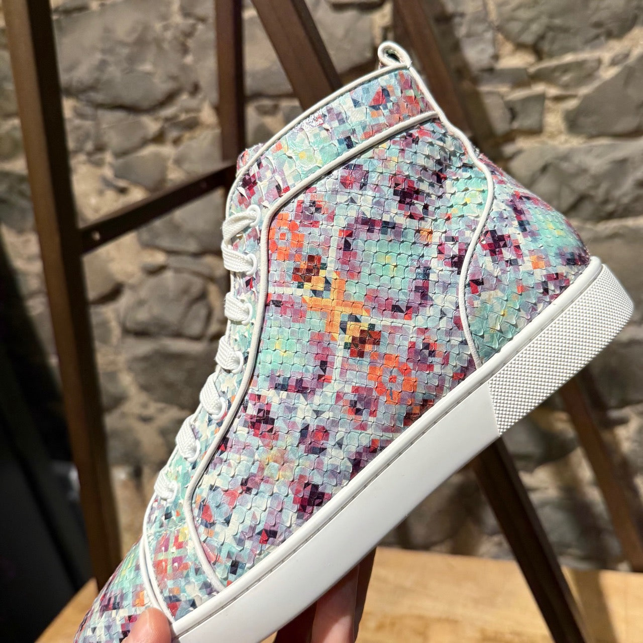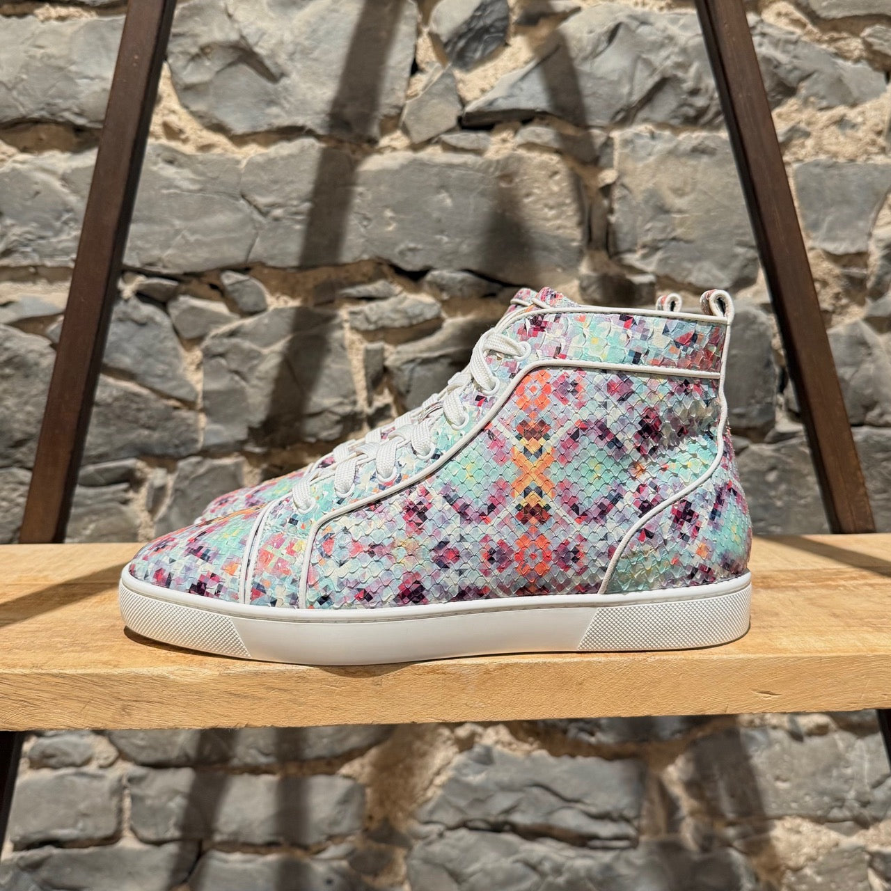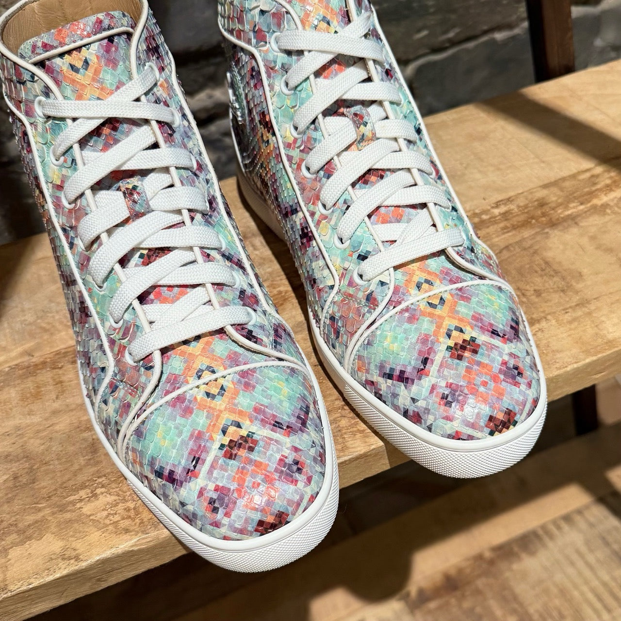 Silhouette montante avec fermeture à lacets et œillets. Tige en cuir de python brillant multicolore avec imprimé pixelisé sur l’ensemble. Écusson en cuir assorti avec logo à la cheville intérieure. Semelles extérieures en caoutchouc rouge signature Christian Louboutin. Semelles intermédiaires en caoutchouc blanc. Pattes de tirage arrière. Semelles intérieures et doublure en cuir beige. Faites dans l’UE. Livrées avec des lacets supplémentaires, la boîte Christian Louboutin et des sacs poussière.