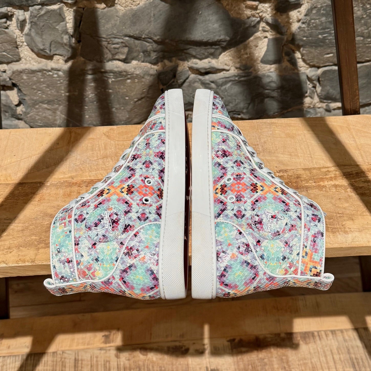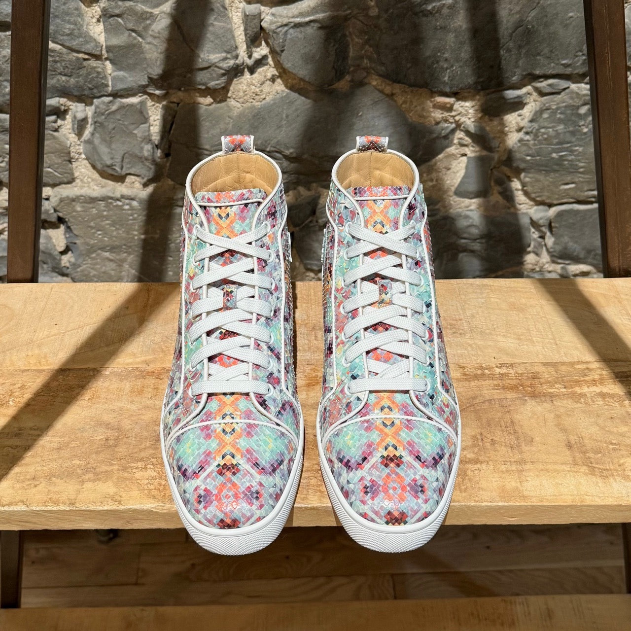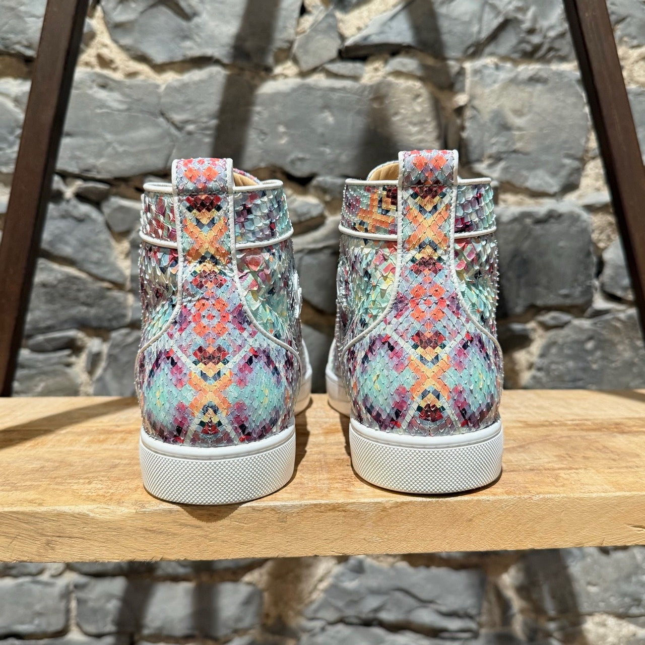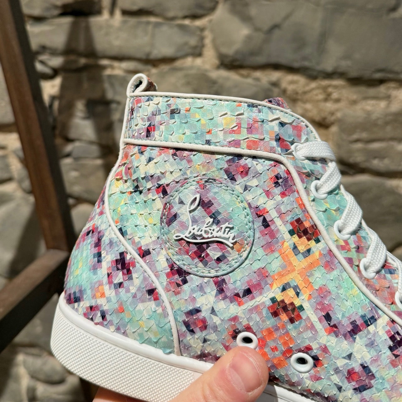 Silhouette montante avec fermeture à lacets et œillets. Tige en cuir de python brillant multicolore avec imprimé pixelisé sur l’ensemble. Écusson en cuir assorti avec logo à la cheville intérieure. Semelles extérieures en caoutchouc rouge signature Christian Louboutin. Semelles intermédiaires en caoutchouc blanc. Pattes de tirage arrière. Semelles intérieures et doublure en cuir beige. Faites dans l’UE. Livrées avec des lacets supplémentaires, la boîte Christian Louboutin et des sacs poussière.