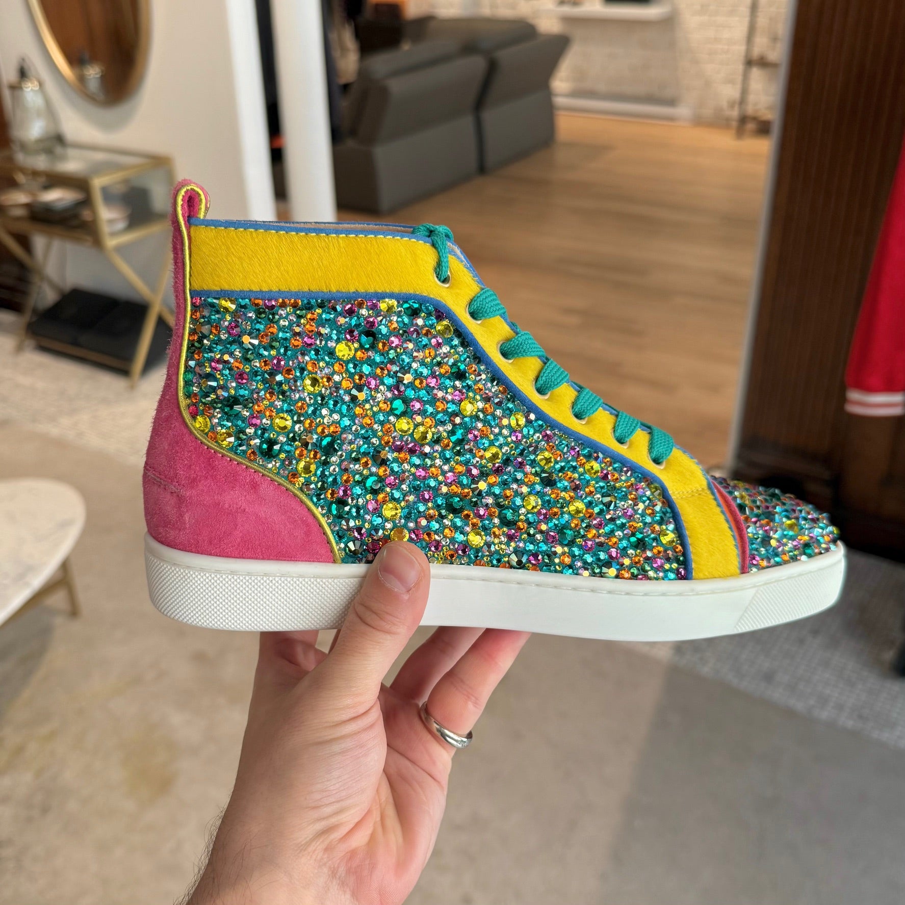 Baskets montantes Louis Strass de Christian Louboutin cristaux Swarovski arc-en-ciel. Modèle rare. Espadrilles montantes Louis Strass ornées de cristaux Swarovski multicolores sur fond turquoise. Encadrées de panneaux en tissu effet poil de poulain jaune et orange. Contreforts en suède rose fuchsia. Lacets turquoise. Écusson rond en suède bleu avec plaque signature Louboutin dorée. Semelle emblématique en caoutchouc rouge et blanc griffée. Faites en Italie. Livrées telles quelles.
