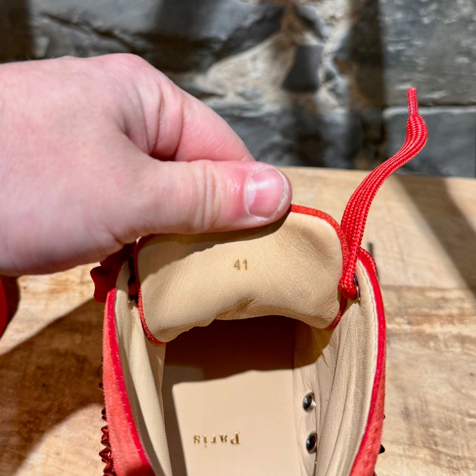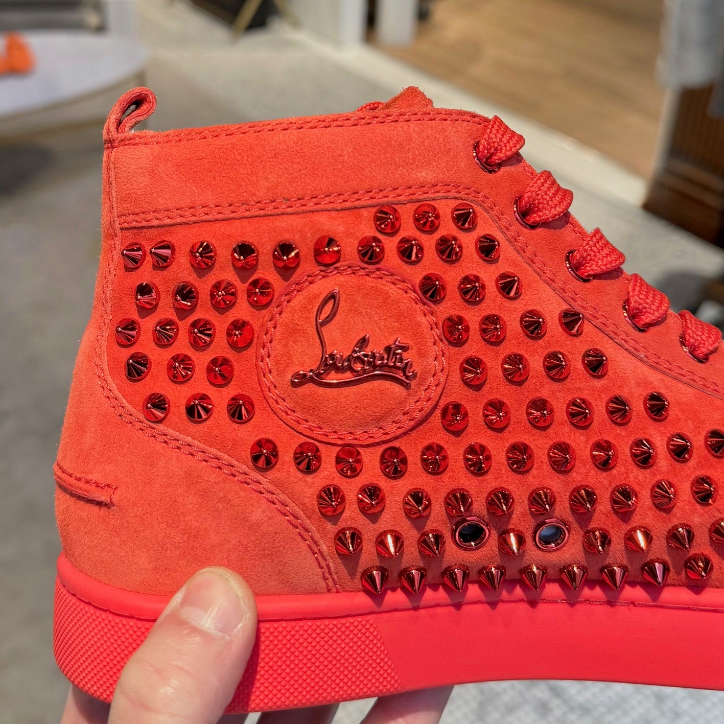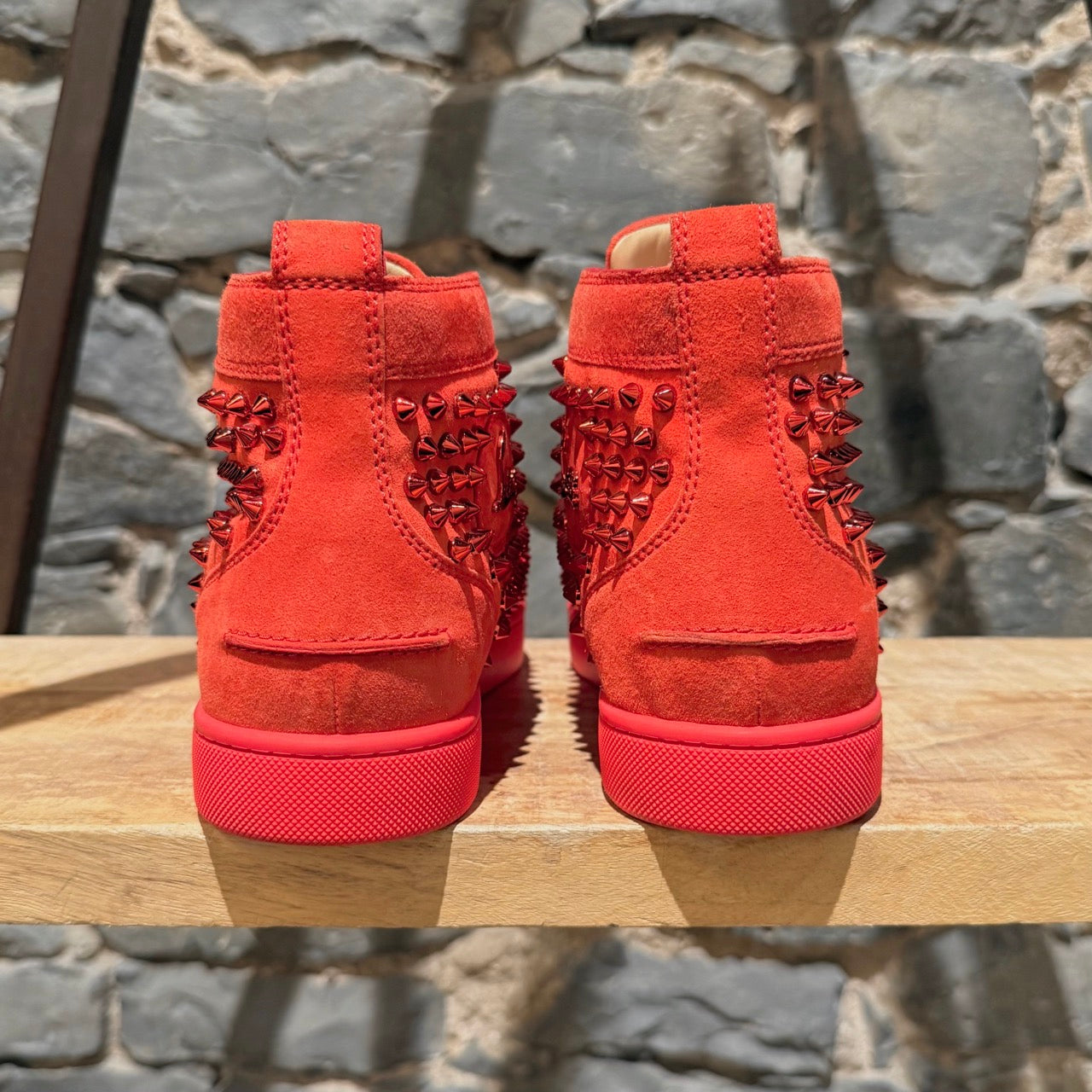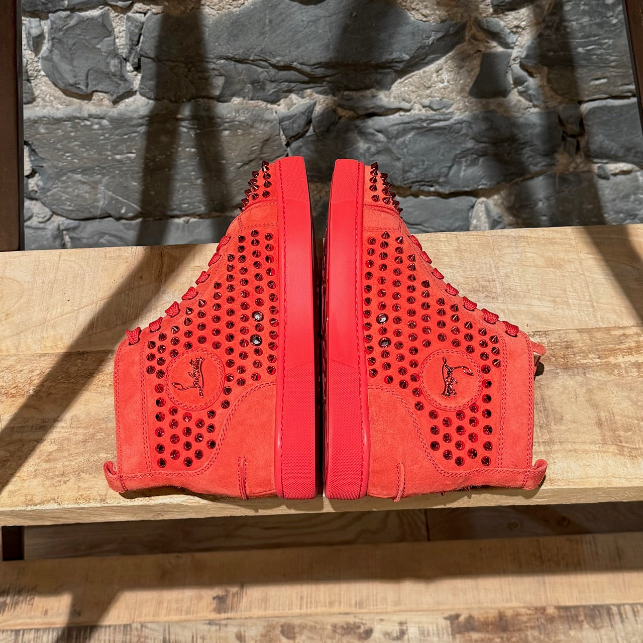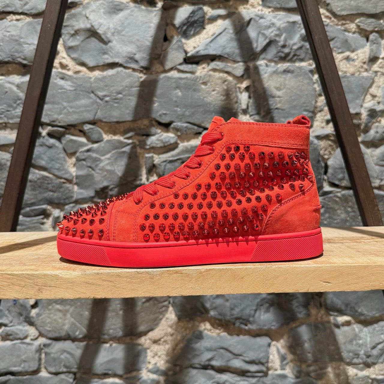 Modèle montant avec bout arrondi. Tige monochrome rouge en suède ornée de clous métalliques ton sur ton. Fermeture à lacets avec lacets plats rouges. Semelle extérieure en caoutchouc rouge signature. Doublure et semelle intérieure en cuir beige. Faites en UE. Livrées telles quelles.