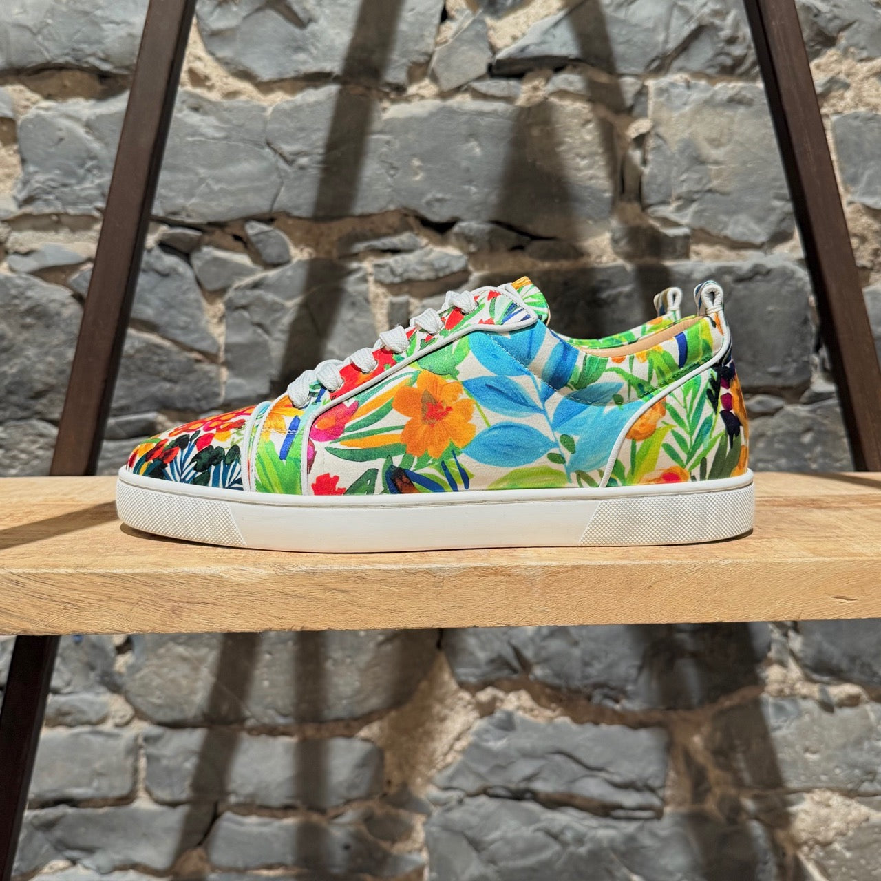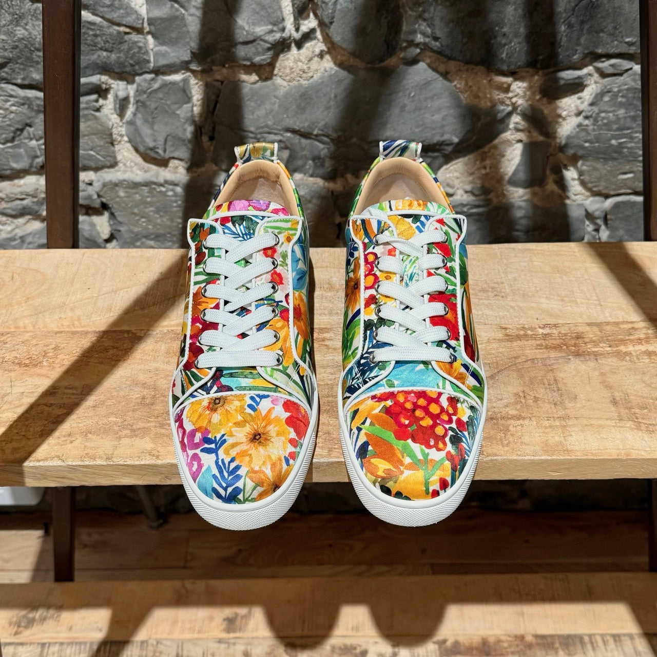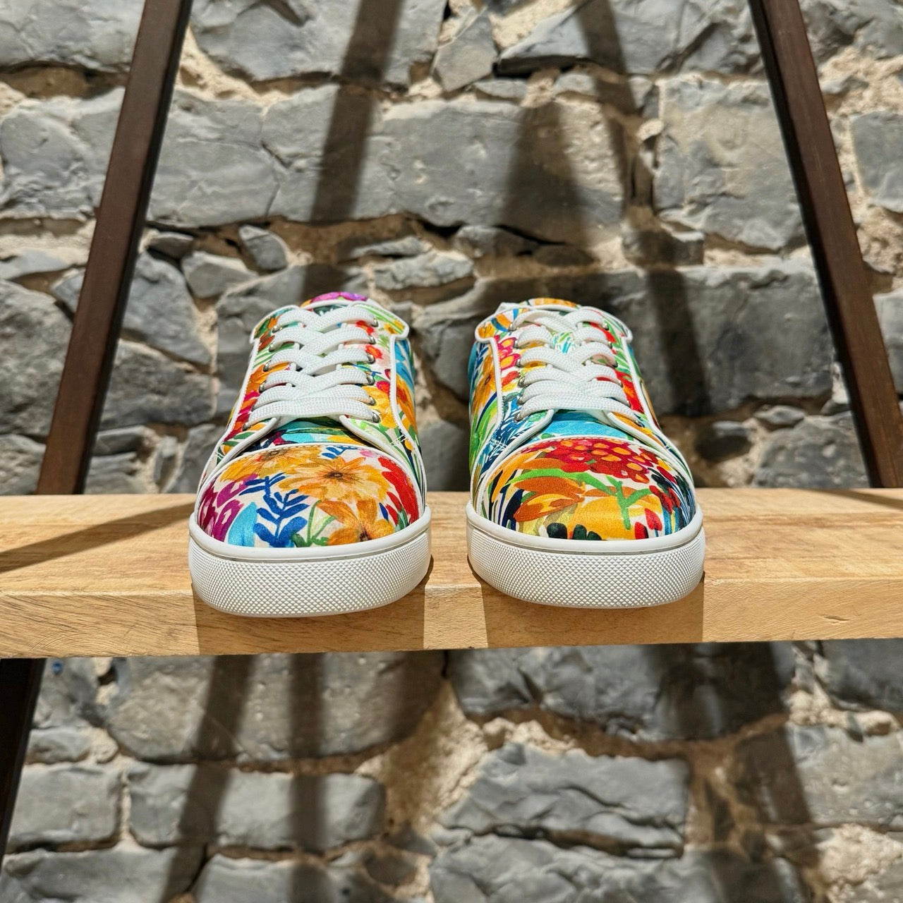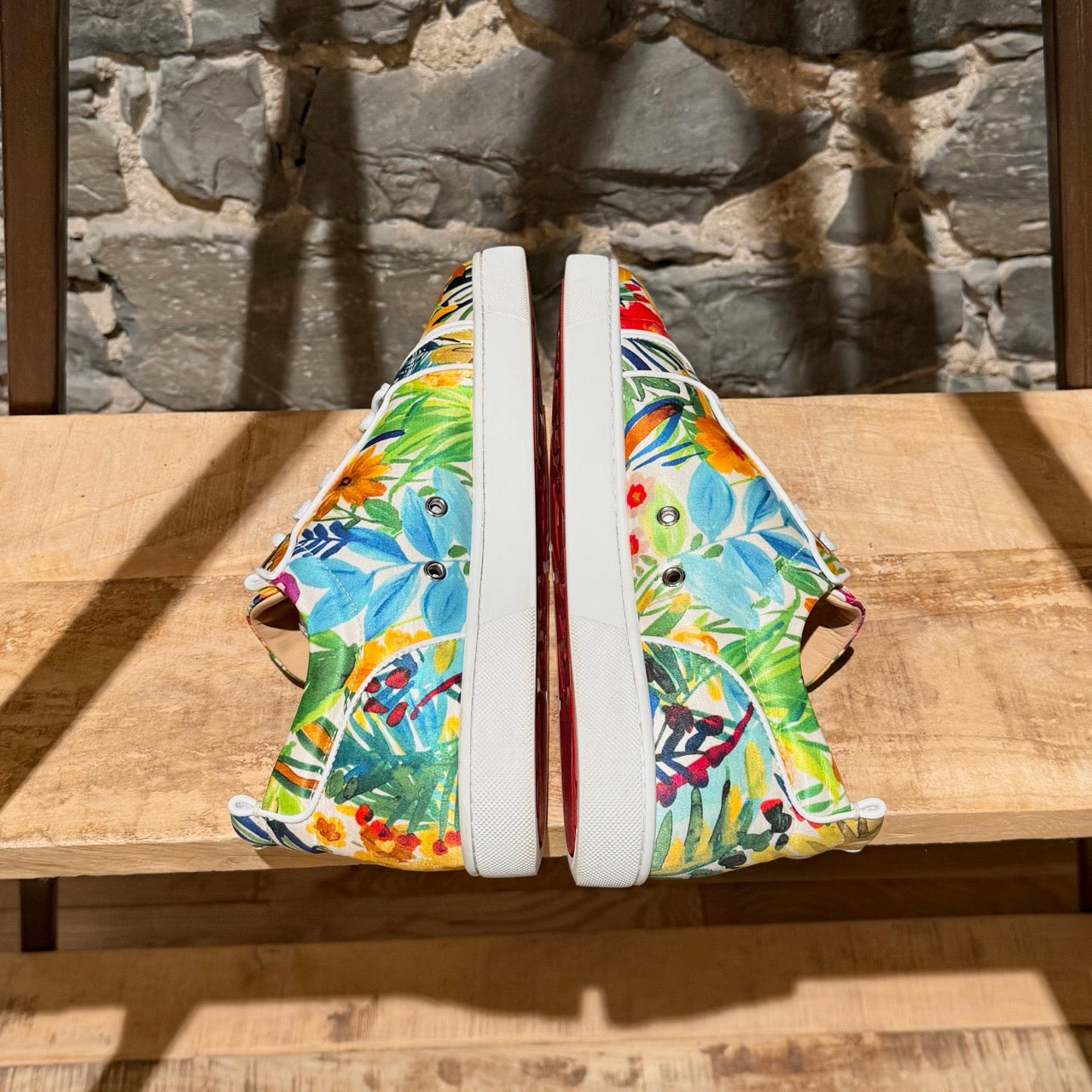 Satin floral multicolore. Passepoil en cuir blanc. Fermeture à lacets blancs. Col rembourré avec languettes d’extraction en textile. Bout rond. Semelle extérieure rouge emblématique en caoutchouc avec détail de logo. Doublure en cuir beige. Semelles intérieures amovibles en cuir beige. Faites en Italie. Livrées avec la boîte d’origine et le sac poussière.