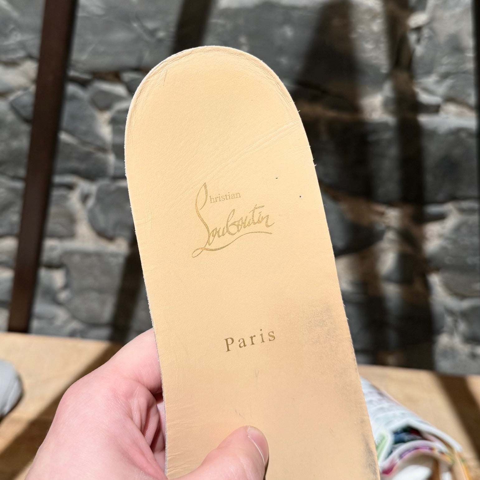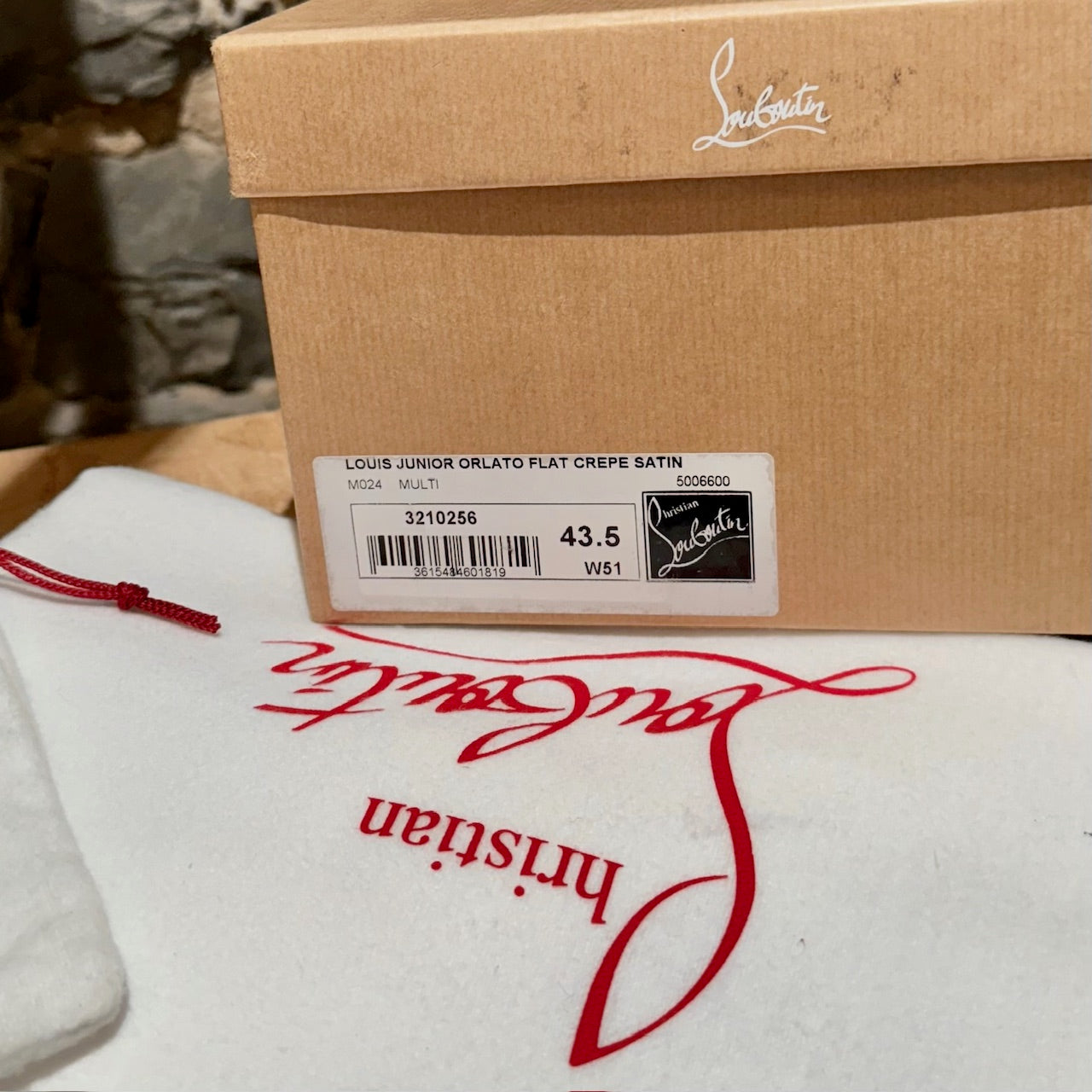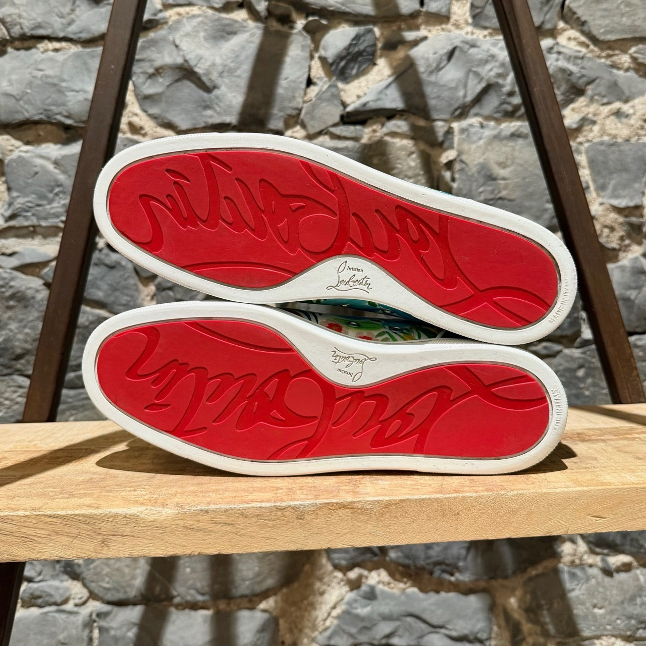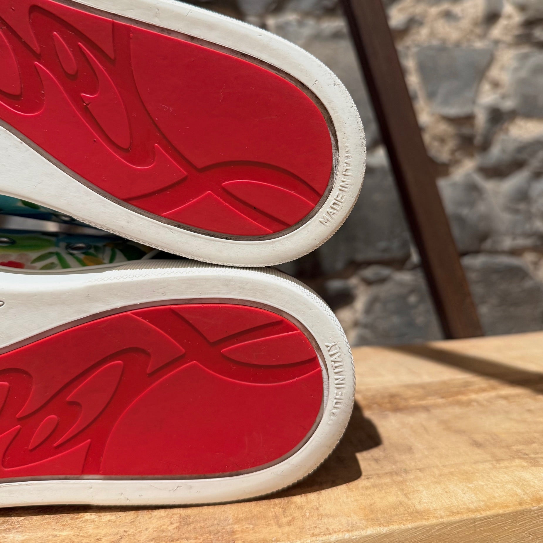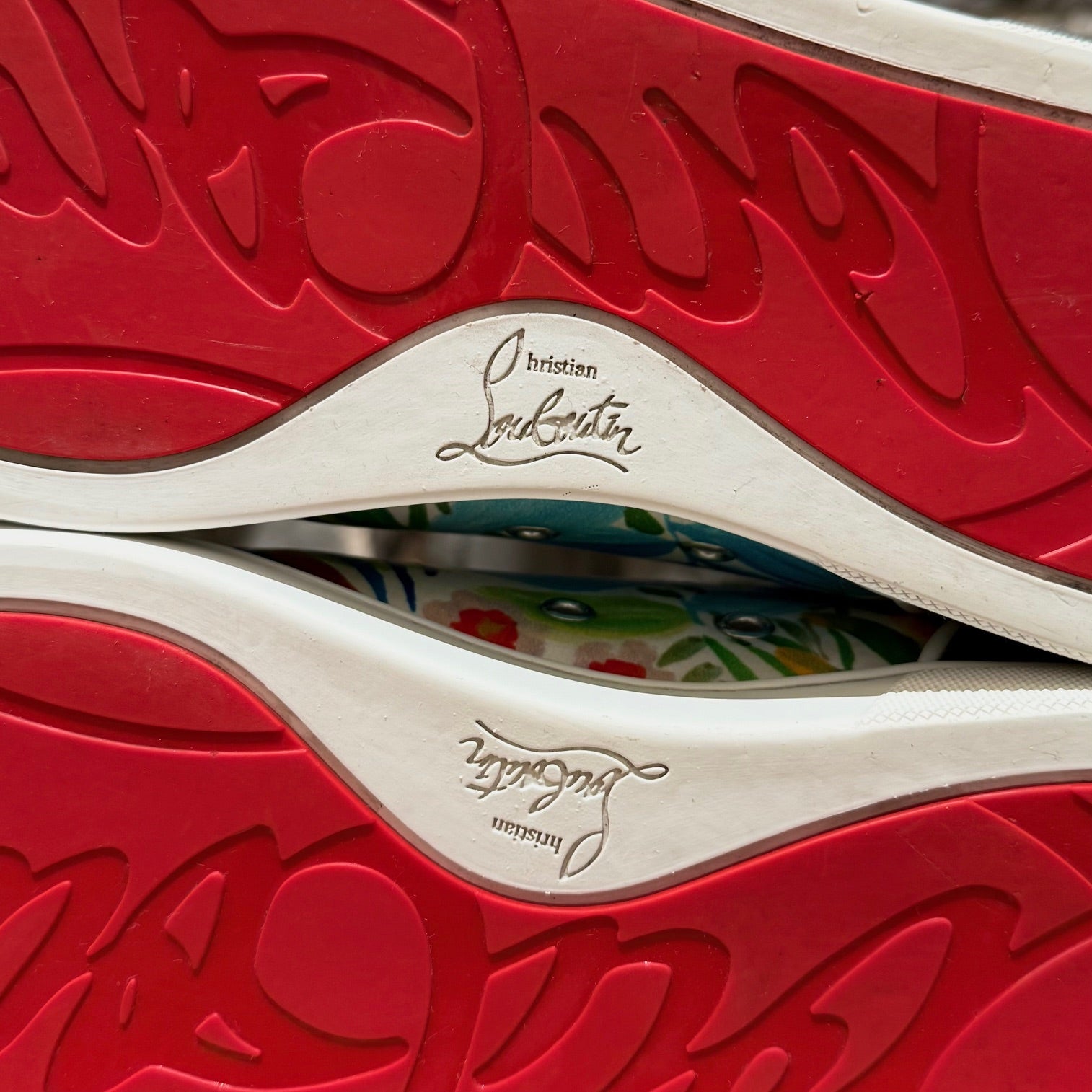 Satin floral multicolore. Passepoil en cuir blanc. Fermeture à lacets blancs. Col rembourré avec languettes d’extraction en textile. Bout rond. Semelle extérieure rouge emblématique en caoutchouc avec détail de logo. Doublure en cuir beige. Semelles intérieures amovibles en cuir beige. Faites en Italie. Livrées avec la boîte d’origine et le sac poussière.