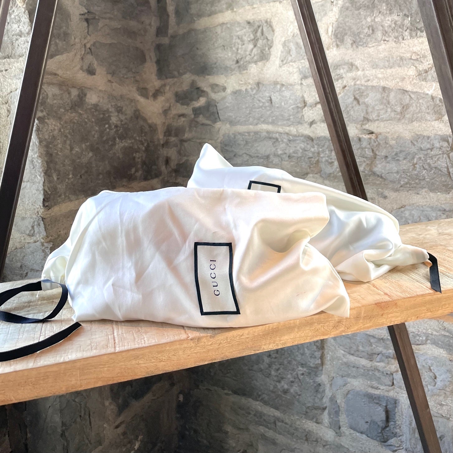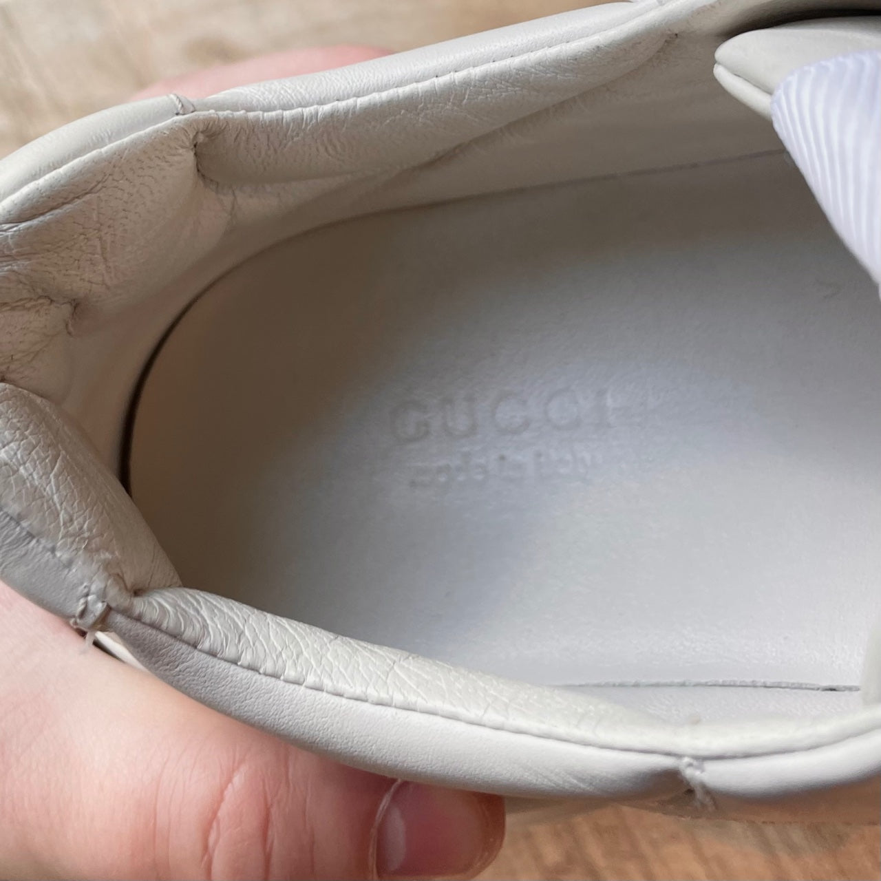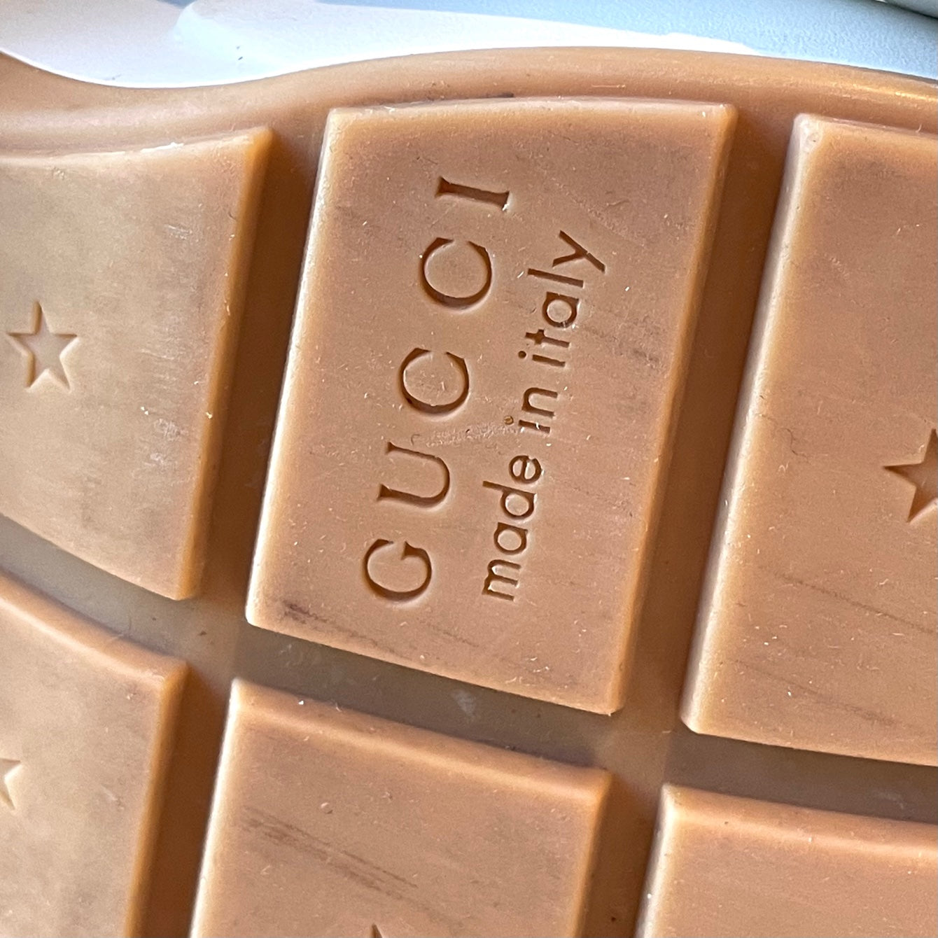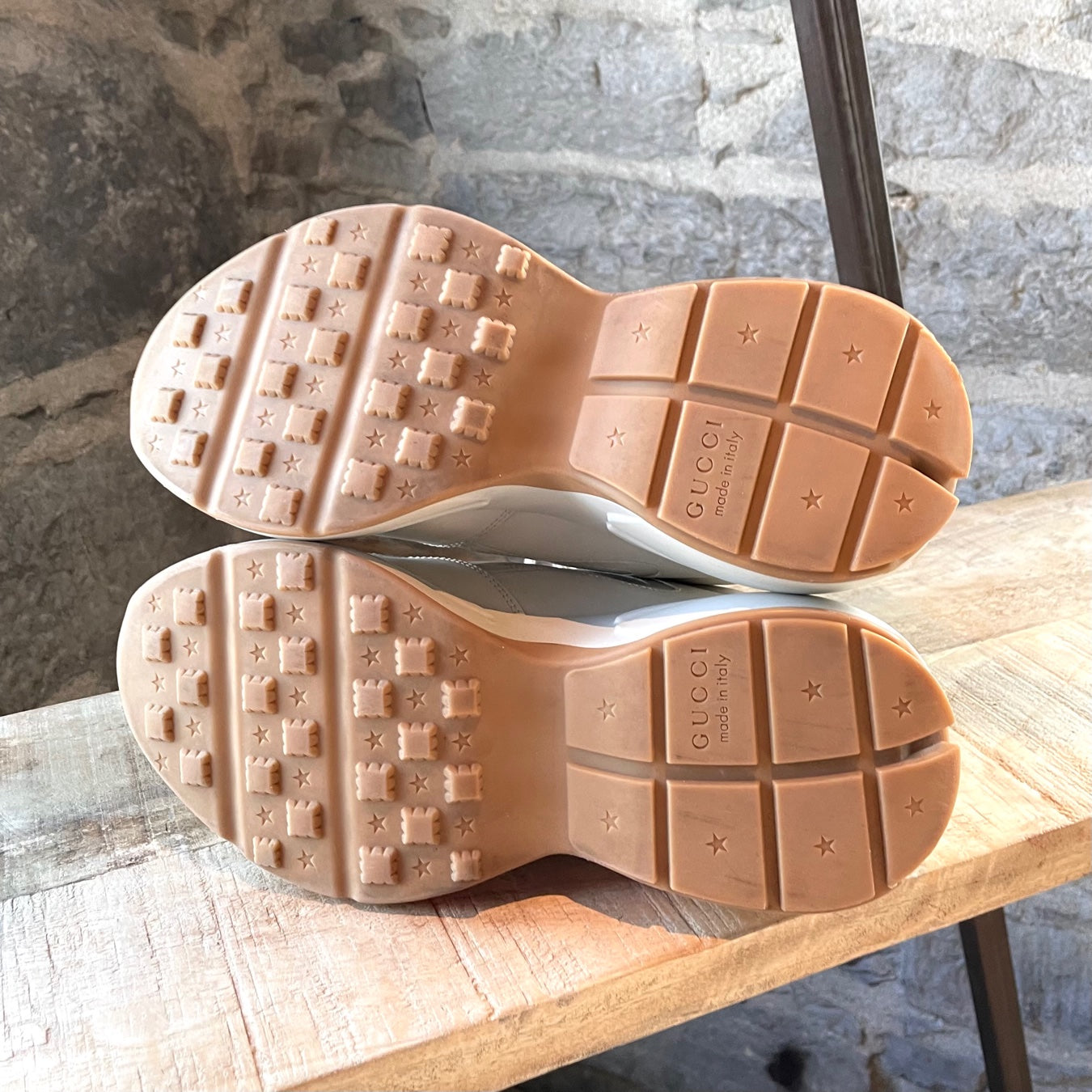 Baskets en cuir ivoire à logo entrelancés Gucci Rhyton. Cuir de veau poli. Bout rond. Fermeture à nouer à lacets. Logo imprimé sur le côté extérieur. Logo embossé aux talons. Semelle épaisse en caoutchouc. Fabriquées en Italie. Livrées telles quel.
