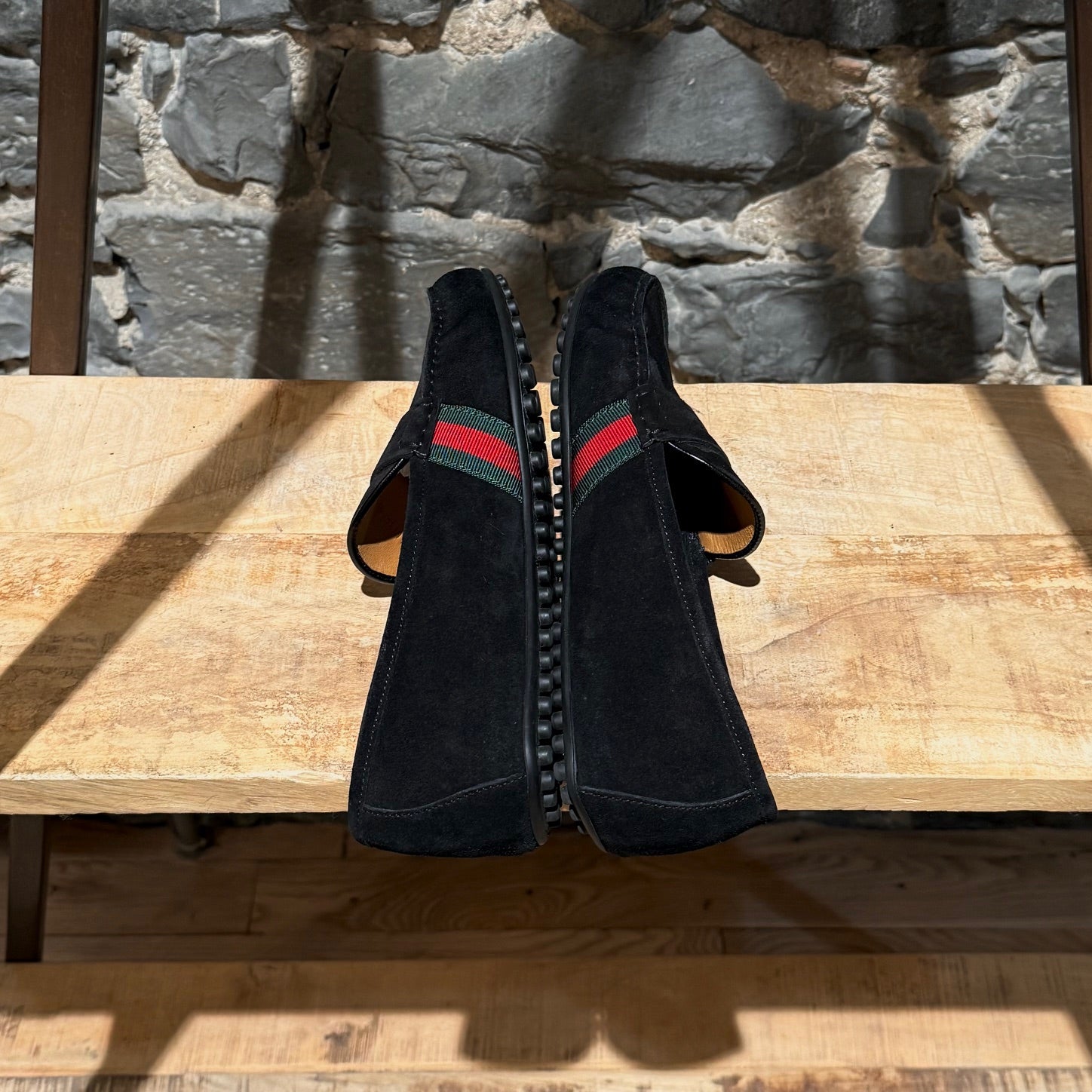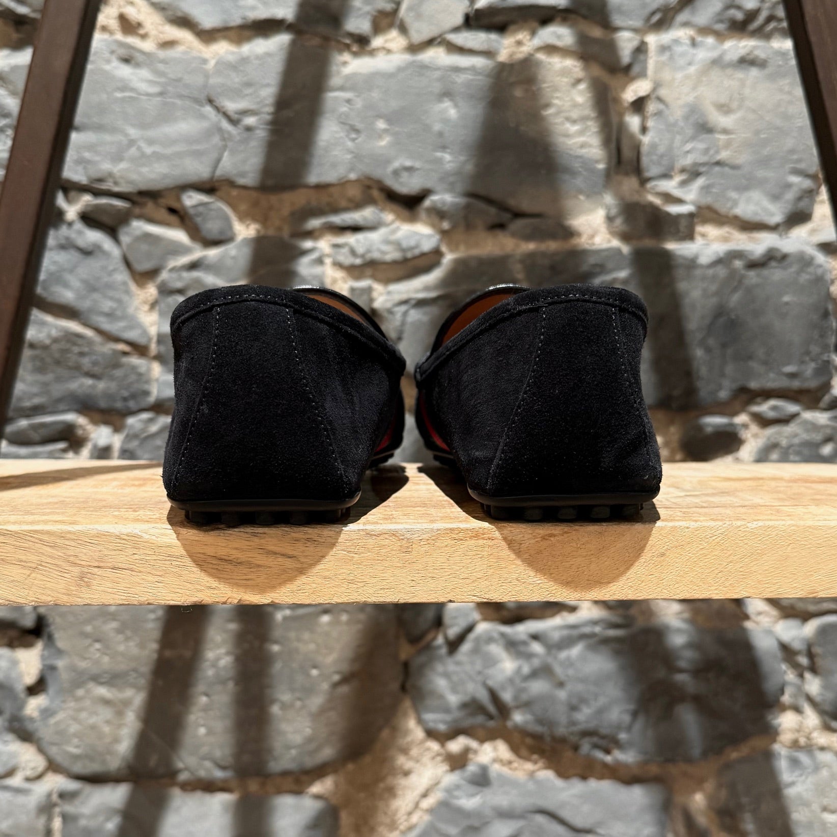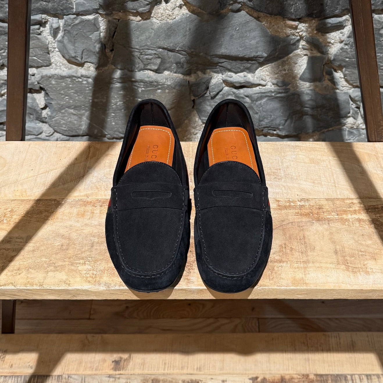 Suède noir avec une bride style penny sur le dessus. Détail Web vert et rouge sur les côtés. Surpiqûres visibles le long de l’empeigne. Bout arrondi. Semelle intérieure en cuir camel. Semelle extérieure à picots en caoutchouc offrant une adhérence optimale. Faits en Italie. Livrés avec la boîte d’origine, les cartes, la preuve d’achat et un sac poussière Gucci. Achetés dans un magasin d’entrepôt Gucci.