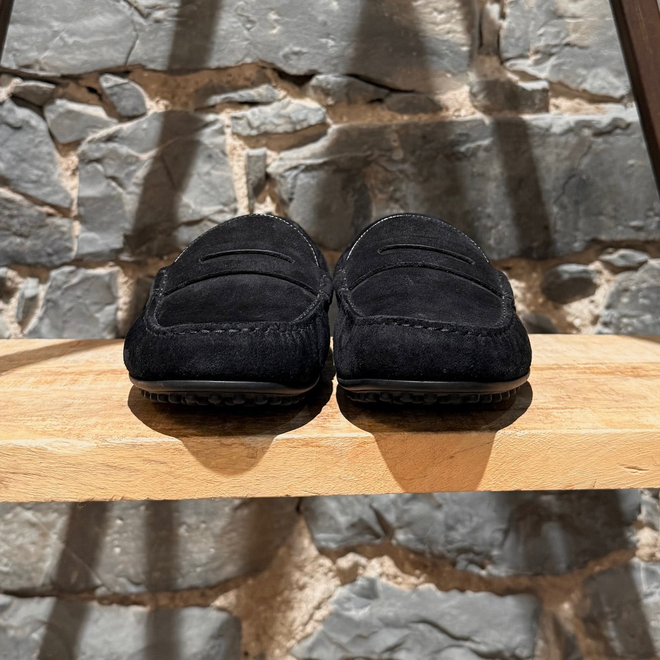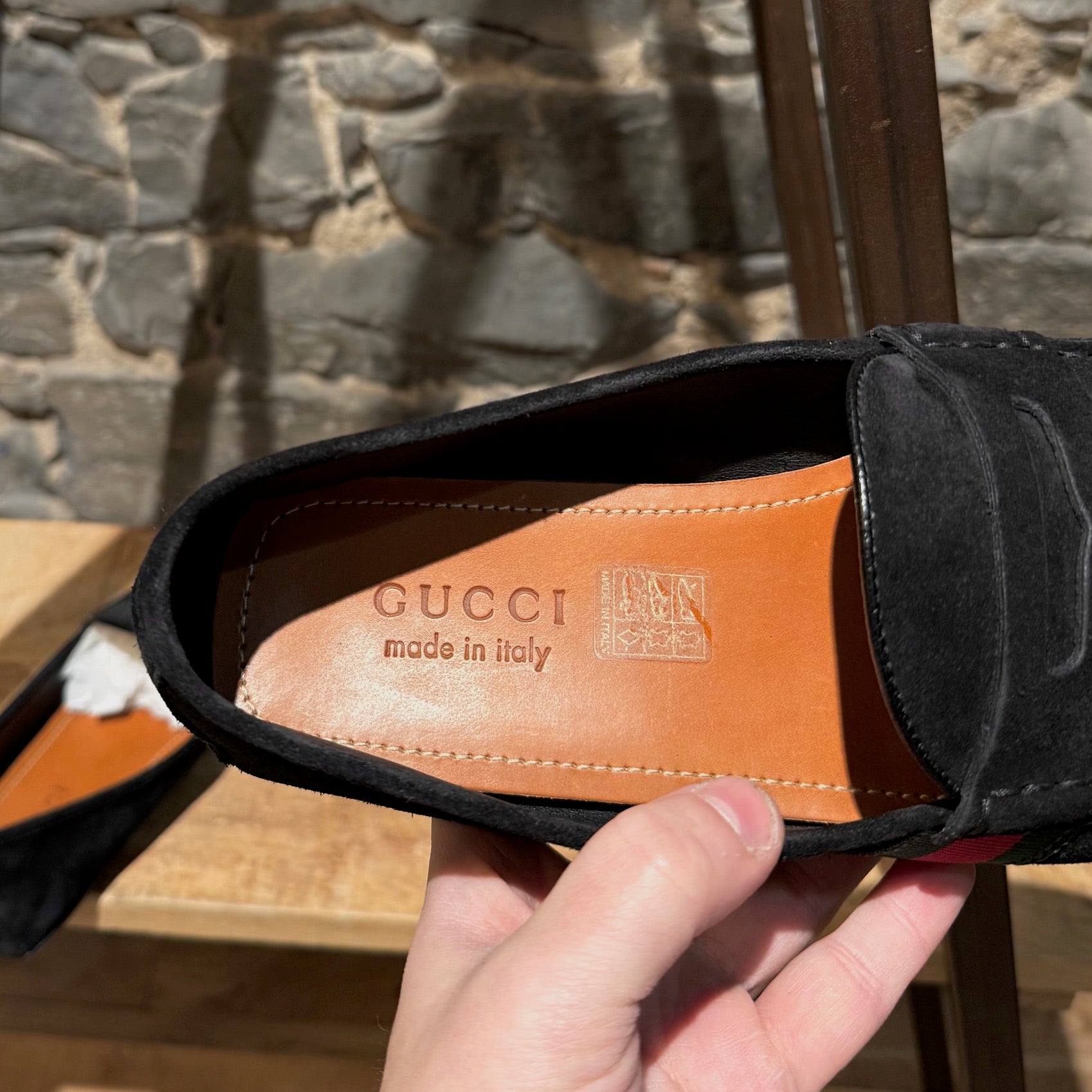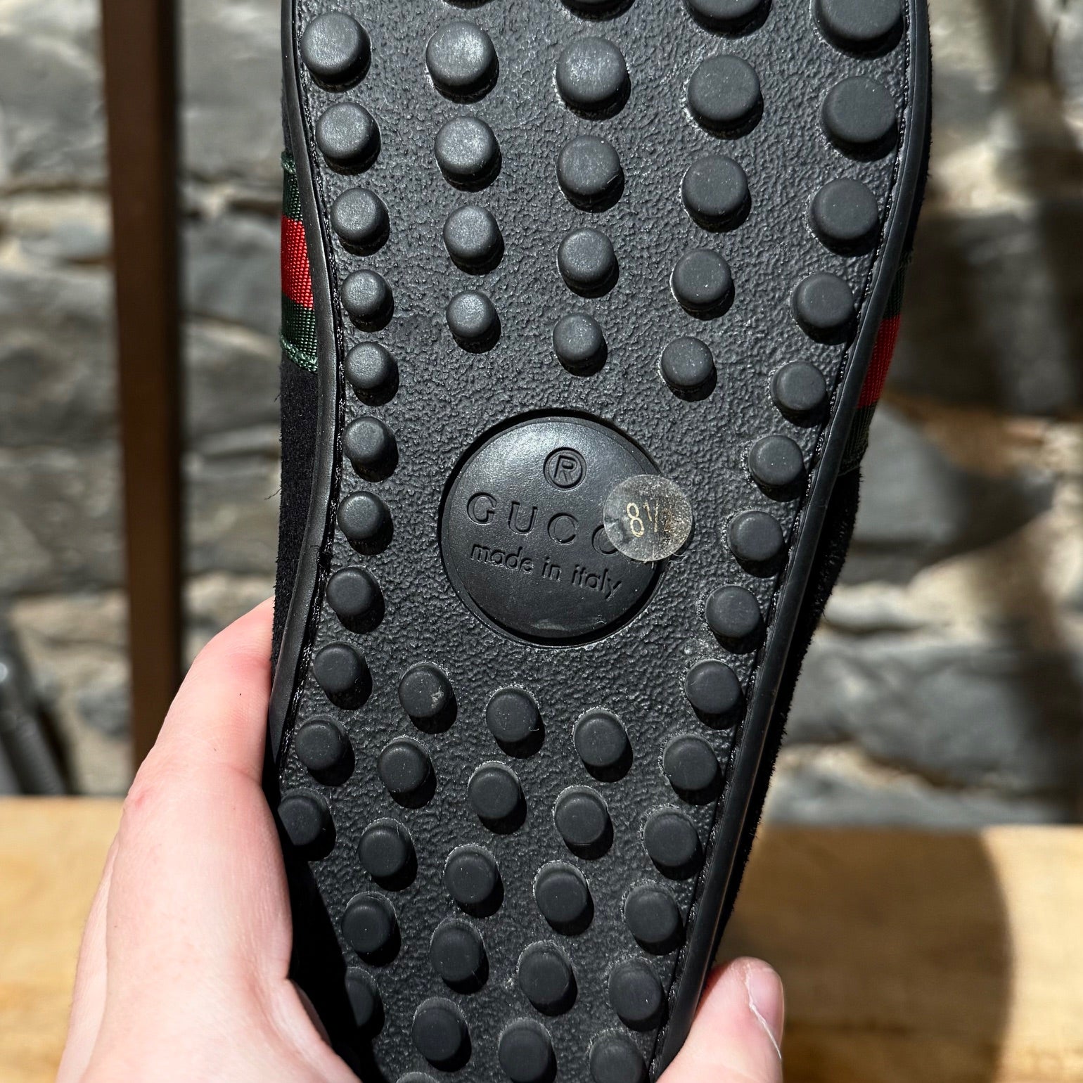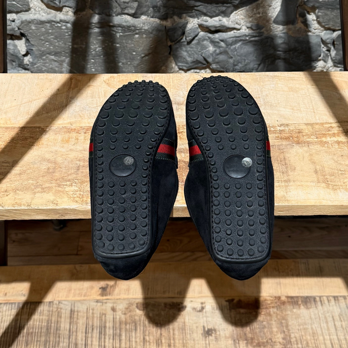 Suède noir avec une bride style penny sur le dessus. Détail Web vert et rouge sur les côtés. Surpiqûres visibles le long de l’empeigne. Bout arrondi. Semelle intérieure en cuir camel. Semelle extérieure à picots en caoutchouc offrant une adhérence optimale. Faits en Italie. Livrés avec la boîte d’origine, les cartes, la preuve d’achat et un sac poussière Gucci. Achetés dans un magasin d’entrepôt Gucci.